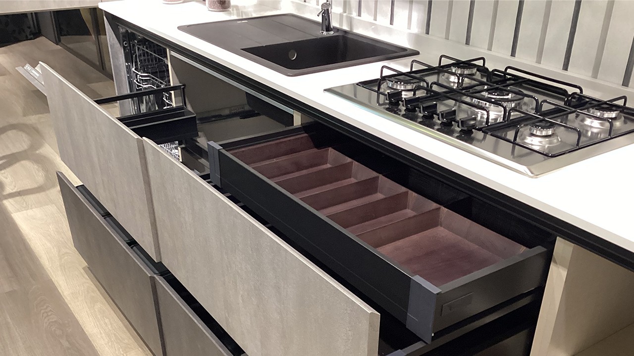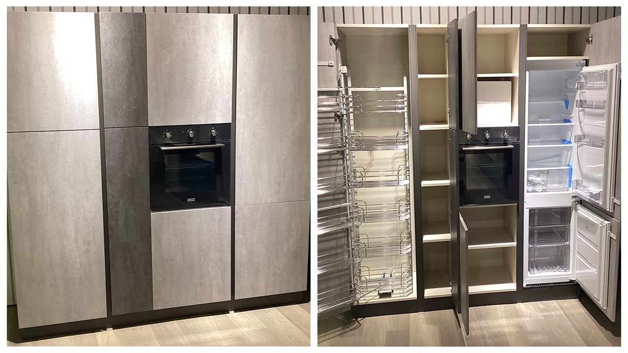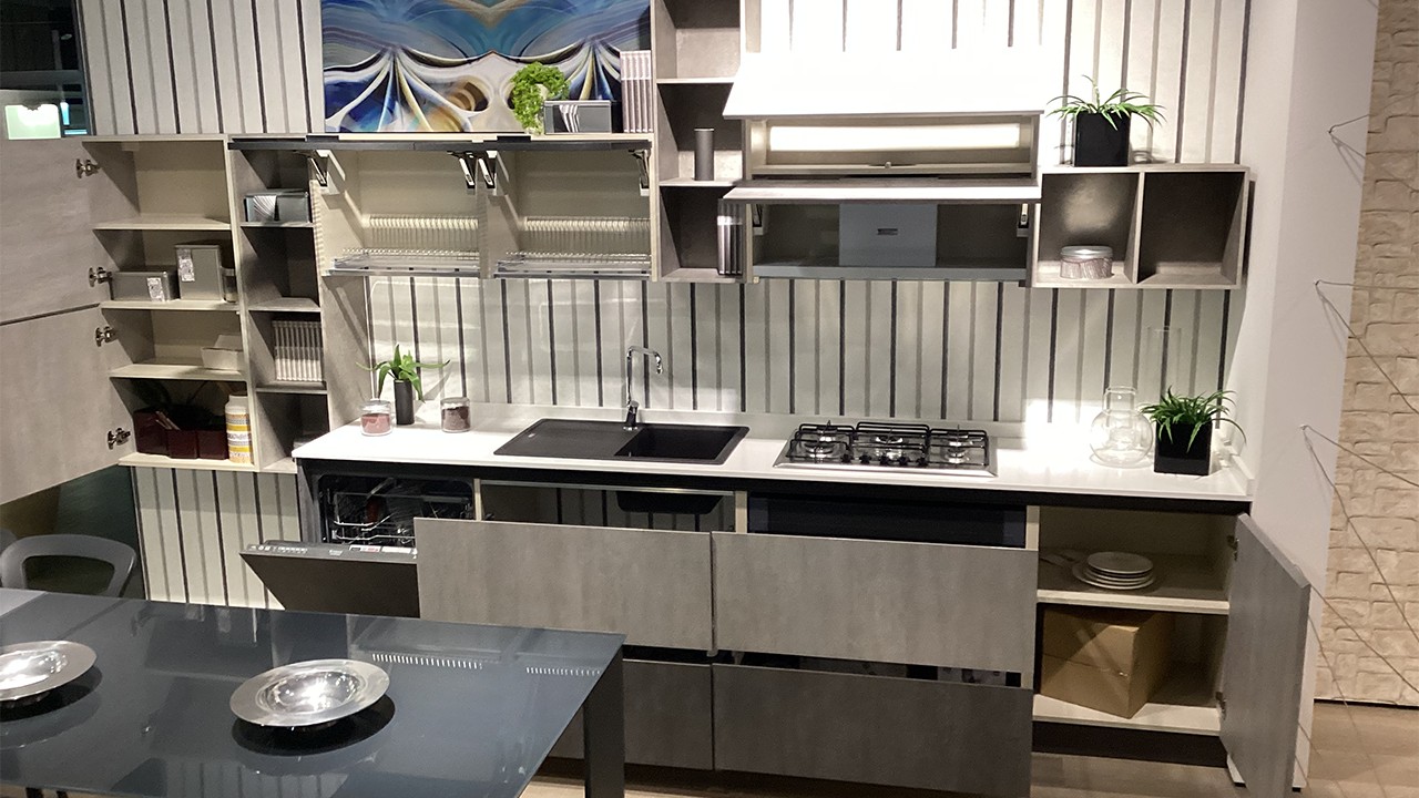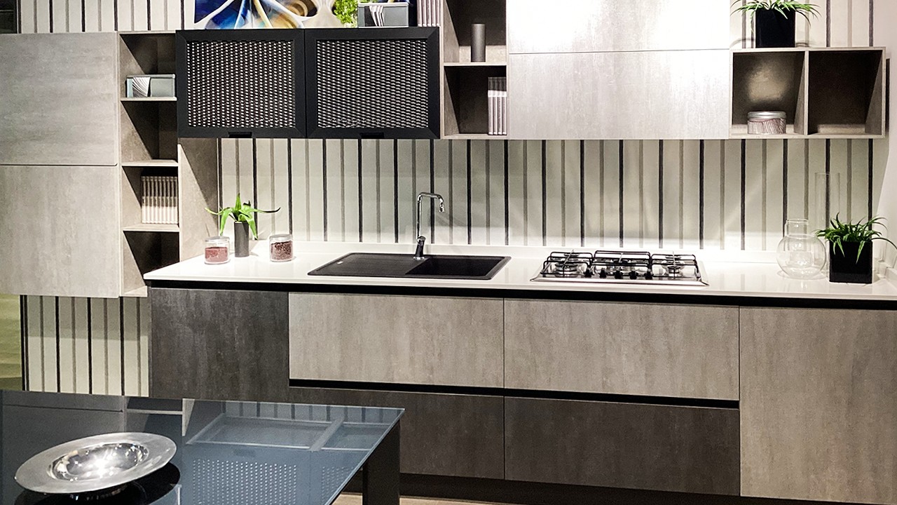 Cucina in promozione modello Zen firmata Mobilturi disponibile all'interno dello Store di Cerignola nelle finiture argento cemento lavagna cemento con piano lavoro h. 2 in quarzo, dettaglio ante con telaio in alluminio anodizzato nero e griglia in alluminio, cestello estraibile a colonna.