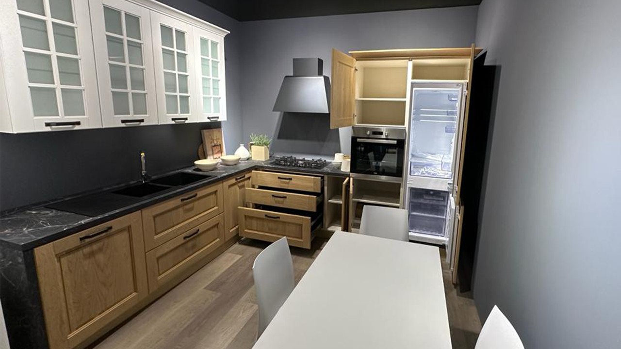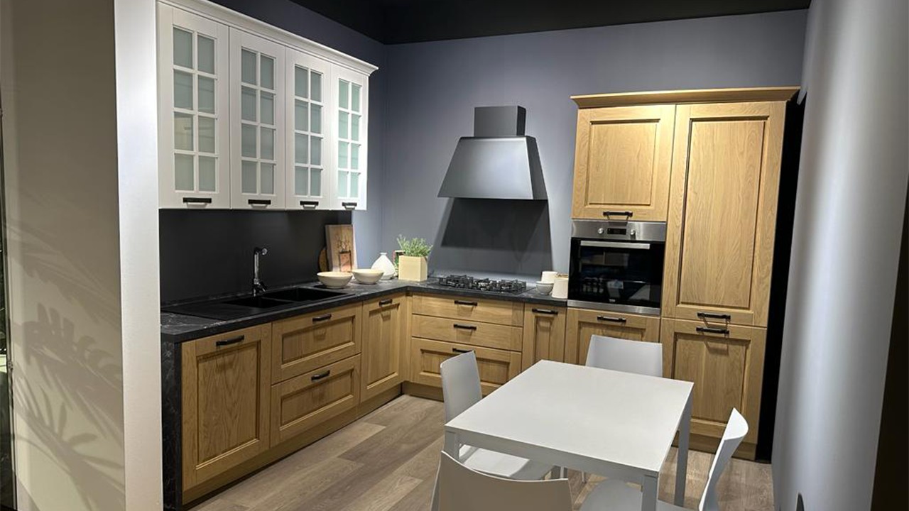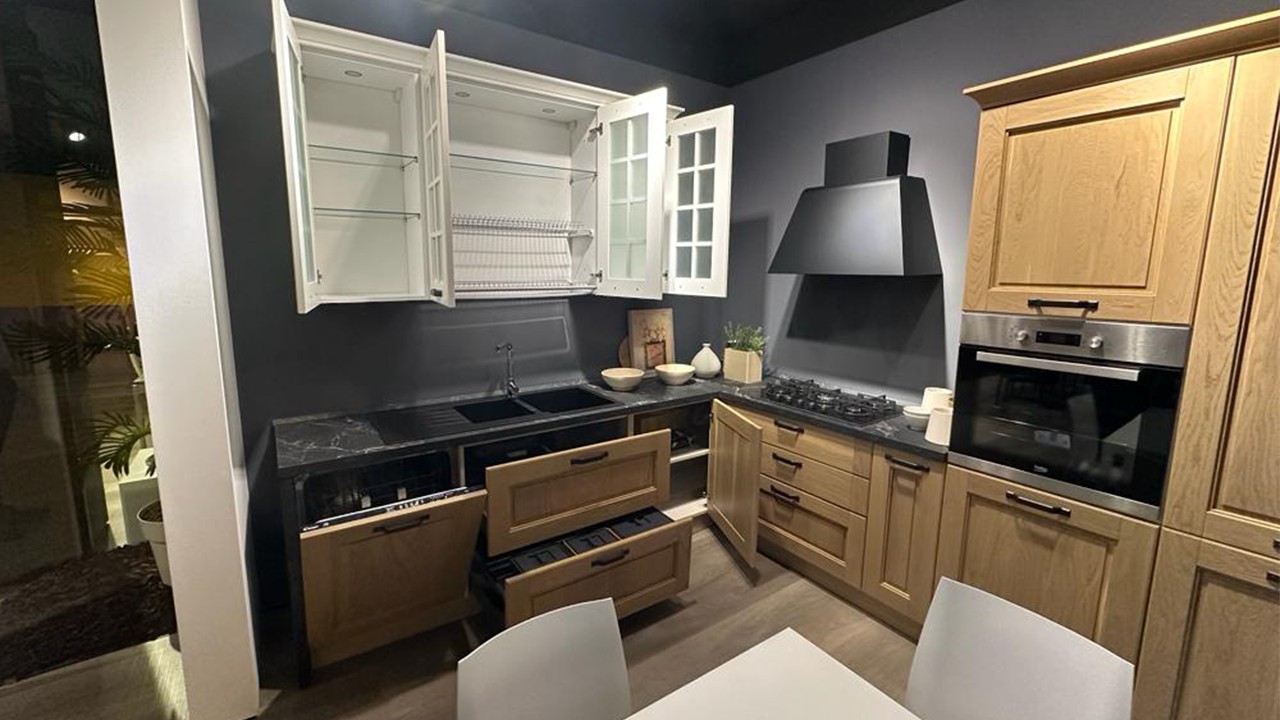 Cucina angolare Aisha firmata Mobilturi in finitura massello rovere naturale per basi e colonne e massello bianco frassino per i pensili, completa di elettrodomestici Beko.