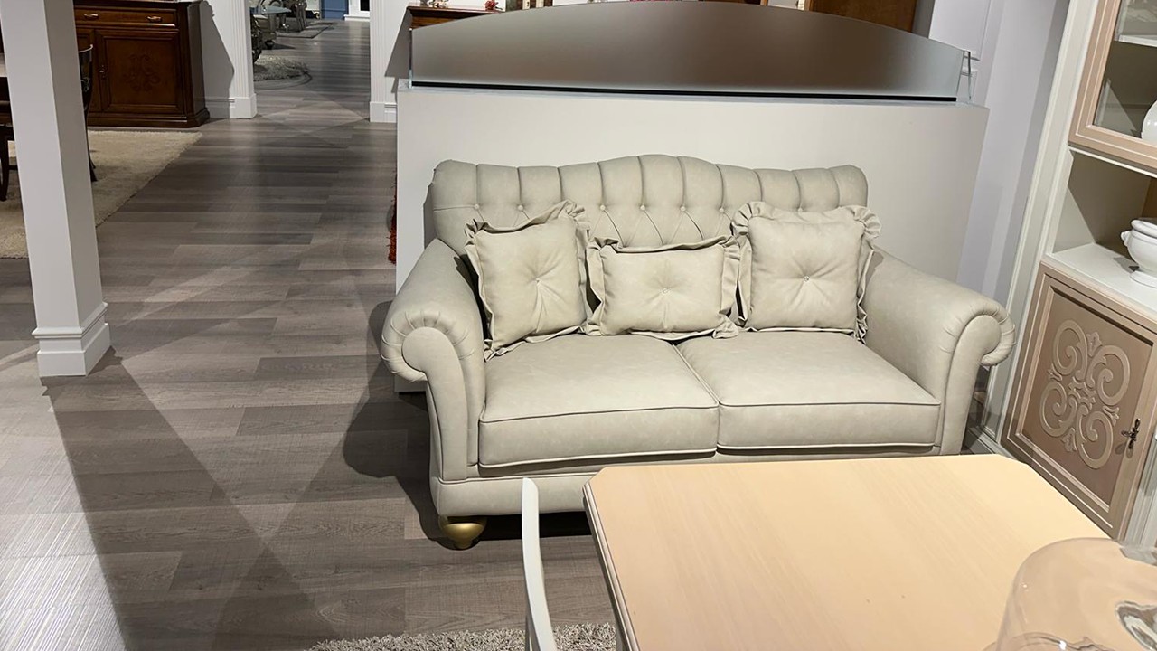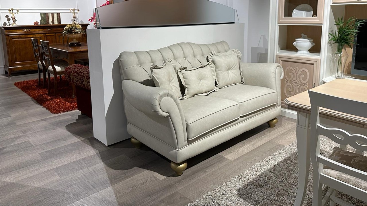 Divano classico 2 posti maxi in ecopelle color tortora completo di cuscini di bellezza e piedi a cipolla color oro.