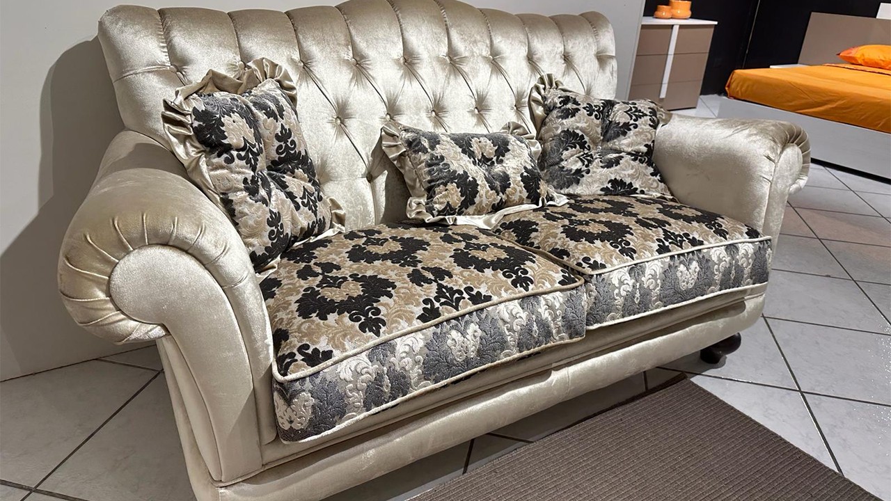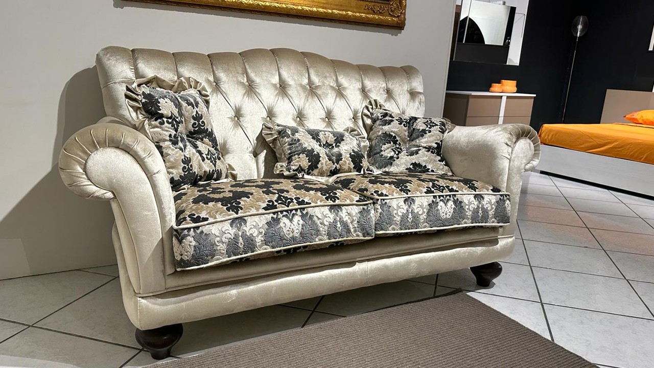 Divano classico disponibile all'interno dello Store di Modugno (Ba) due posti fisso con struttura rivestita in velluto color tortora con schienale e cuscini di seduta rivestiti in tessuto damascato completo di cuscineria con punto luce. Correlato di piedi a cipolla color moca