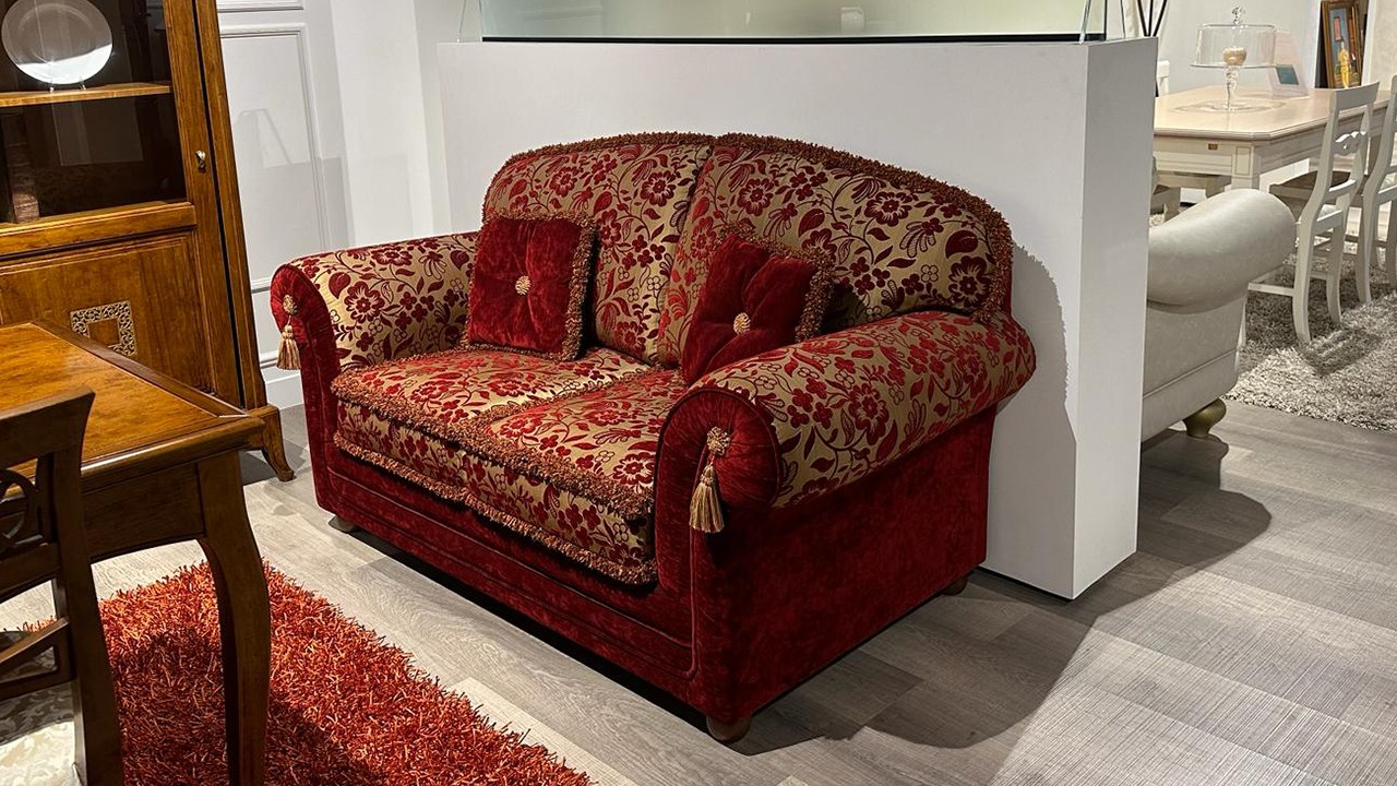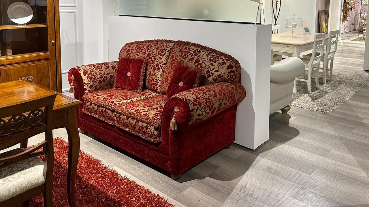 Disponibile all'interno dello Store di Cerignola (FG) divano classico rivestito in tessuto damascato oro e rosso con particolari in velluto completo di cuscini di bellezza e piedi a cipolla noce.