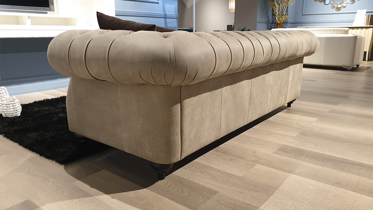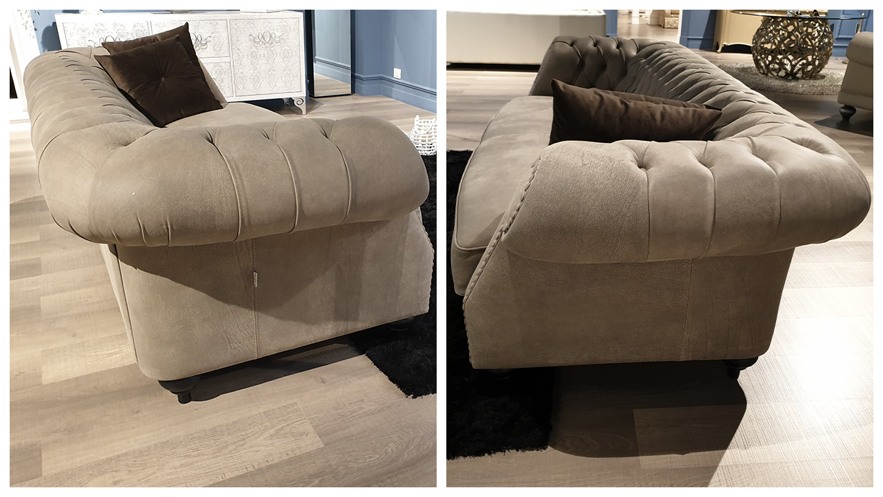 Divano contemporaneo rivestito in pelle con lavorazione chester tutto rivestito in pelle spessorata grigio chiaro con piedini a cipolla neri.