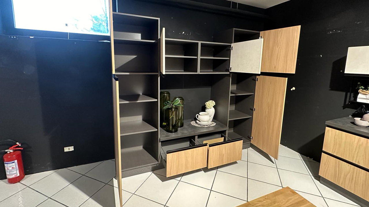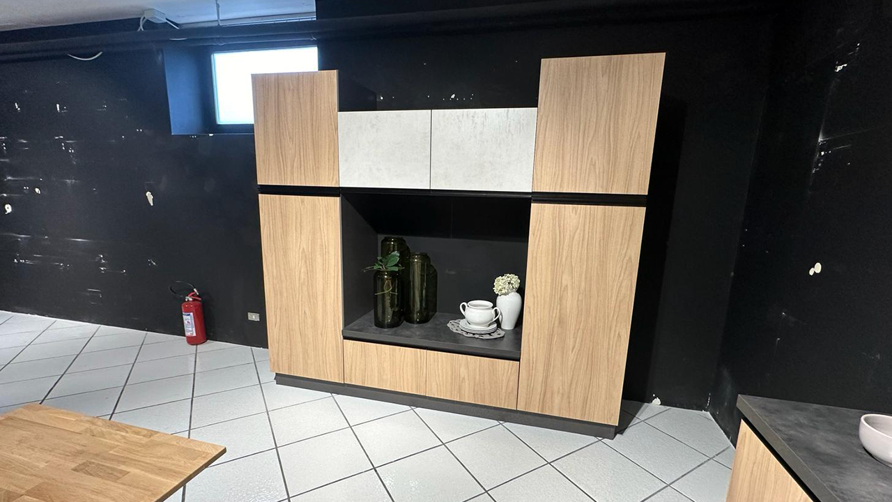 Disponibile all'interno dello Store di Modugno (Ba), living modello Era firmato Net Cucine realizzato nelle finiture rovere miele e urban avorio con maniglia integrata sul bordo superiore dell’anta nel colore nero ossidato.
