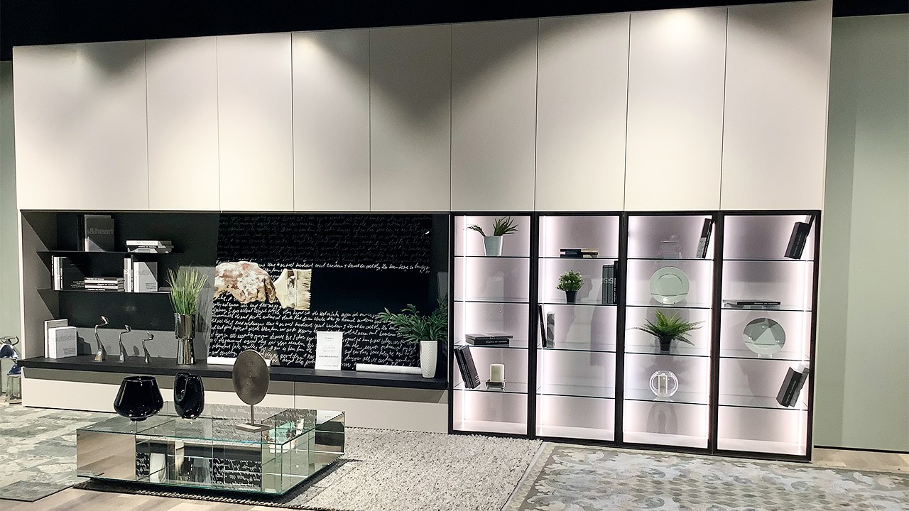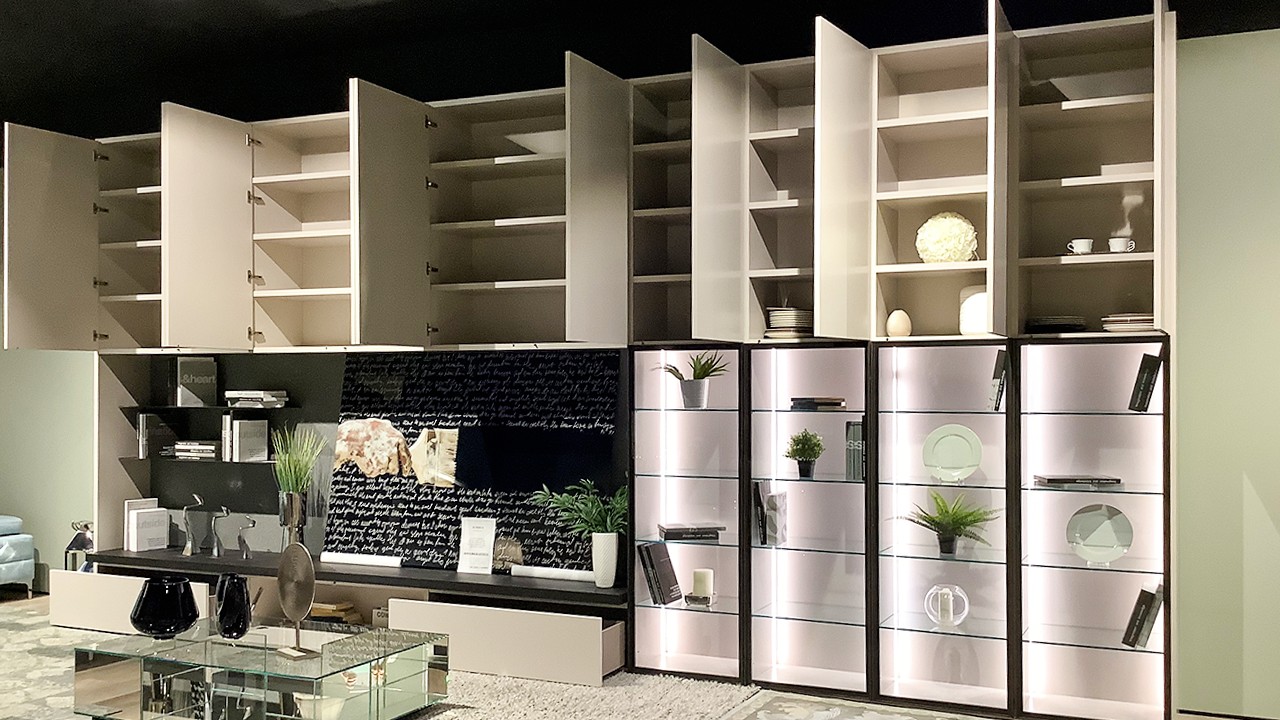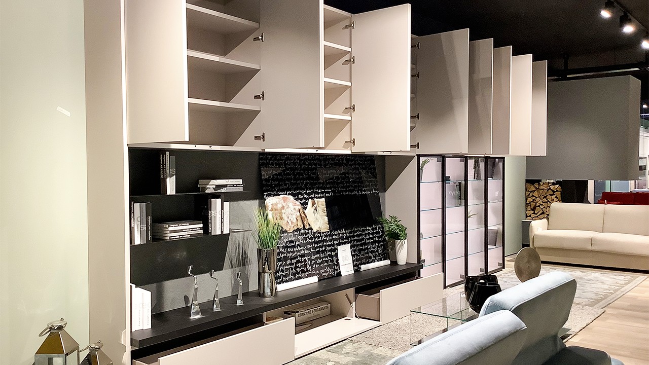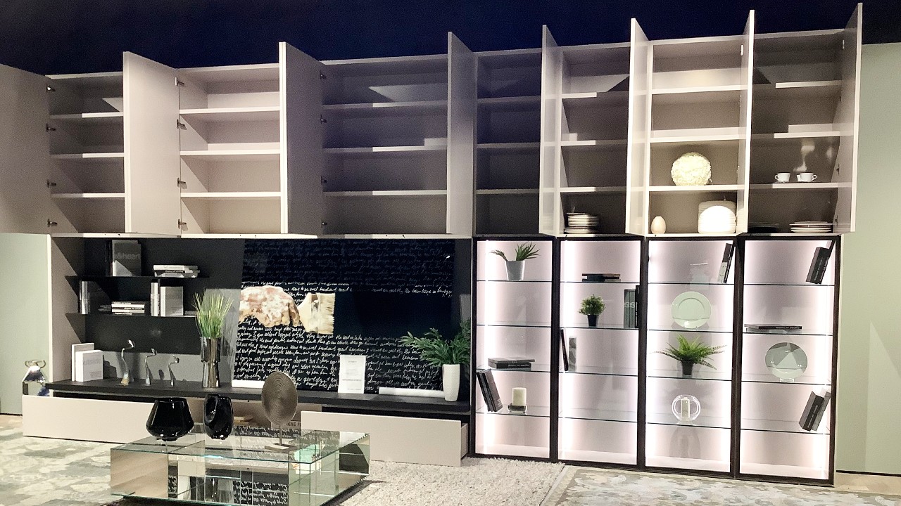 Disponibile all'interno dello Store di Cerignola (FG) , parete modello MOOD firmata La Casa Moderna nelle finiture laccato magnolia opaco con piano in impiallacciato di rovere carbone e schienali in finitura marmo scuro piasentino.