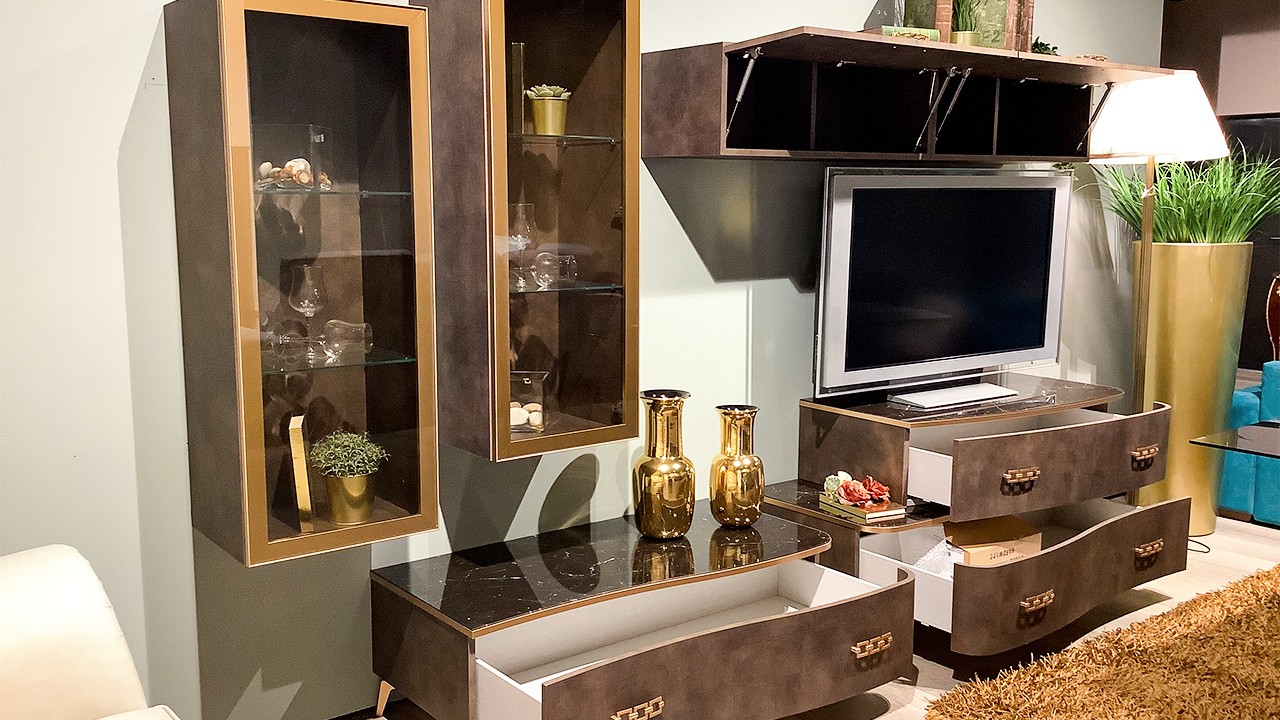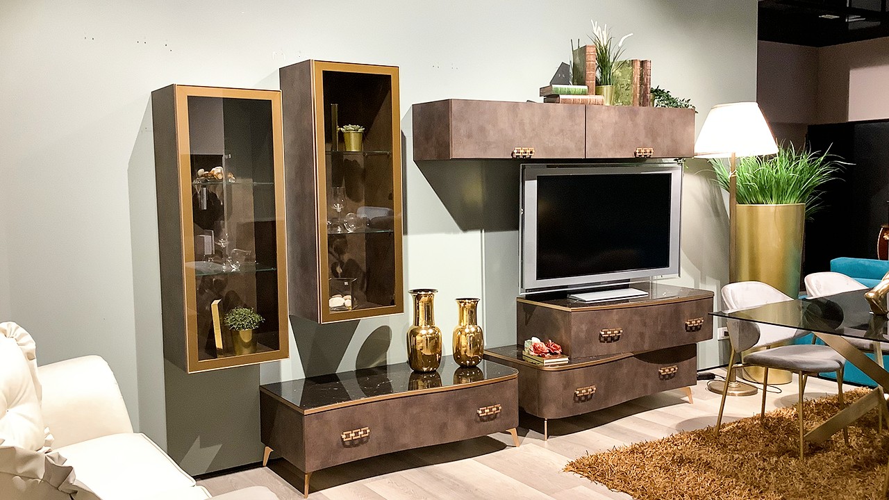 Parete modello Gold della collezione DELUXE firmata Spar, disponibile all'interno dello Store di Modugno (BA) nella finitura pelle brown con particolari in finitura oro e vetro nero.