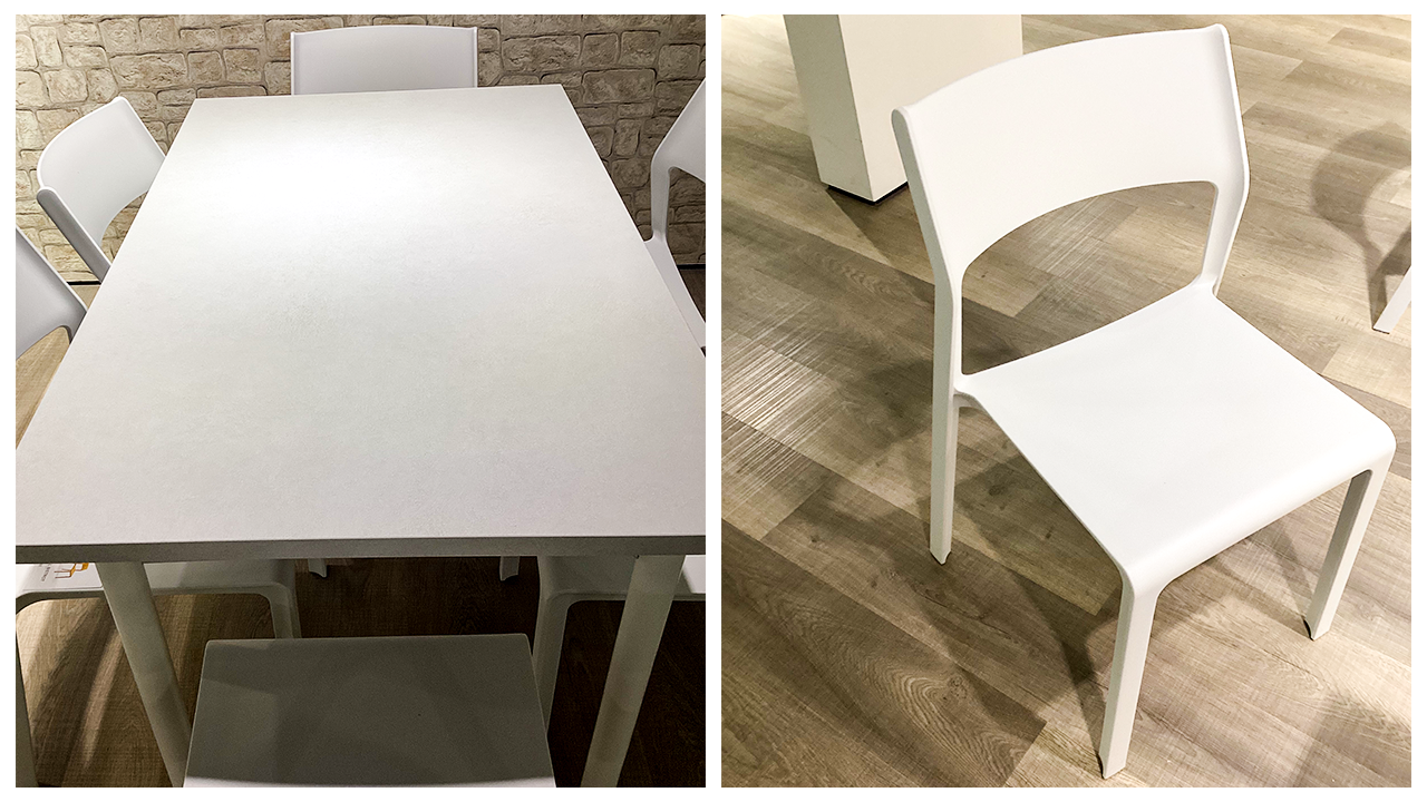 Tavolo da cucina rettangolare allungabile con gambi bianchi e piana in finitura ghiaccio cemento completo di sei sedie in polipropilene bianche.