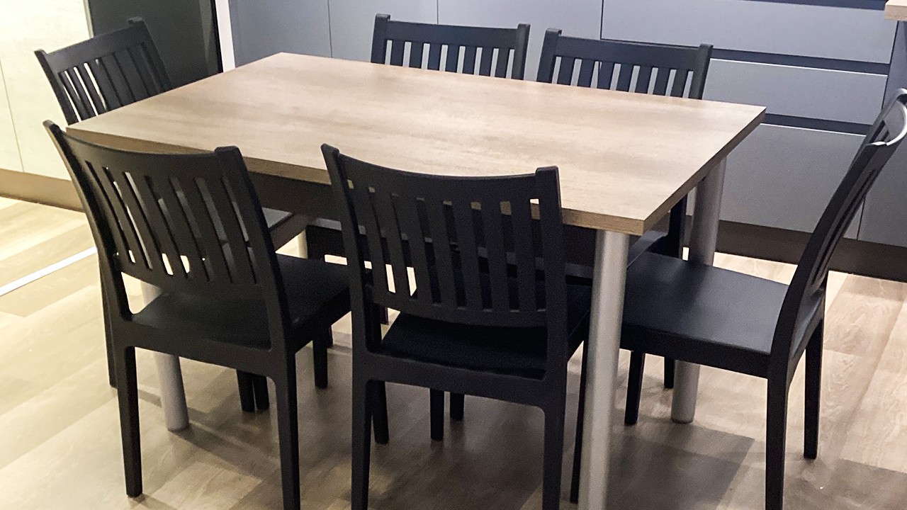 Tavolo rettangolare allungabile 130 x 80 cm allungabile piano finitura rovere canyon e gambe in metallo con 6 sedie in polipropilene antracite.