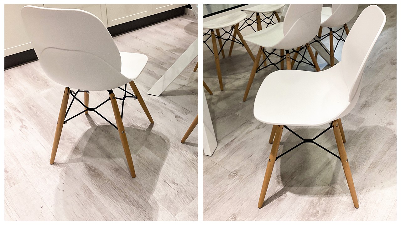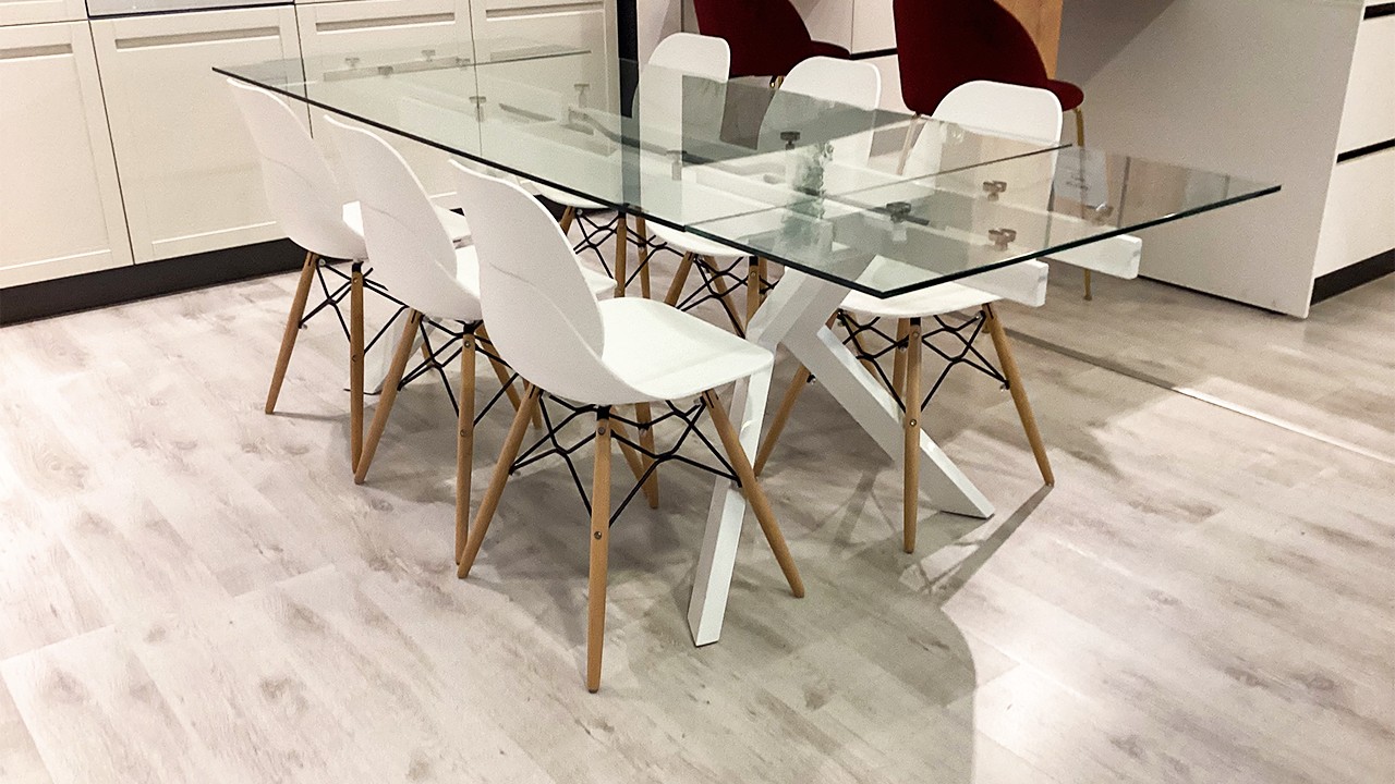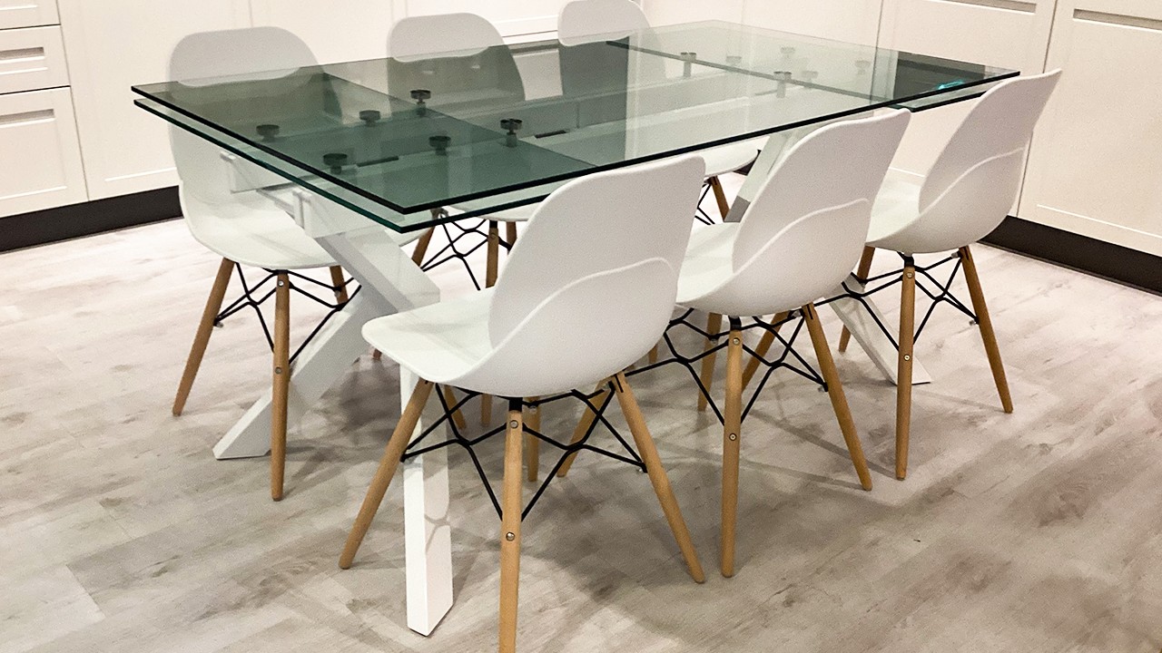 Tavolo rettangolare allungabile con gambi in metallo verniciati bianchi con piana in vetro trasparente temperato completo di sedie in polipropilene con gambe in faggio naturale .