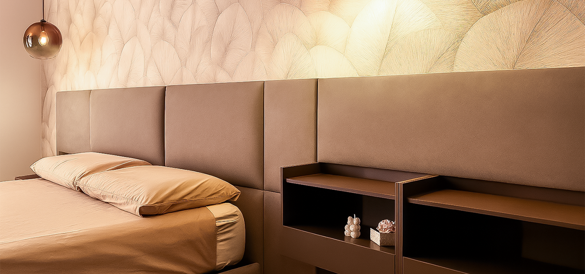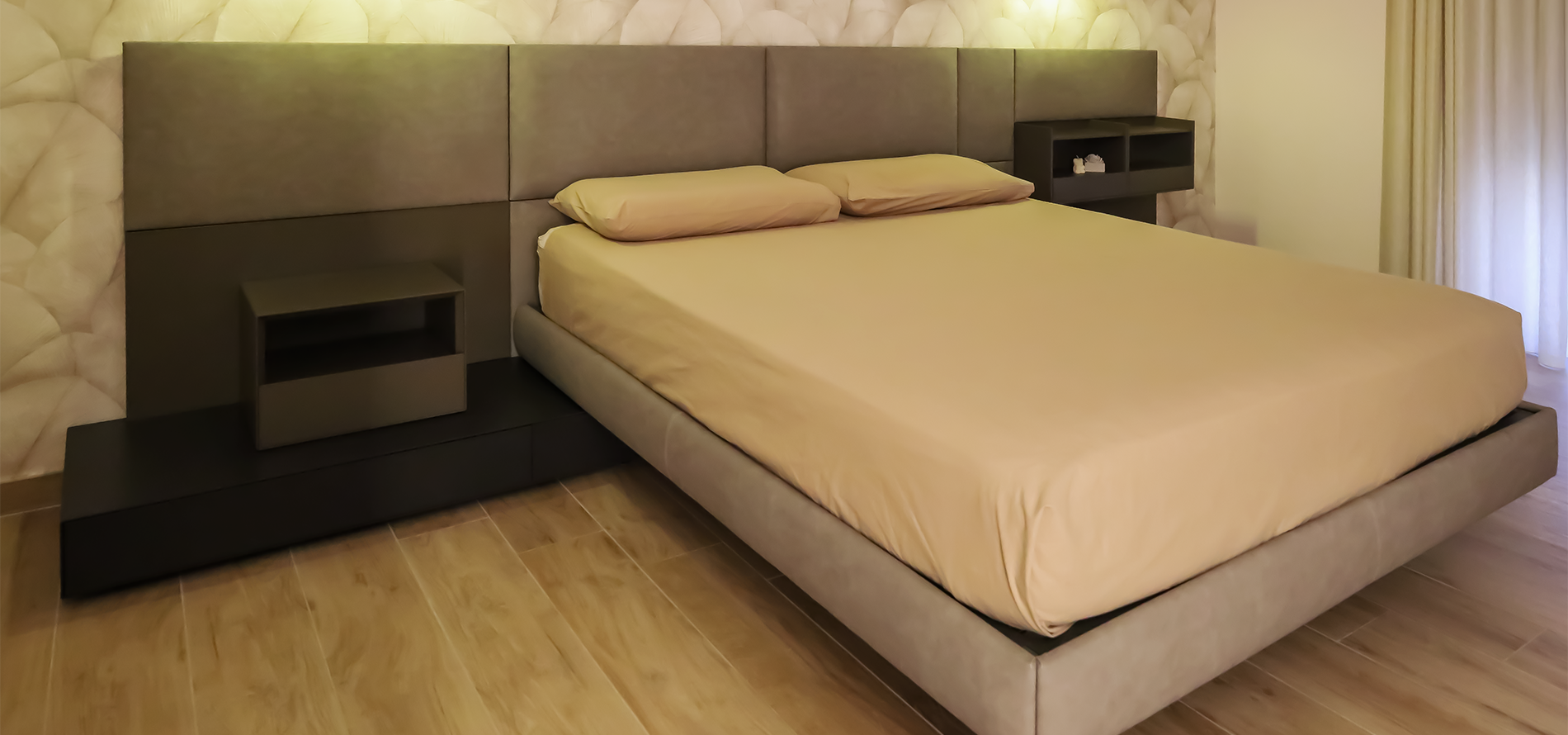 Il letto, con testata in ecopelle e comodini integrati, unisce design e praticità.