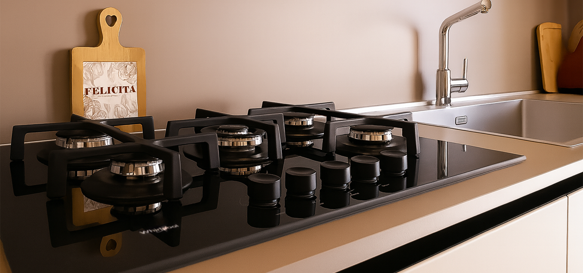 La cucina, con frontali in vetro satinato, resta autonoma ma legata al soggiorno, cuore pulsante dell’abitazione.