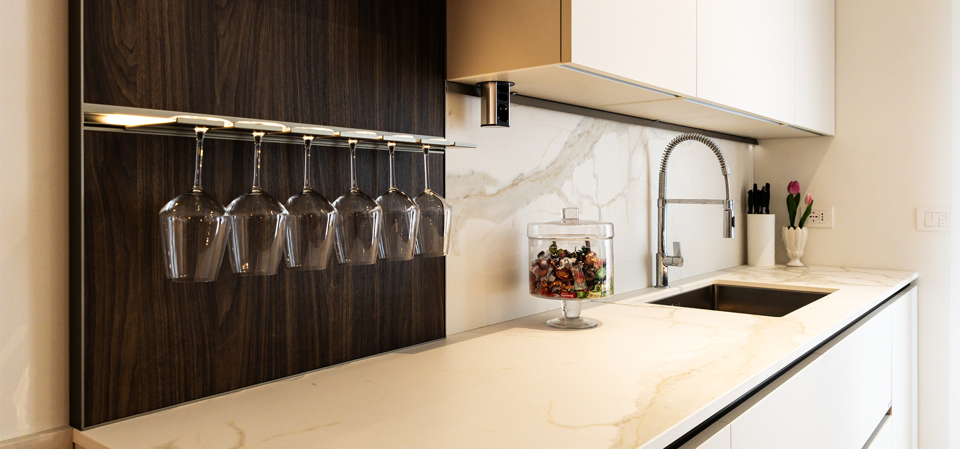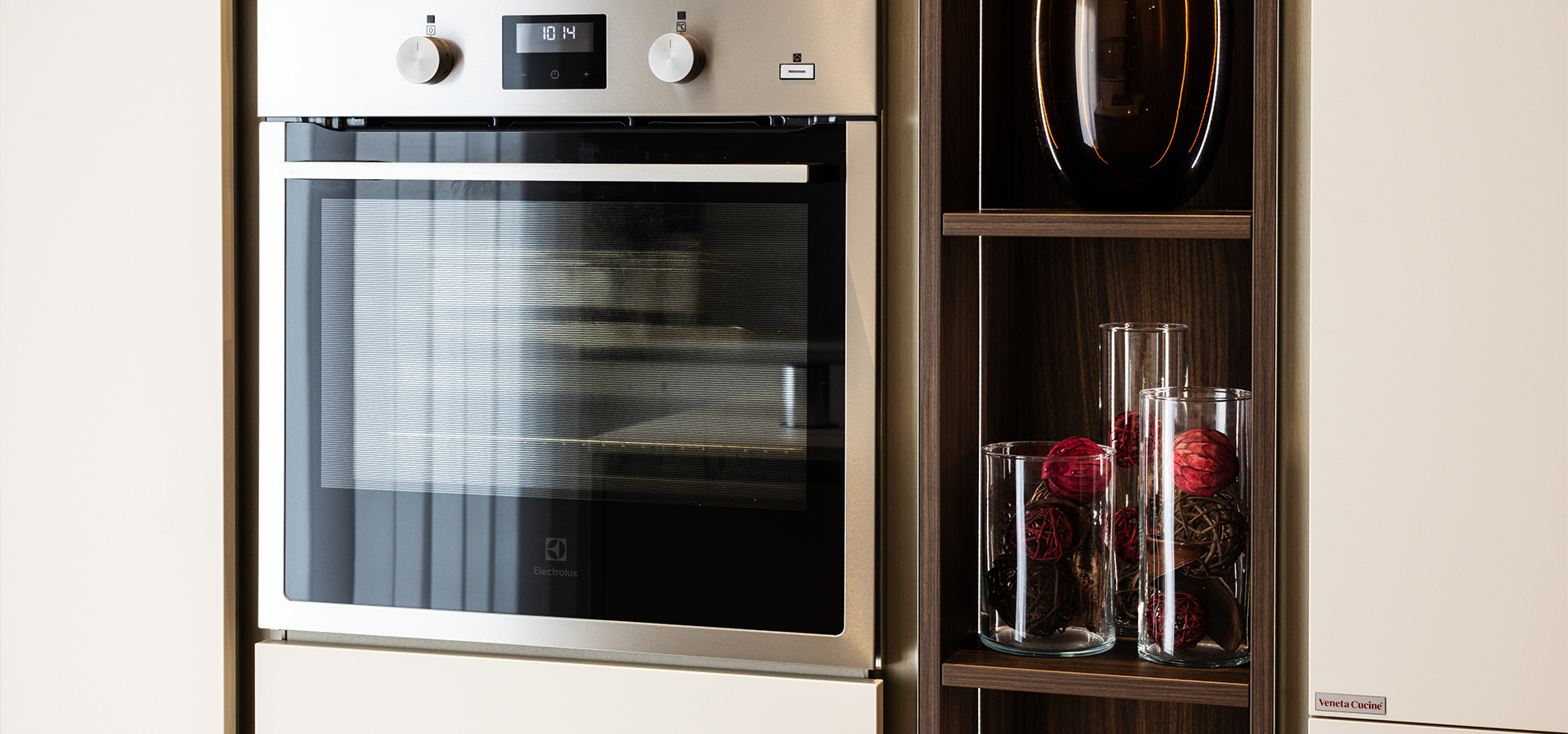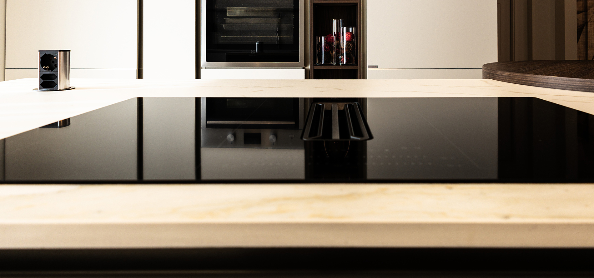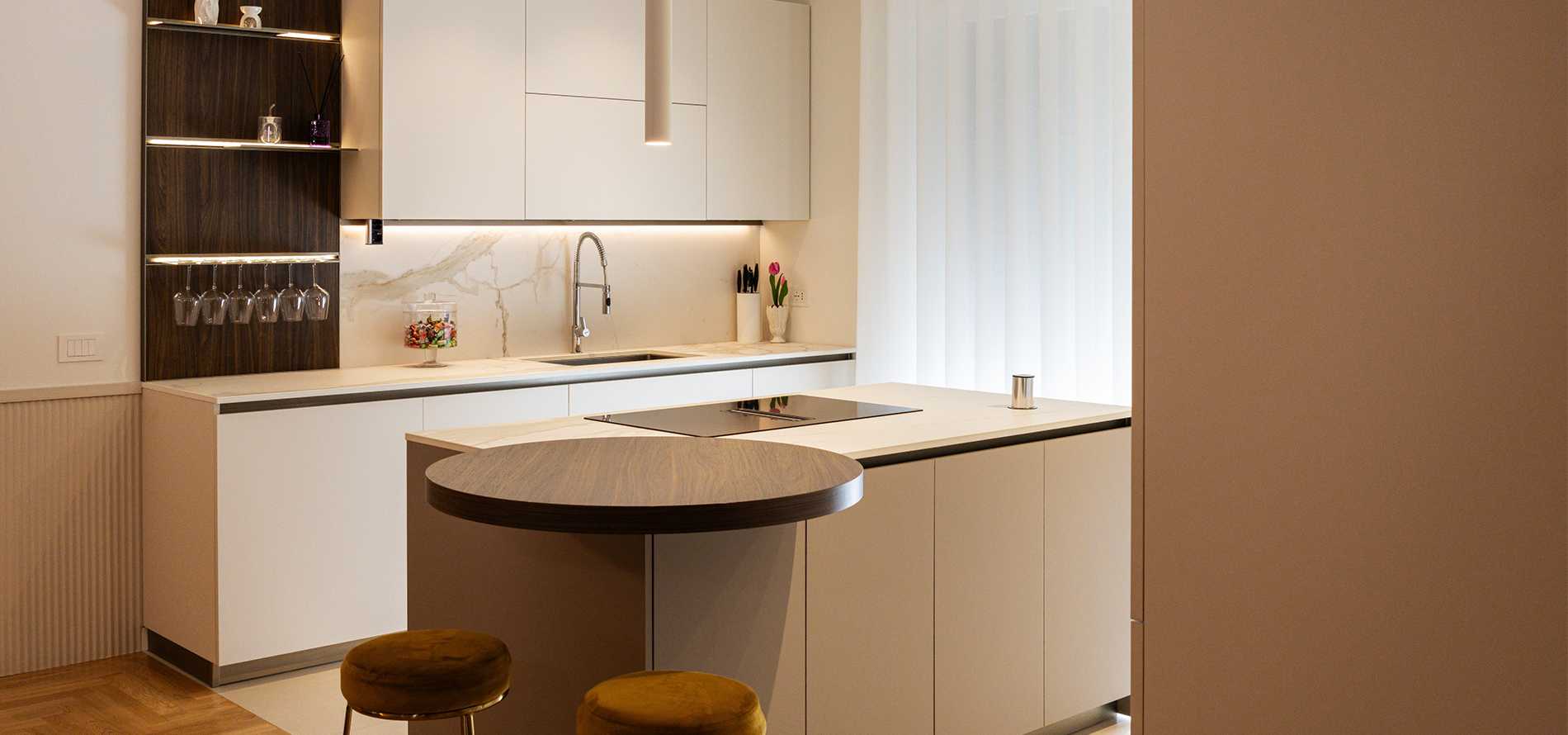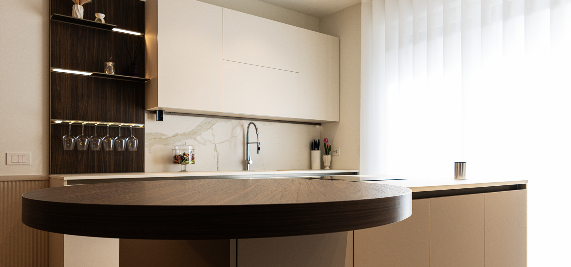 Un elemento distintivo del progetto è la cappa integrata nel piano cottura, scelta progettuale voluta dall’architetto per garantire una pulizia visiva delle linee e mantenere l’ambiente leggero e minimale, senza elementi sospesi che interrompano la continuità dello spazio.