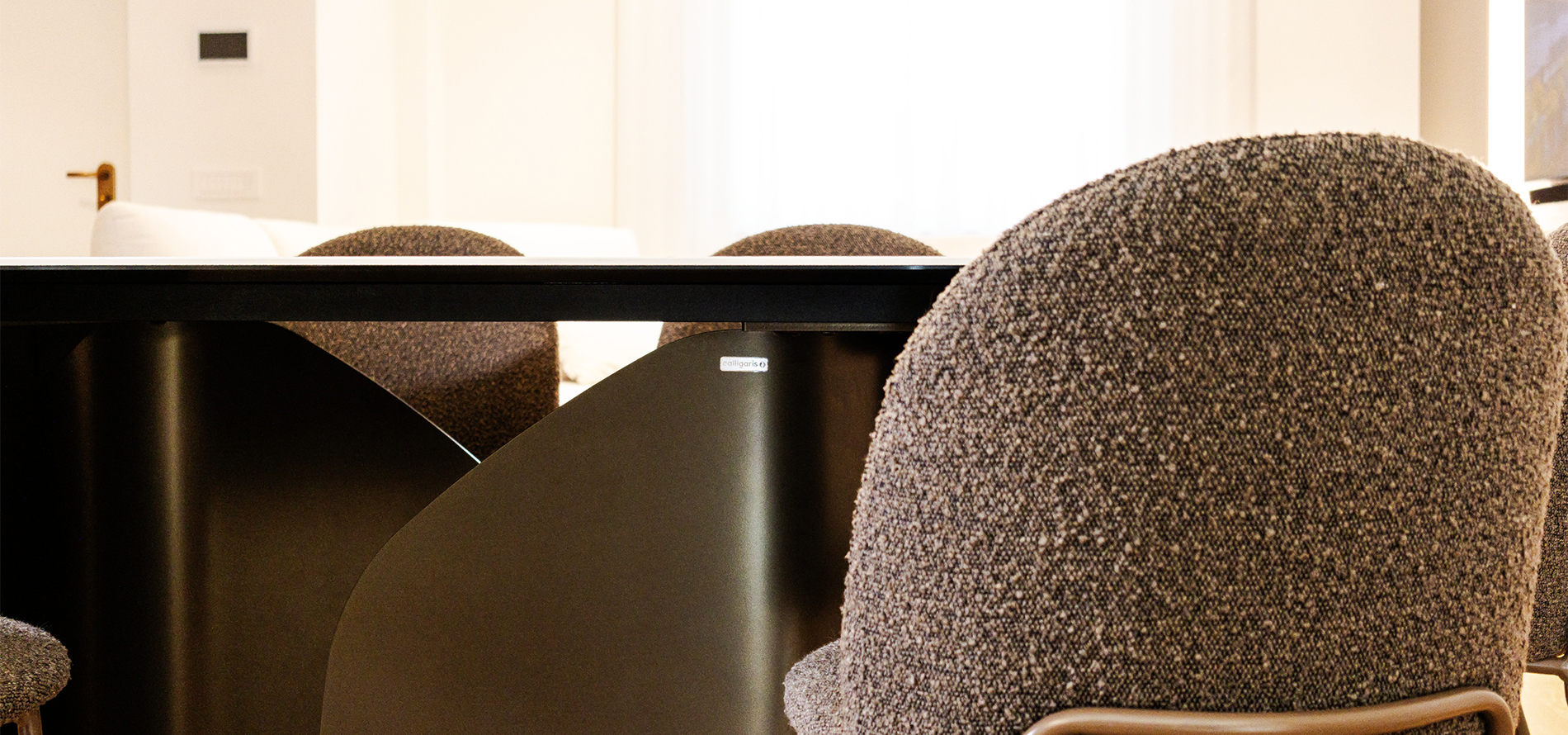 Accanto alla cucina, abbiamo realizzato un living minimale, dove forme semplici e materiali naturali creano un’atmosfera di equilibrio e benessere. Al centro dello spazio si distingue il tavolo Calligaris modello Twins, con la sua linea contemporanea e la doppia base scultorea, perfetto connubio tra funzionalità e design.