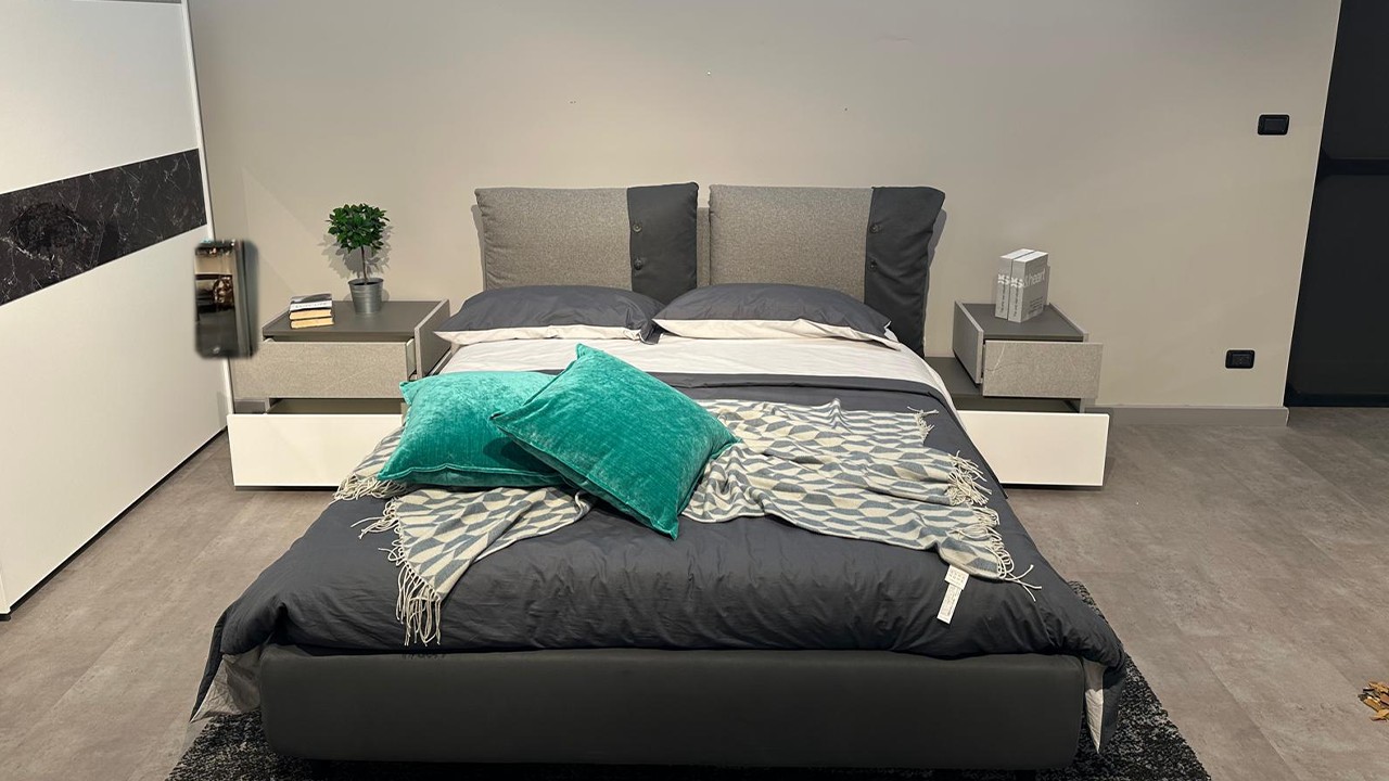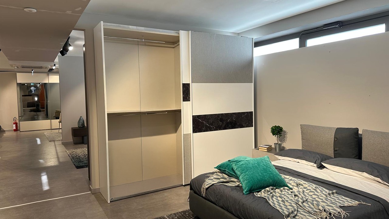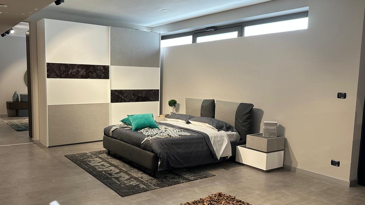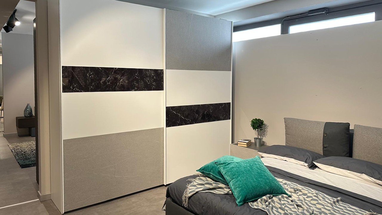Camera bianca e grigio pietra chiaro e scuro composta da un armadio due ante scorrevoli ed inserti vetro nero marquinia e grigio ardesia chiara, comodini con cassetto bianco opaco e grigio ardesia chiara, comò grigio ardesia chiara e ardesia scuro.