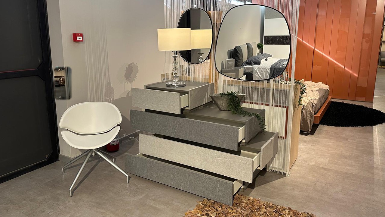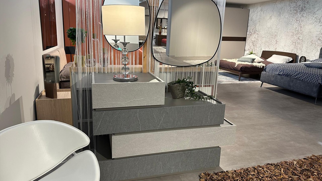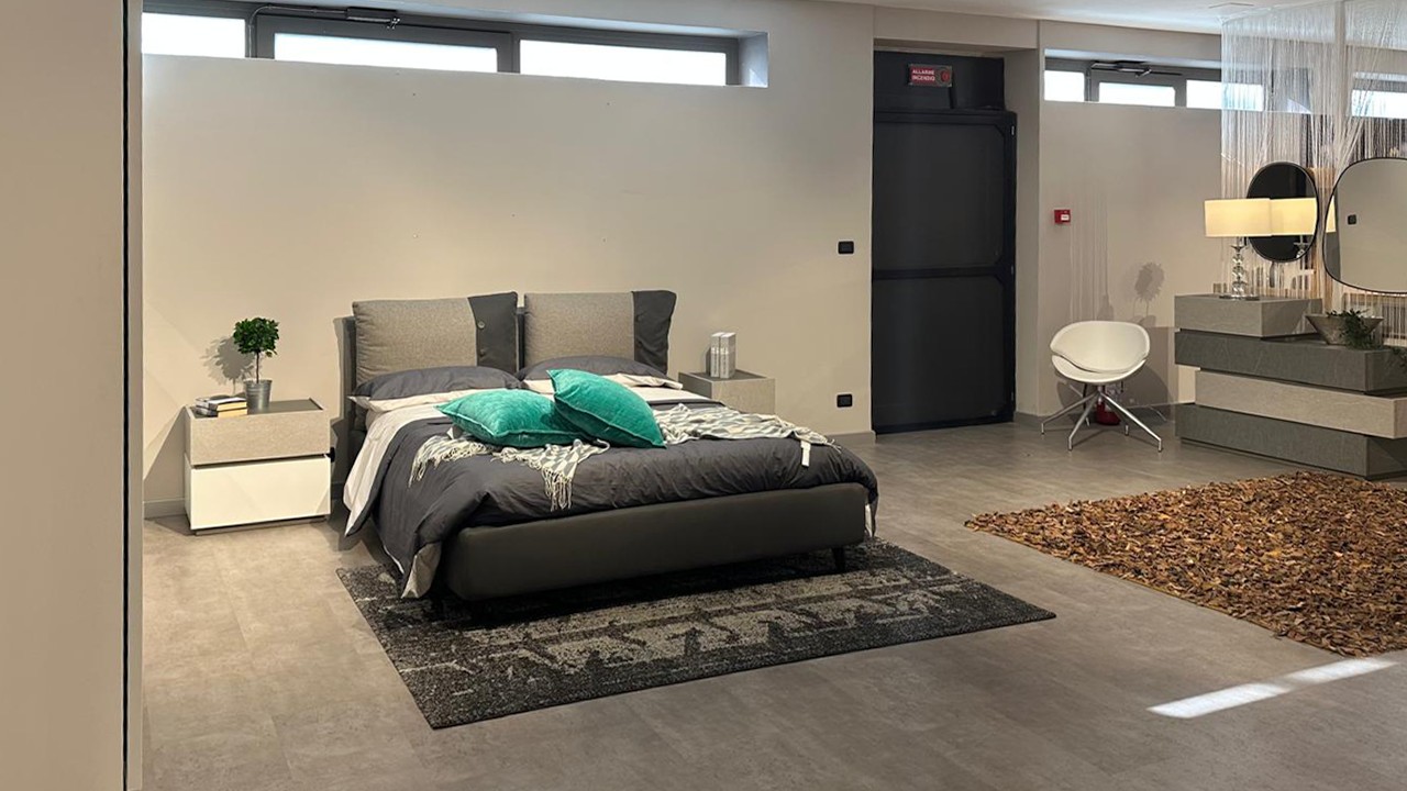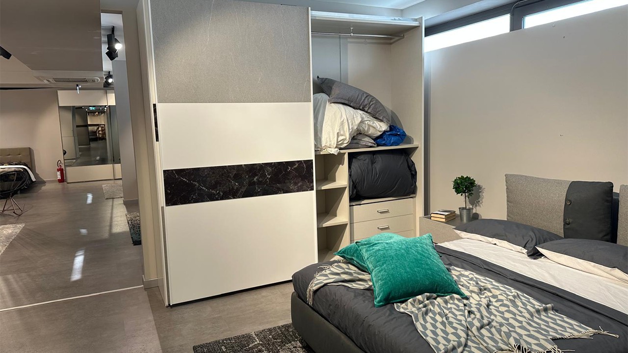 Camera bianca e grigio pietra chiaro e scuro composta da un armadio due ante scorrevoli ed inserti vetro nero marquinia e grigio ardesia chiara, comodini con cassetto bianco opaco e grigio ardesia chiara, comò grigio ardesia chiara e ardesia scuro.