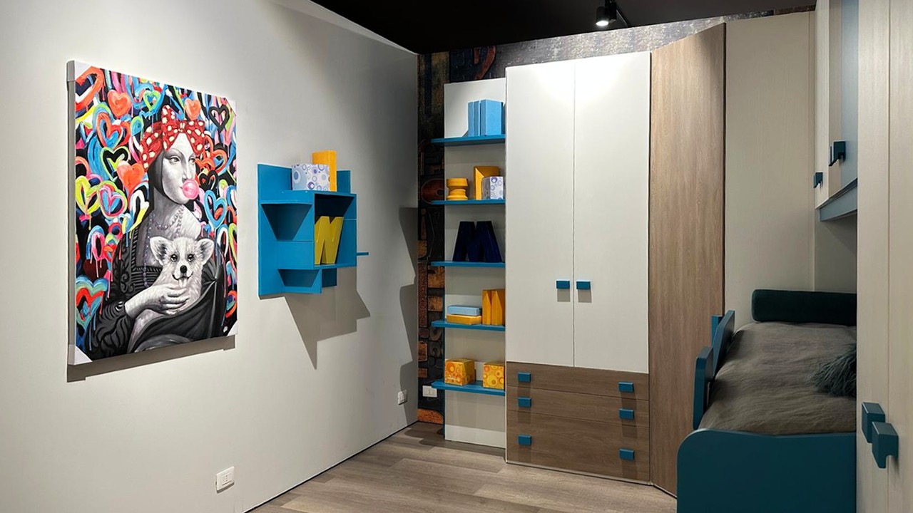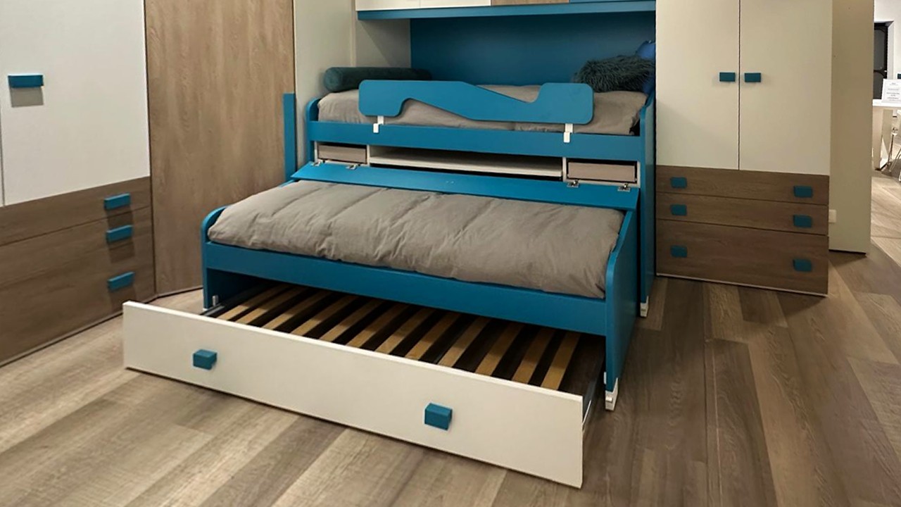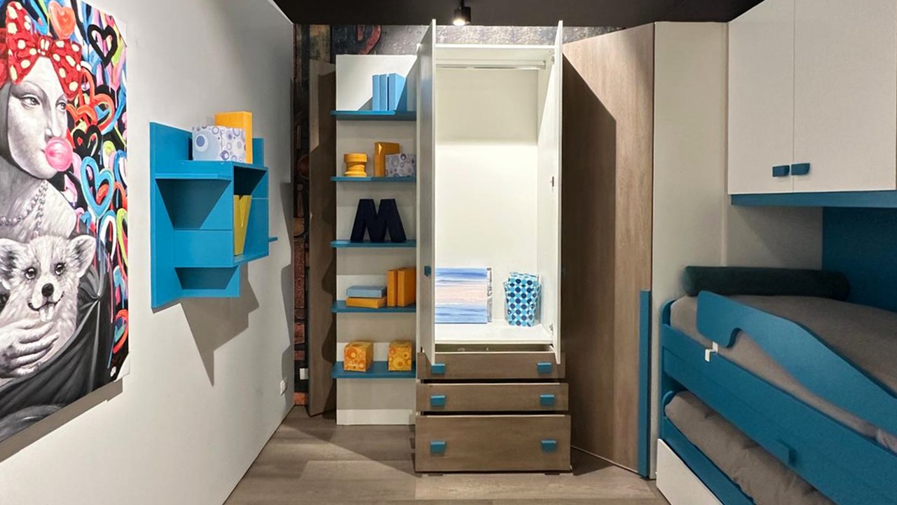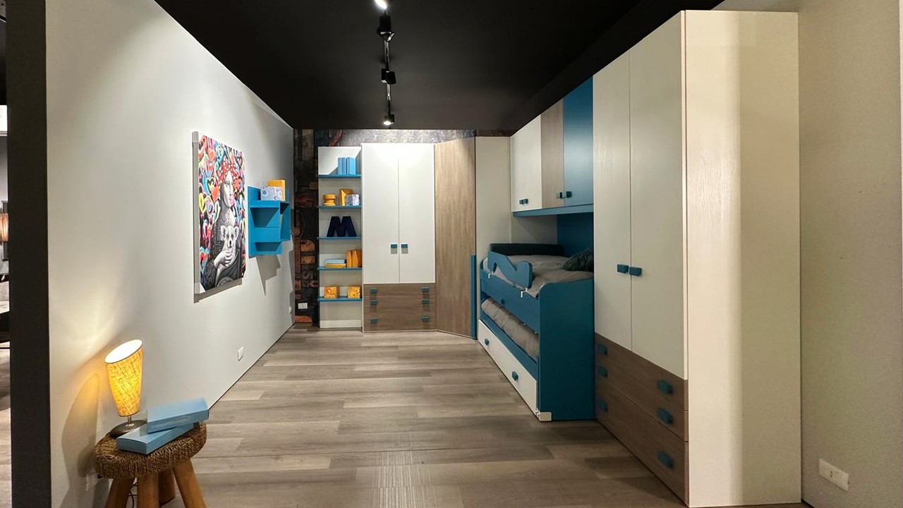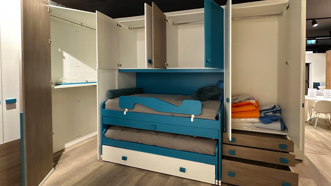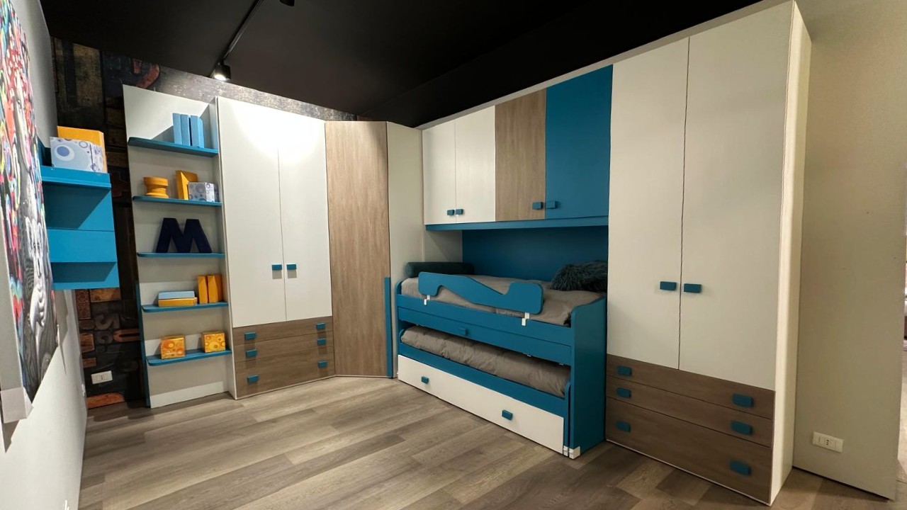 Disponibile all'interno dello Store di Cerignola (Fg), cameretta moderna con armadio angolare e triplo letto e piano estraibile integrato.