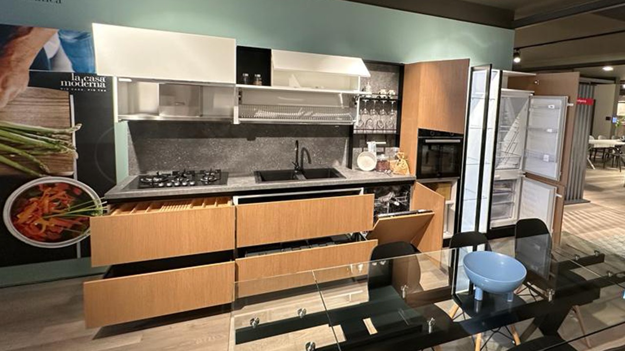 Cucina lineare Pop by Mobilturi in promozione a Cerignola terra rigato e bianco laccato puro.