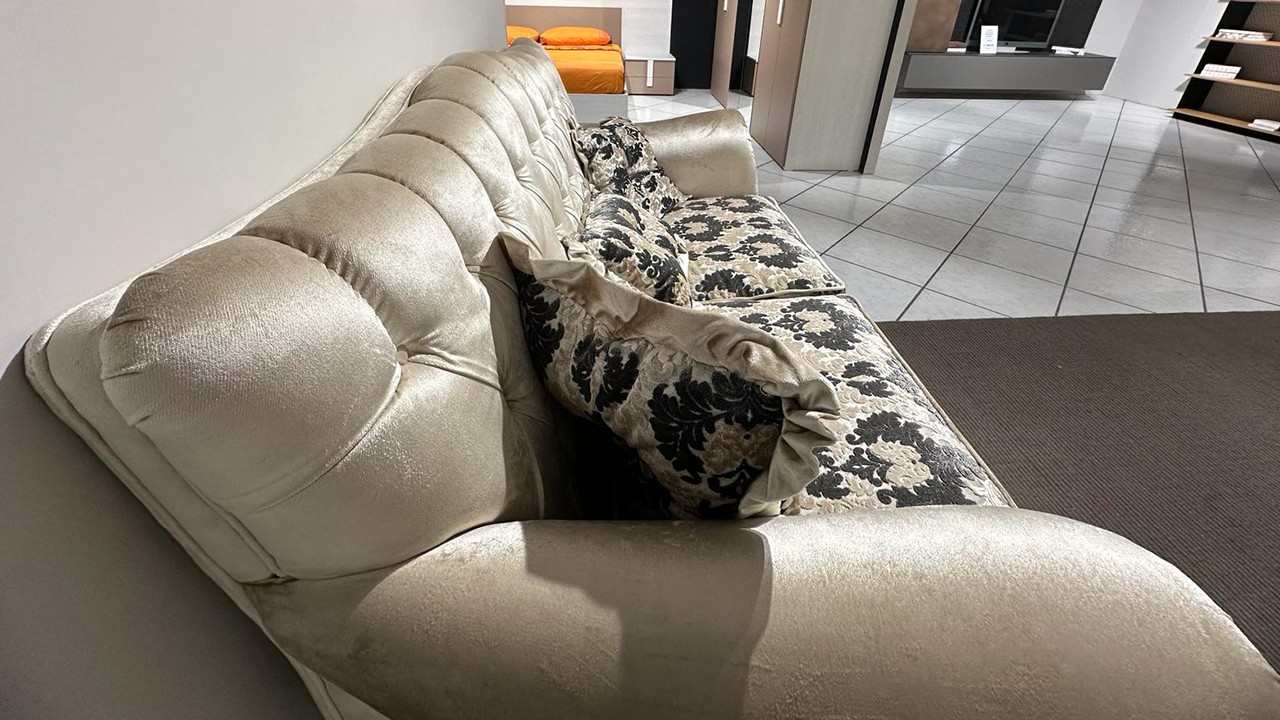 Divano classico disponibile all'interno dello Store di Modugno (Ba) due posti fisso con struttura rivestita in velluto color tortora con schienale e cuscini di seduta rivestiti in tessuto damascato completo di cuscineria con punto luce. Correlato di piedi a cipolla color moca