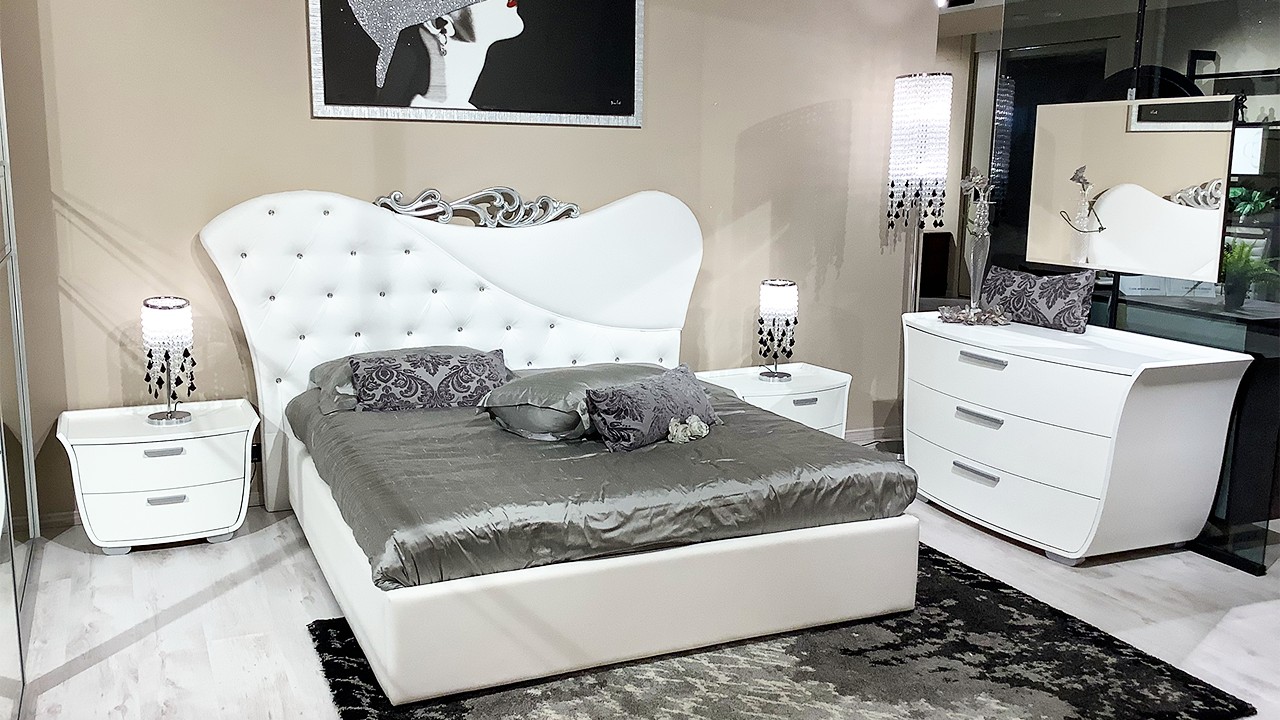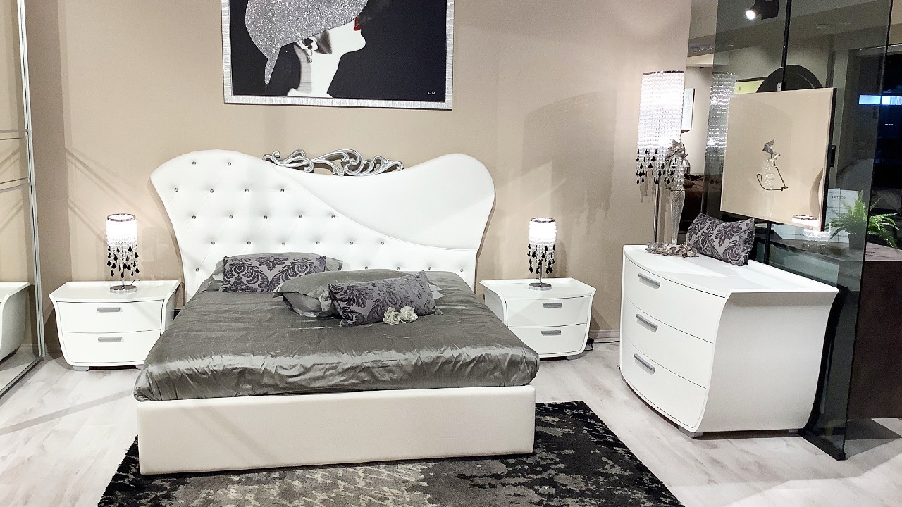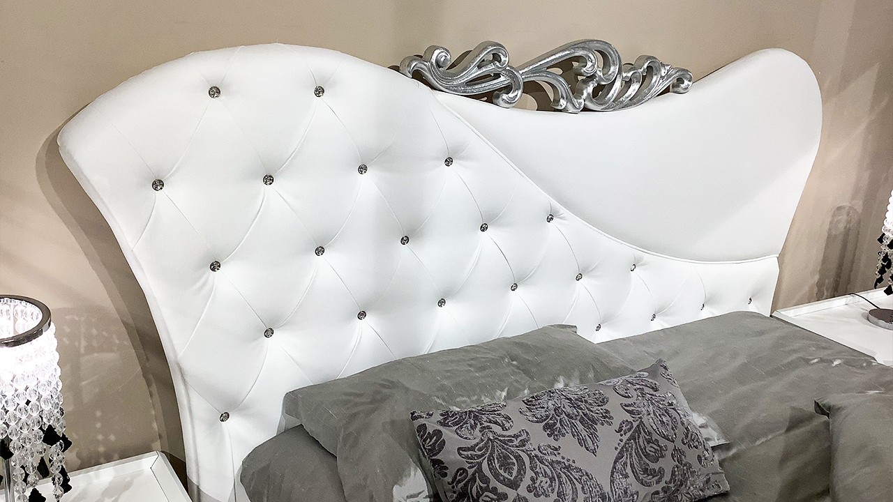 Letto classico contemporaneo fisso in offerta all'interno dello Store di Modugno (Ba) tutto rivestito in ecopelle bianca, con punti luce incastonati nella testiera e particolare in legno foglia argento.