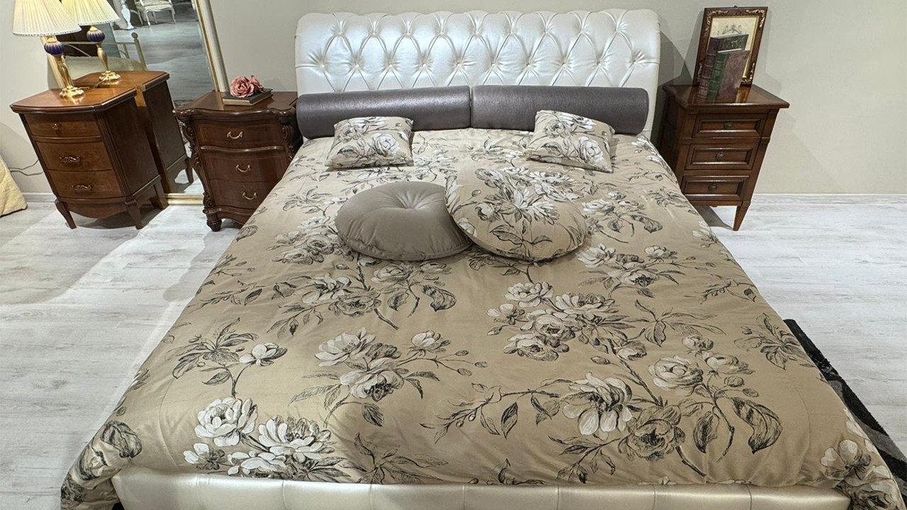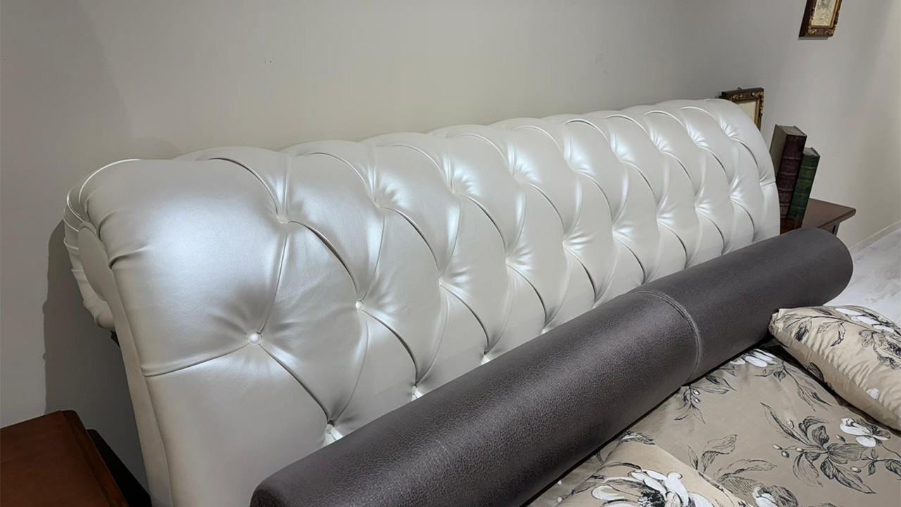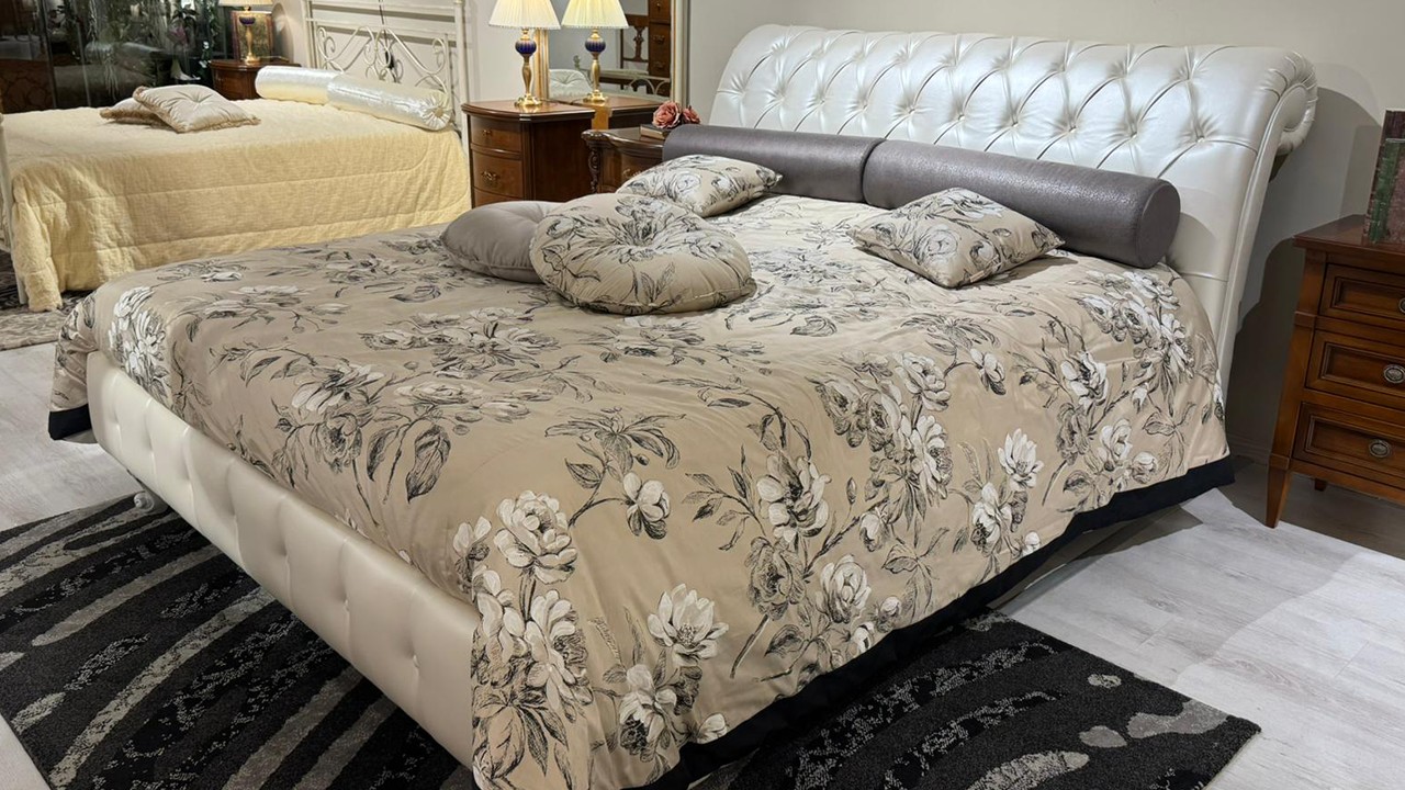 Letto classico matrimoniale Beatrice con lavorazione chester, rivestito in ecopelle bianco perlato e piedi intagliati bianchi decapè argento.