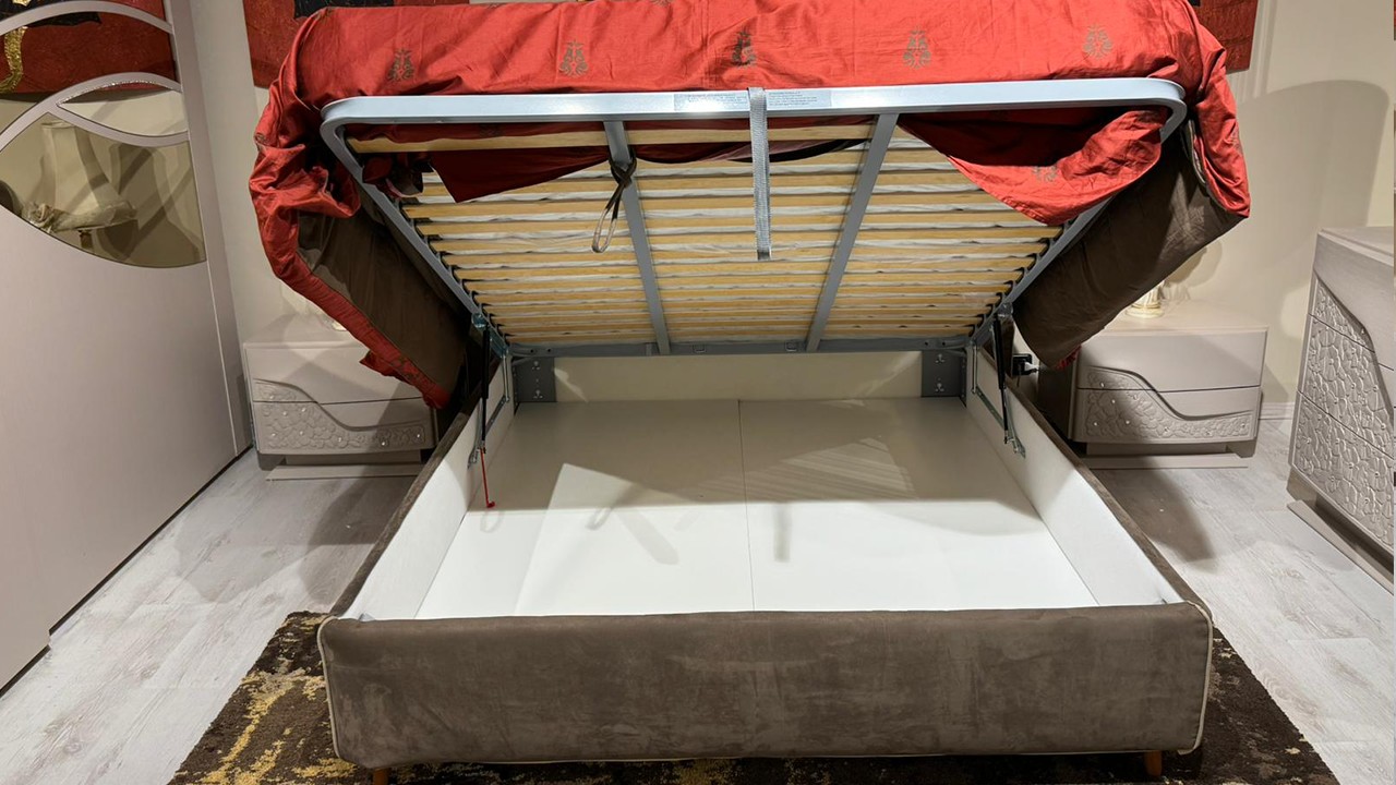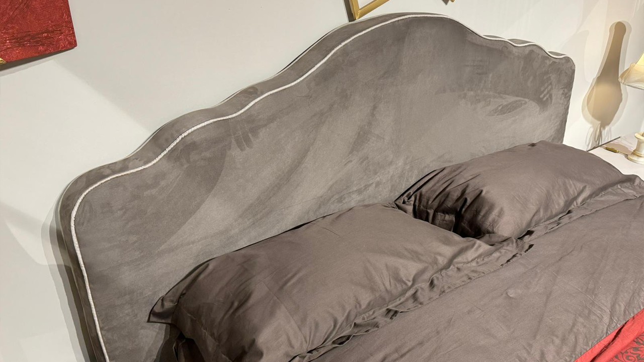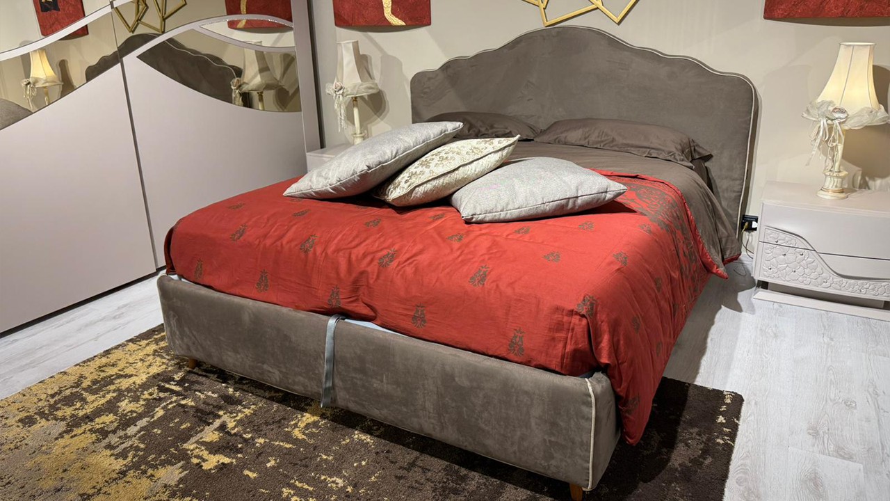 Letto shabby Martina con contenitore, rivetito completamente in tecnofibra tortora con bordino a contrasto beige e piedini color legno.