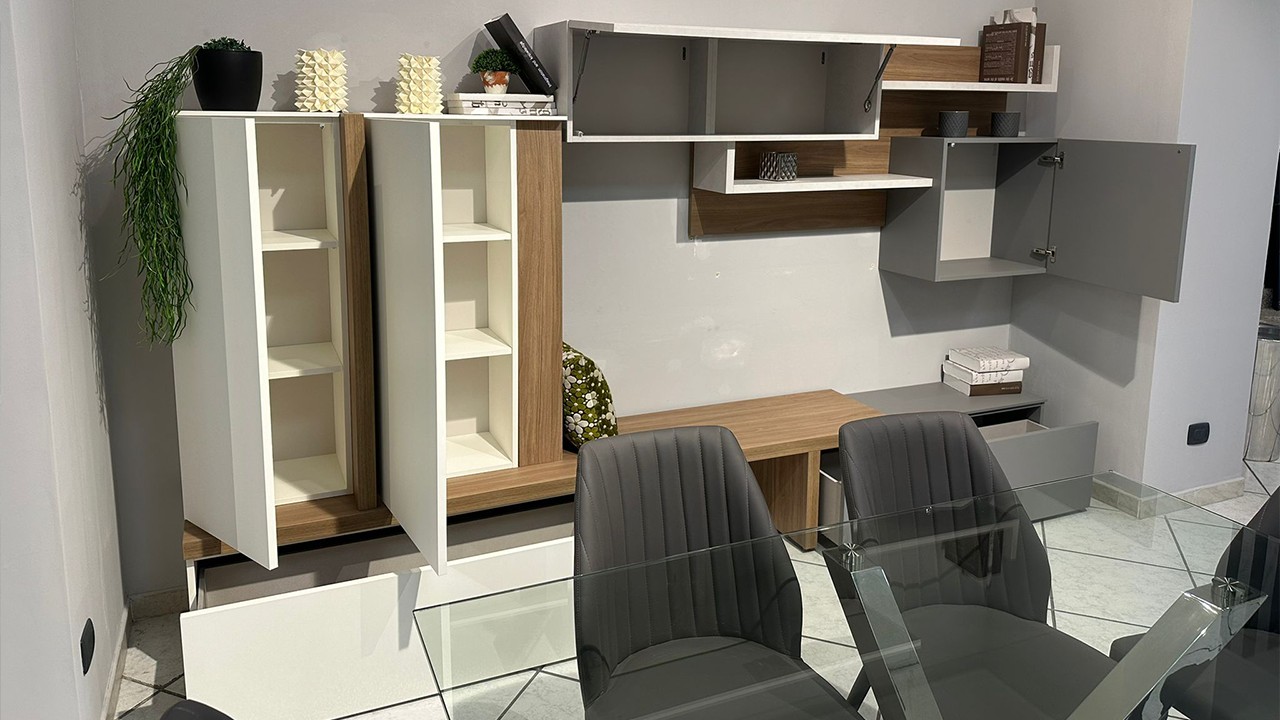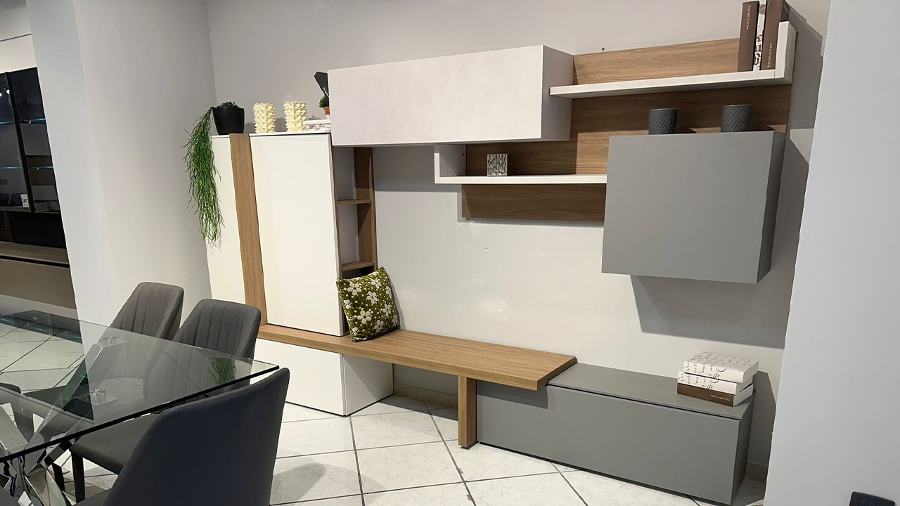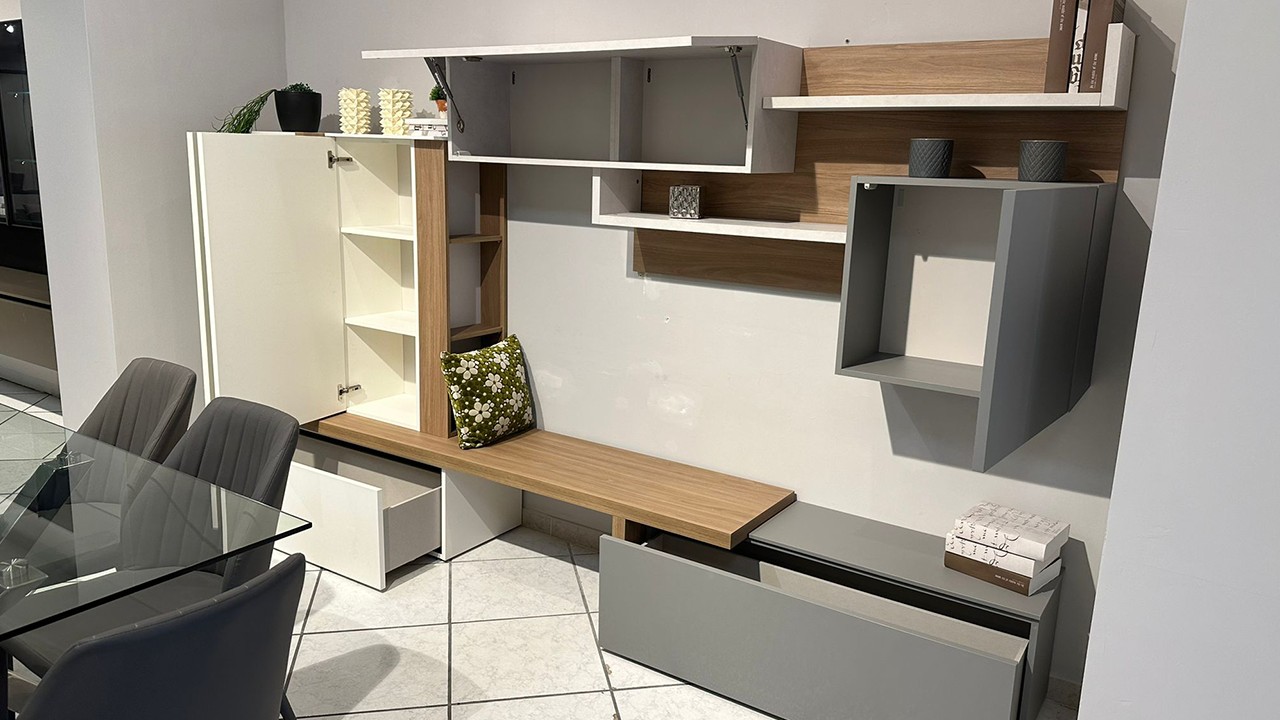 Disponibile all'interno dello Store di Modugno (BA) nelle finiture bianco opaco, grigio londra e calce con particolari color noce naturale, parete moderna in promozione a: € 950,00
