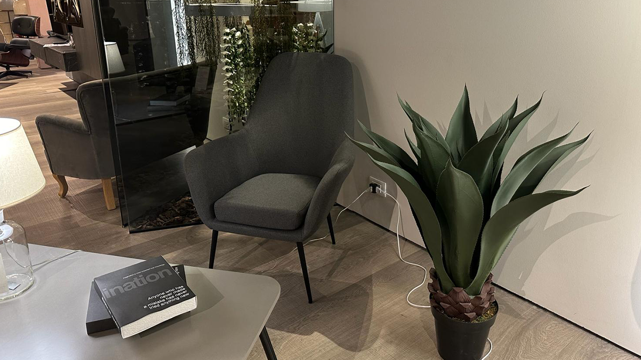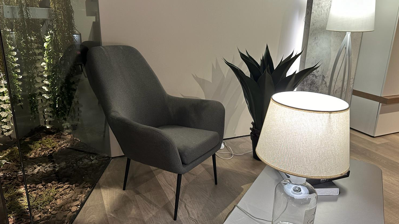 Disponibile all'interno dello Store di Cerignola (FG), poltrona rivestita in tessuto color grigio con gambi in acciaio verniciato nero.