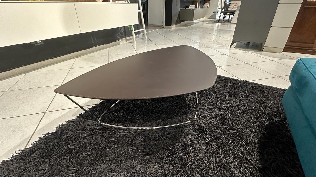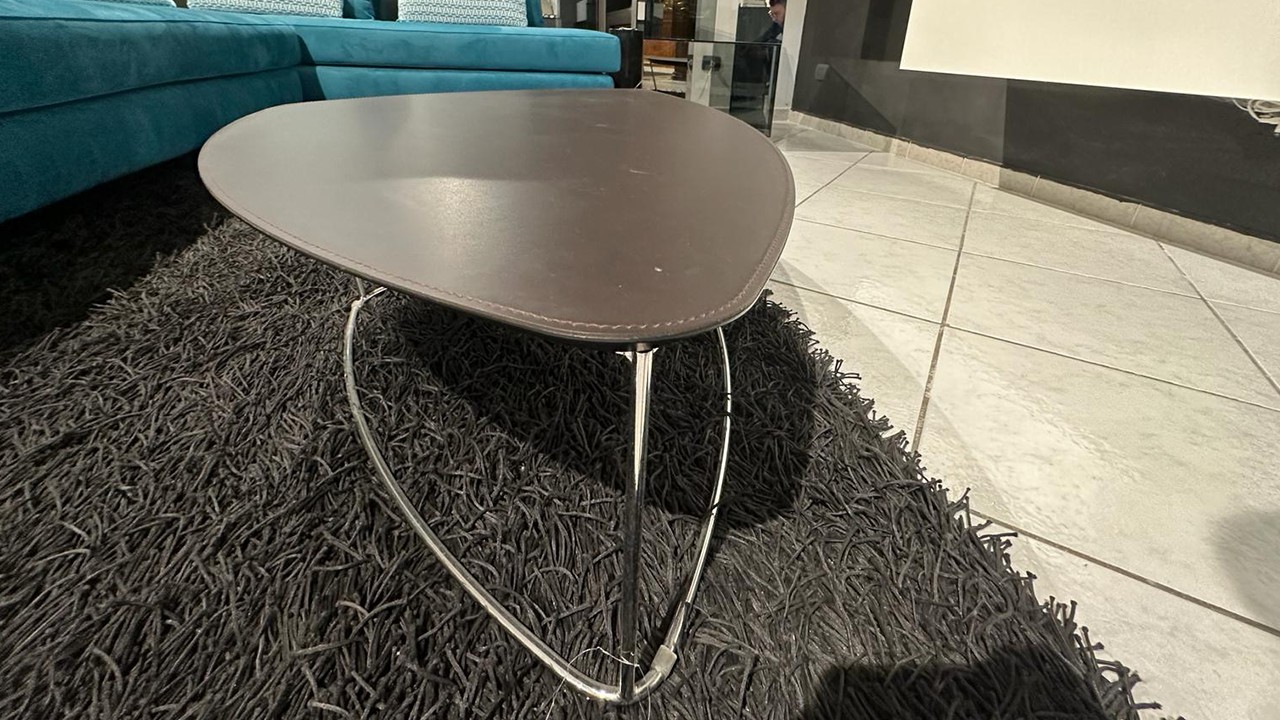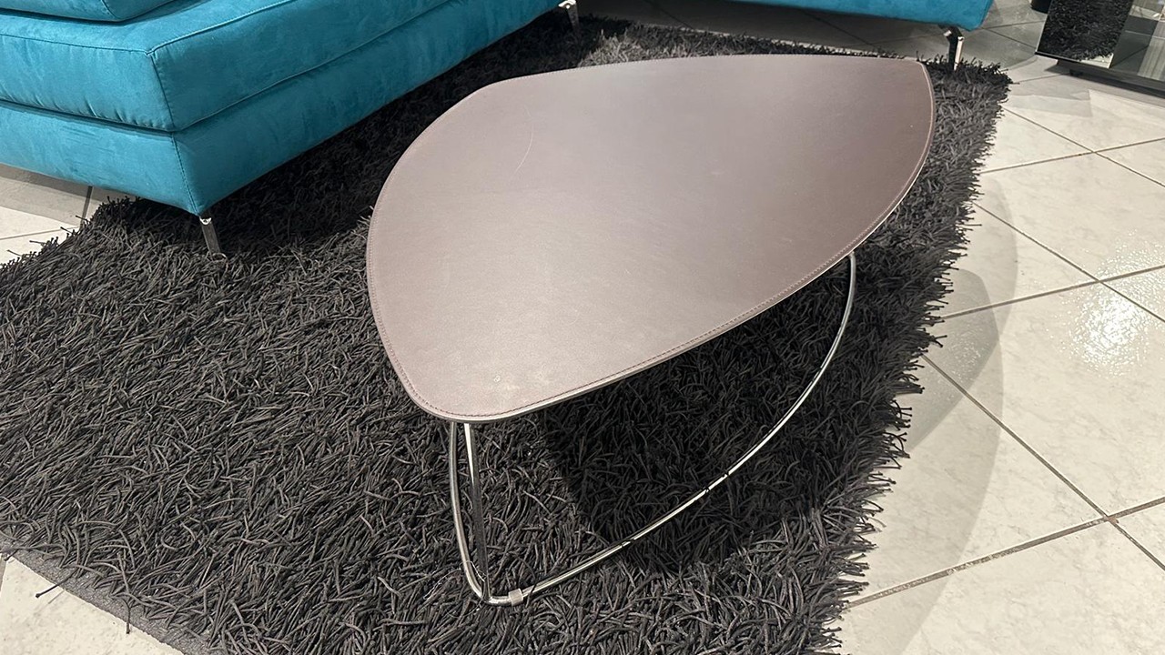 Tavolino da salotto in offerta all'interno dello Store di Modugno (BA), dipsonibile con struttura in metallo finitura cromo e piano in cuoio brown .