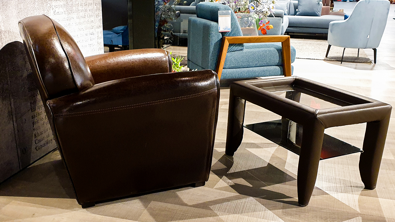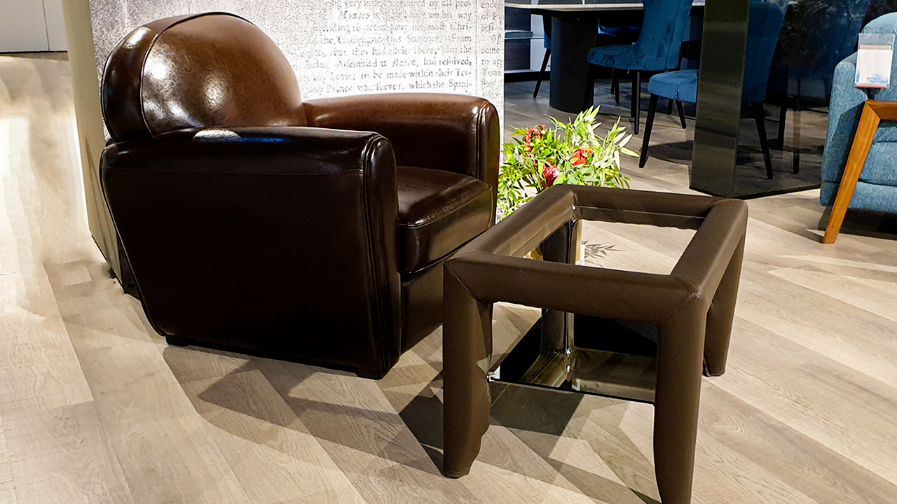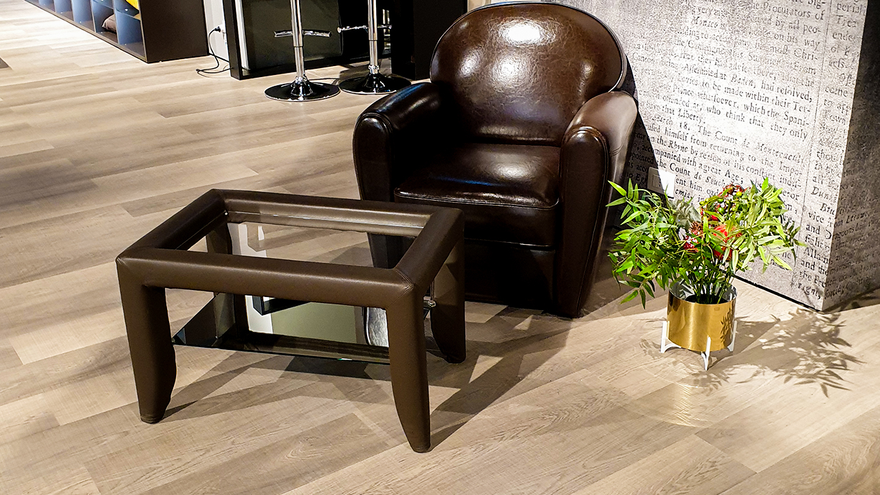 Tavolino rettangolare da salotto in pelle marrone con piano in vetro trasparente.