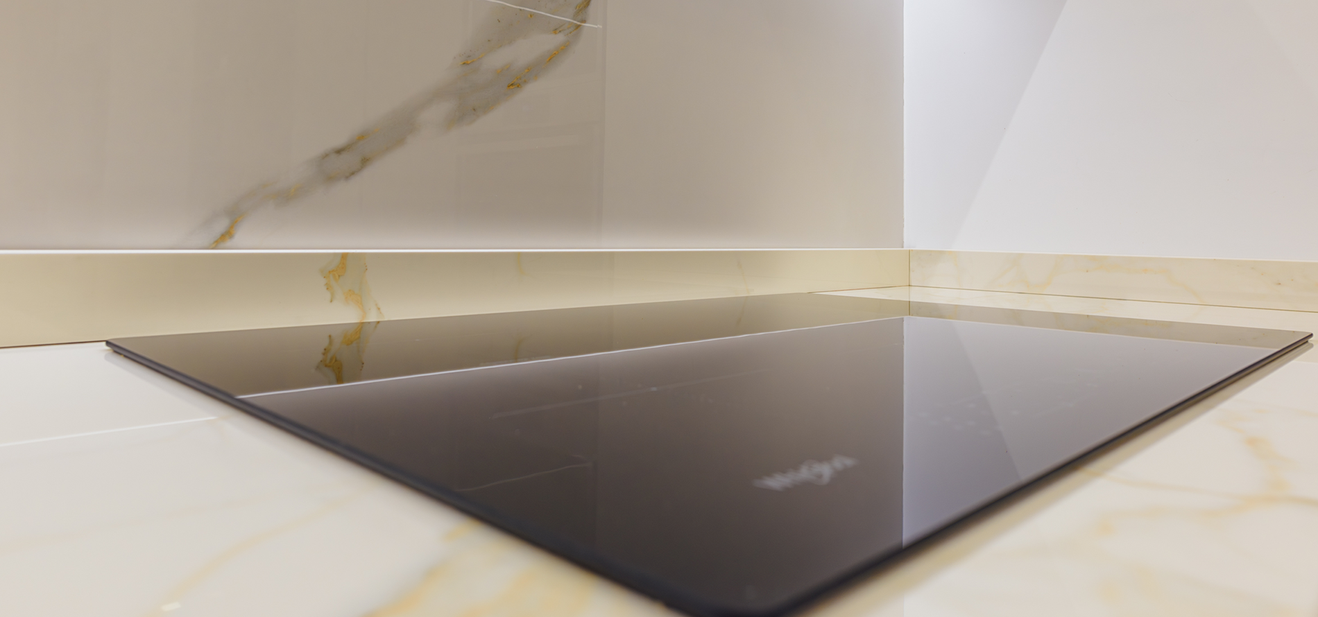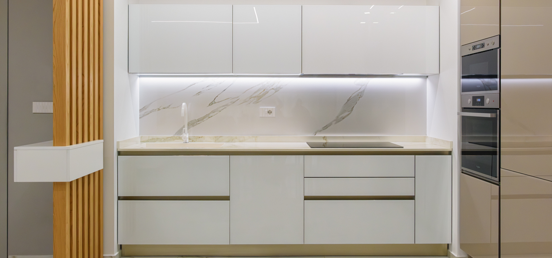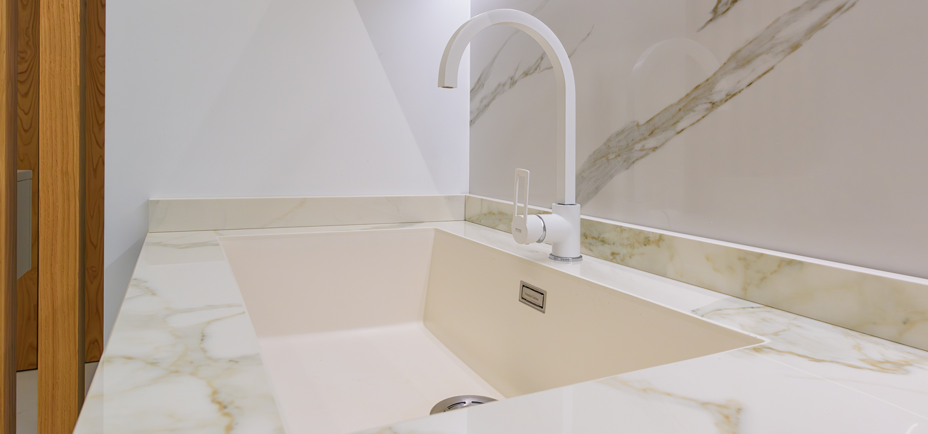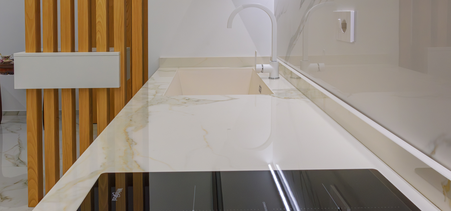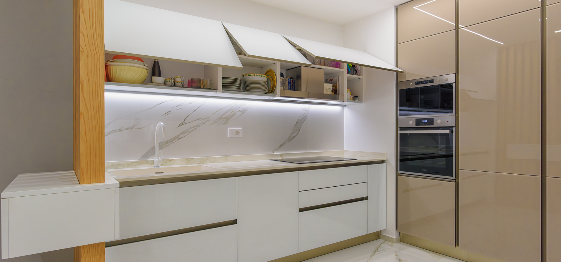 La composizione è il modello Ri-Flex firmata VenetaCucine ed è stata realizzata nella versione Bianco Puro Lucido in coordinato all'Alabastro Lucido , correlato dal piano di lavoro Caranto realizzato in ceramica KER, igienica sicura e che non rilascia elementi chimici negli alimenti, finitura Calacatta Golden.