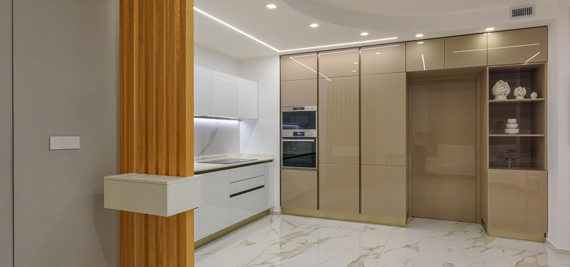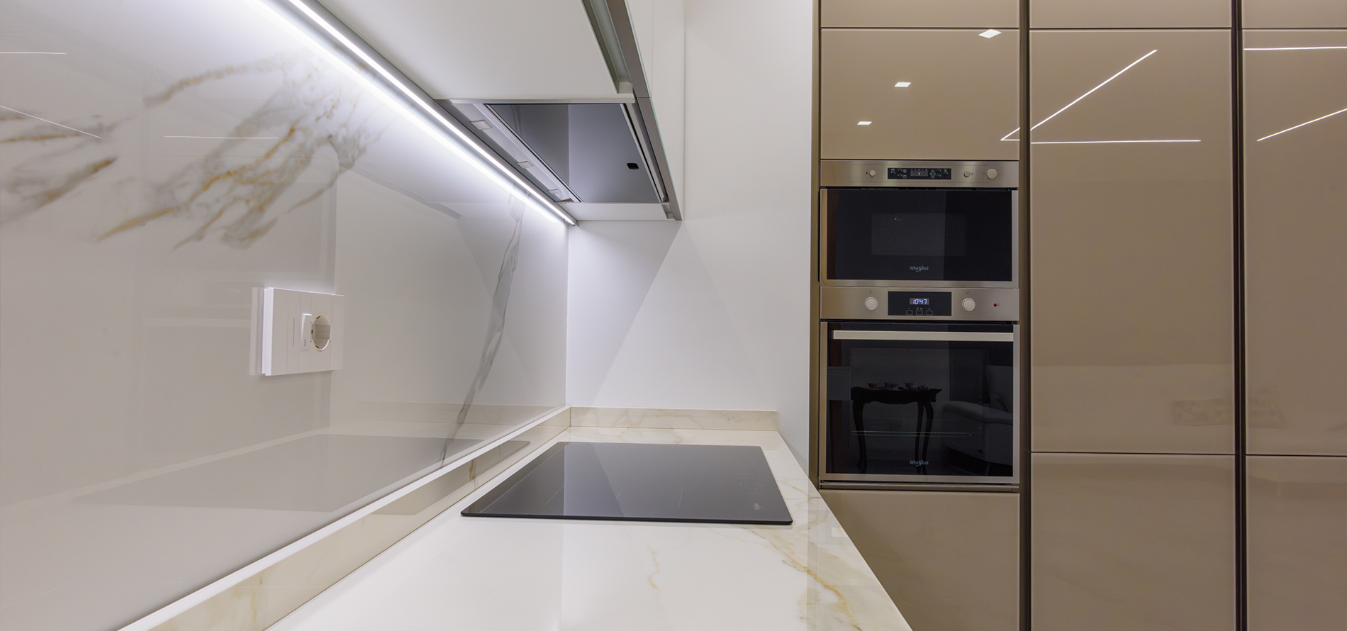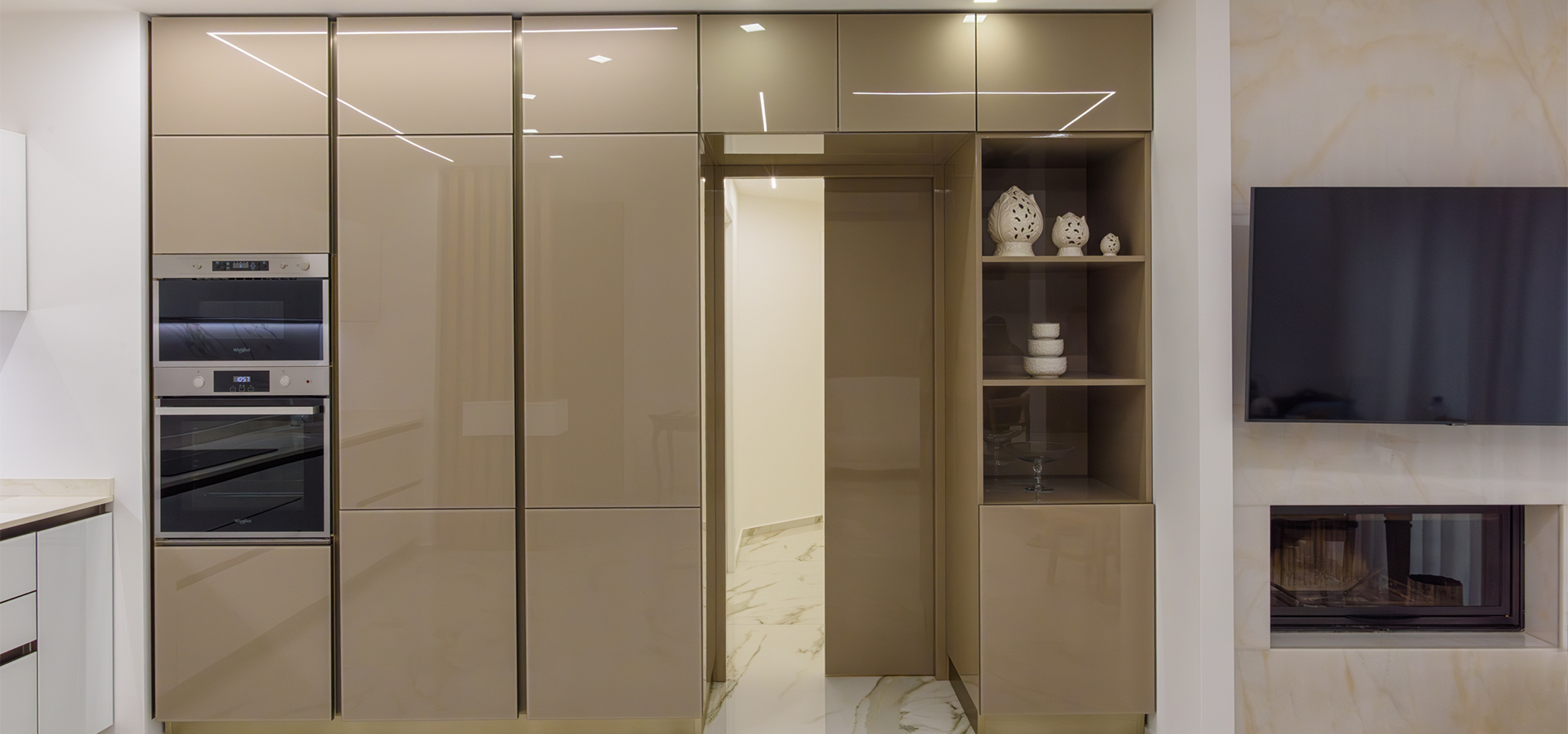 In questa realizzazione il nostro staff di consulenti d'arredo ha realizzato questa composizione con lo scopo di enfatizzare l'elemento protagonista di questa cucina: il vetro.