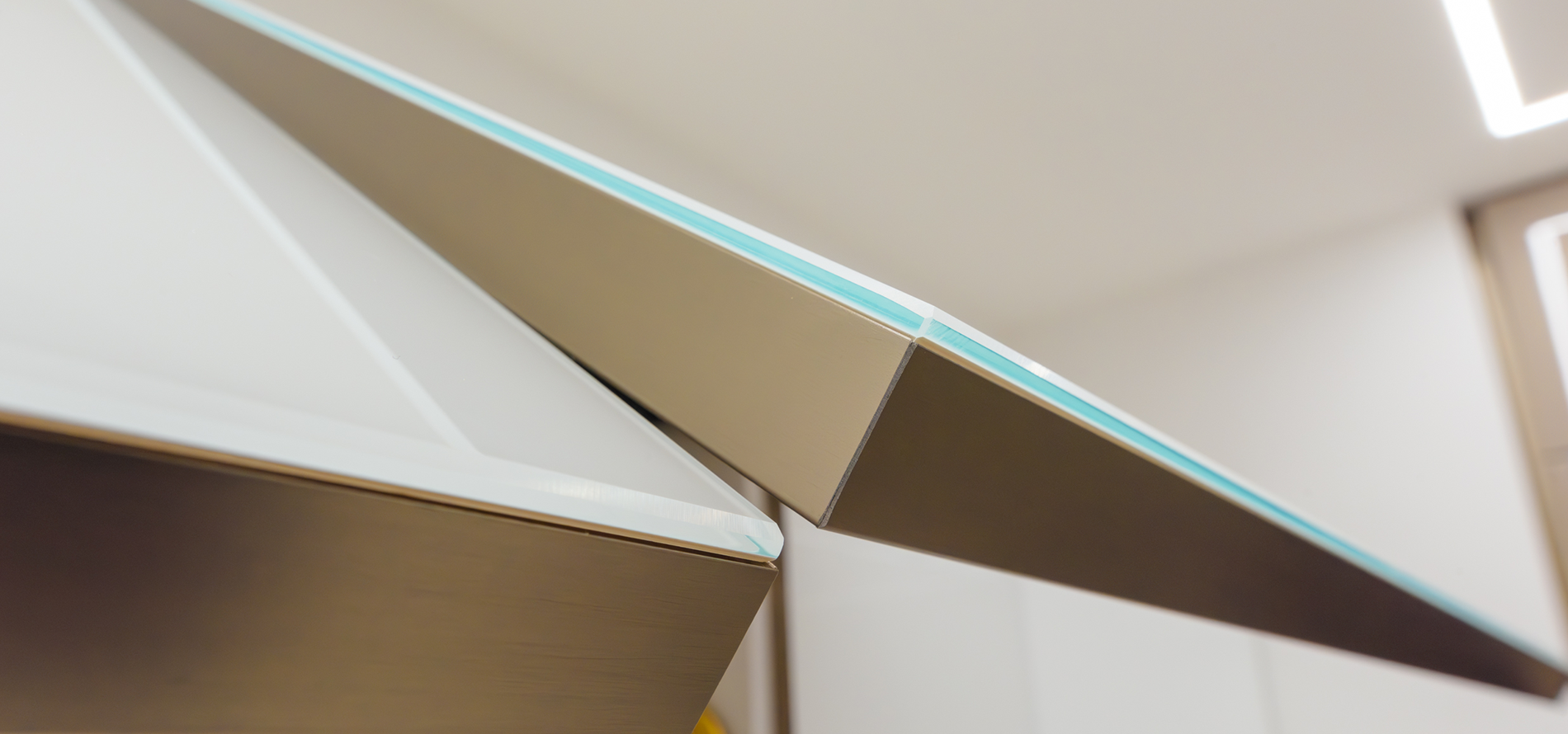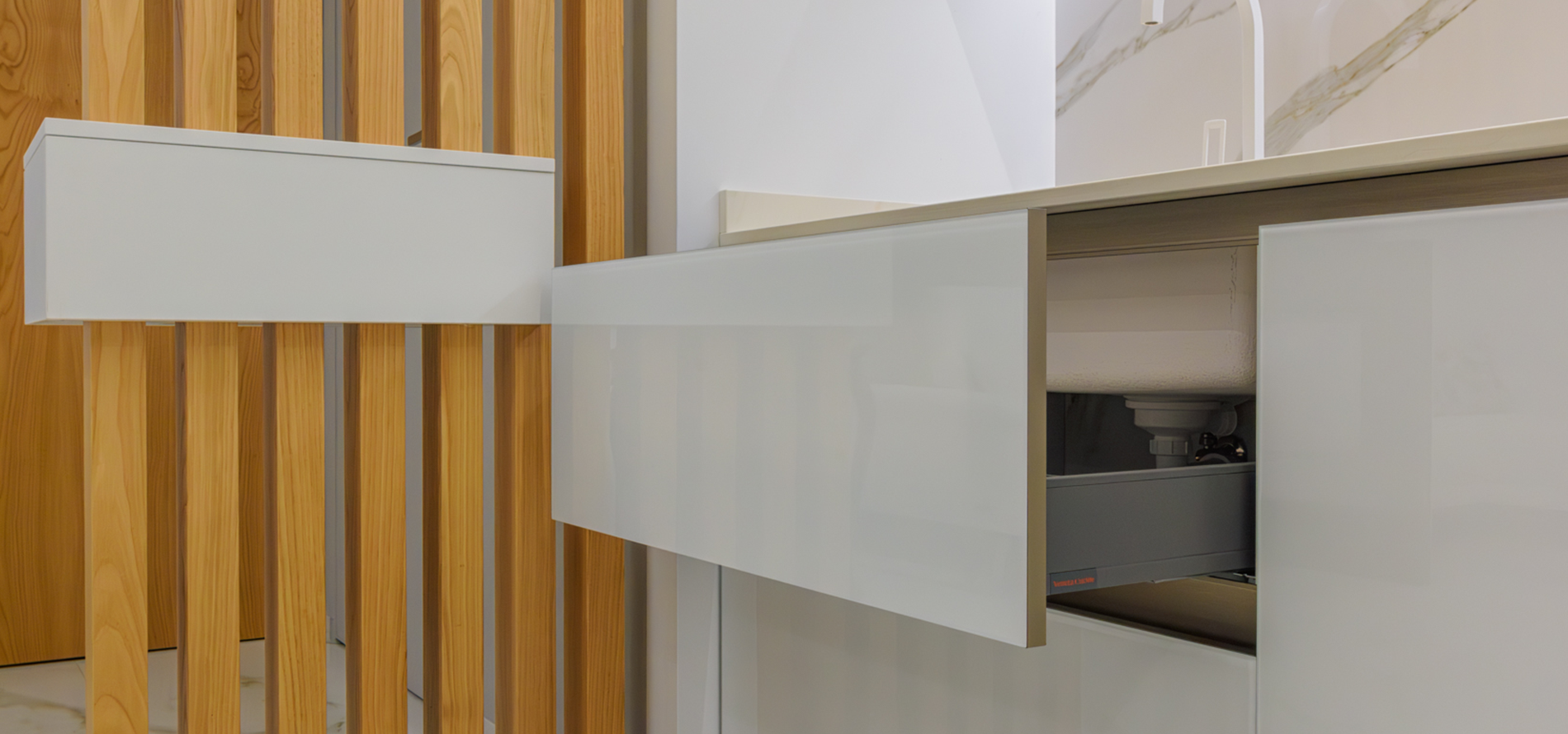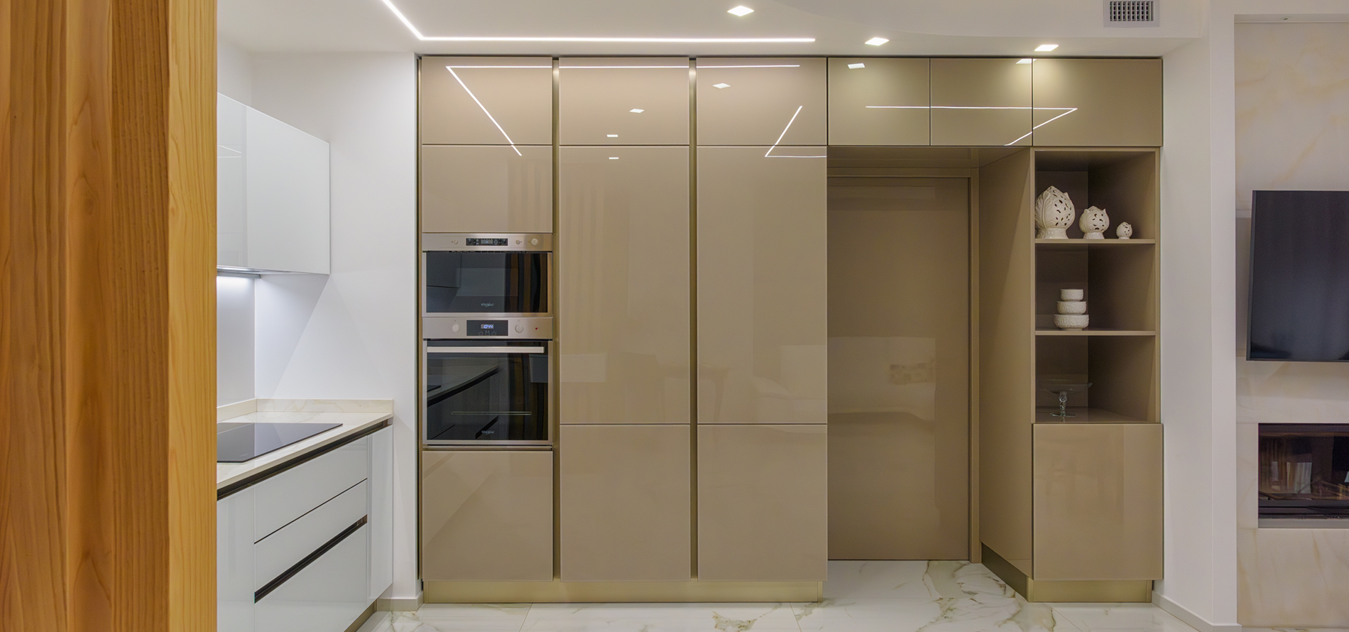 In questa realizzazione il nostro staff di consulenti d'arredo ha realizzato questa composizione con lo scopo di enfatizzare l'elemento protagonista di questa cucina: il vetro.
