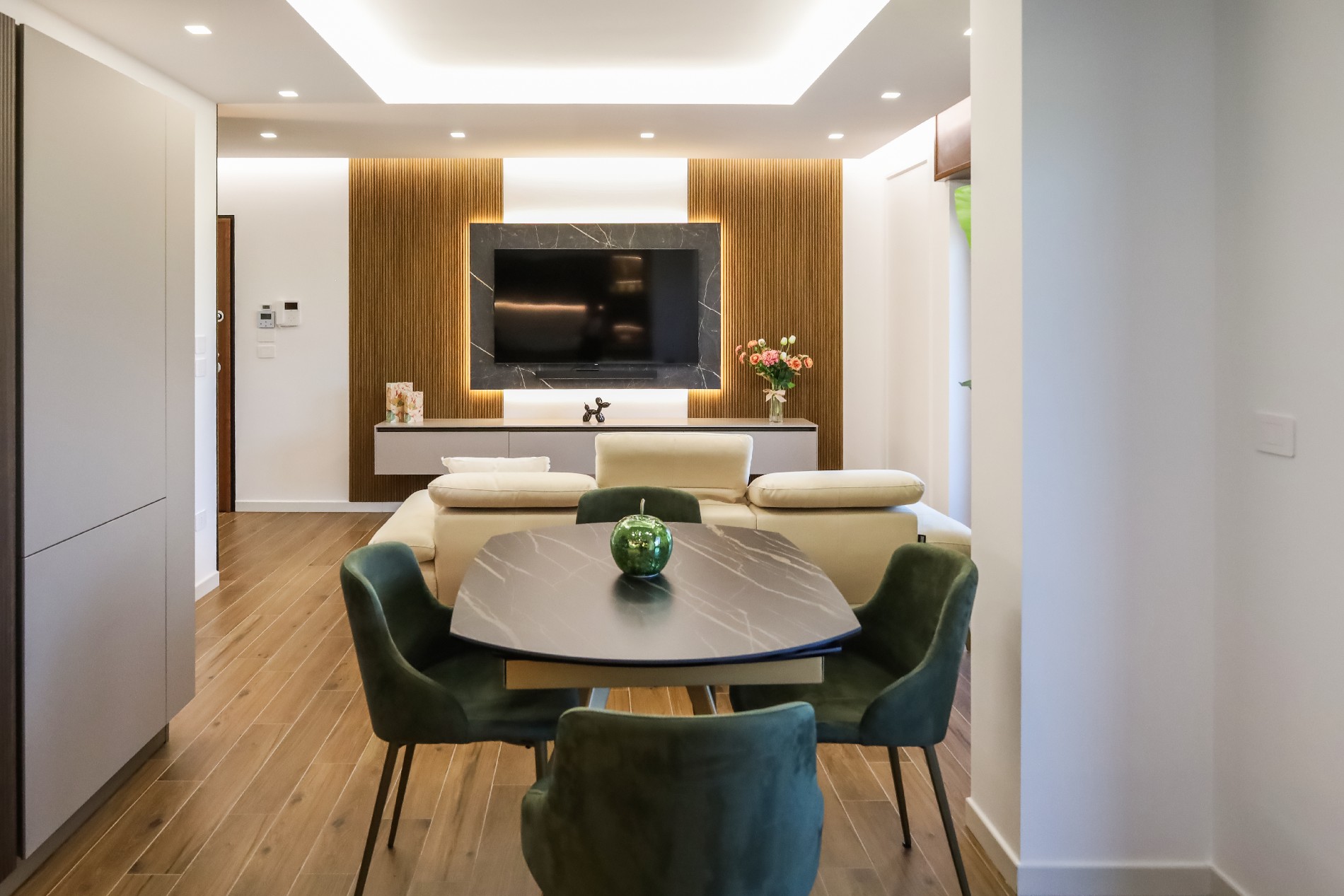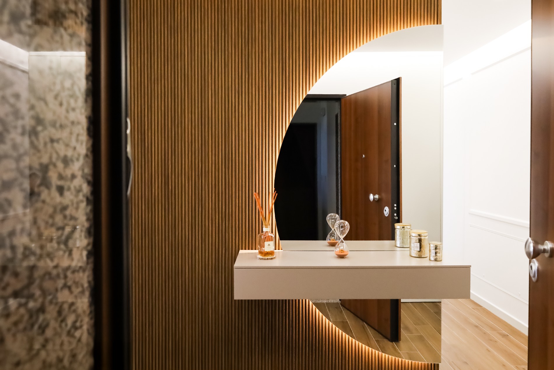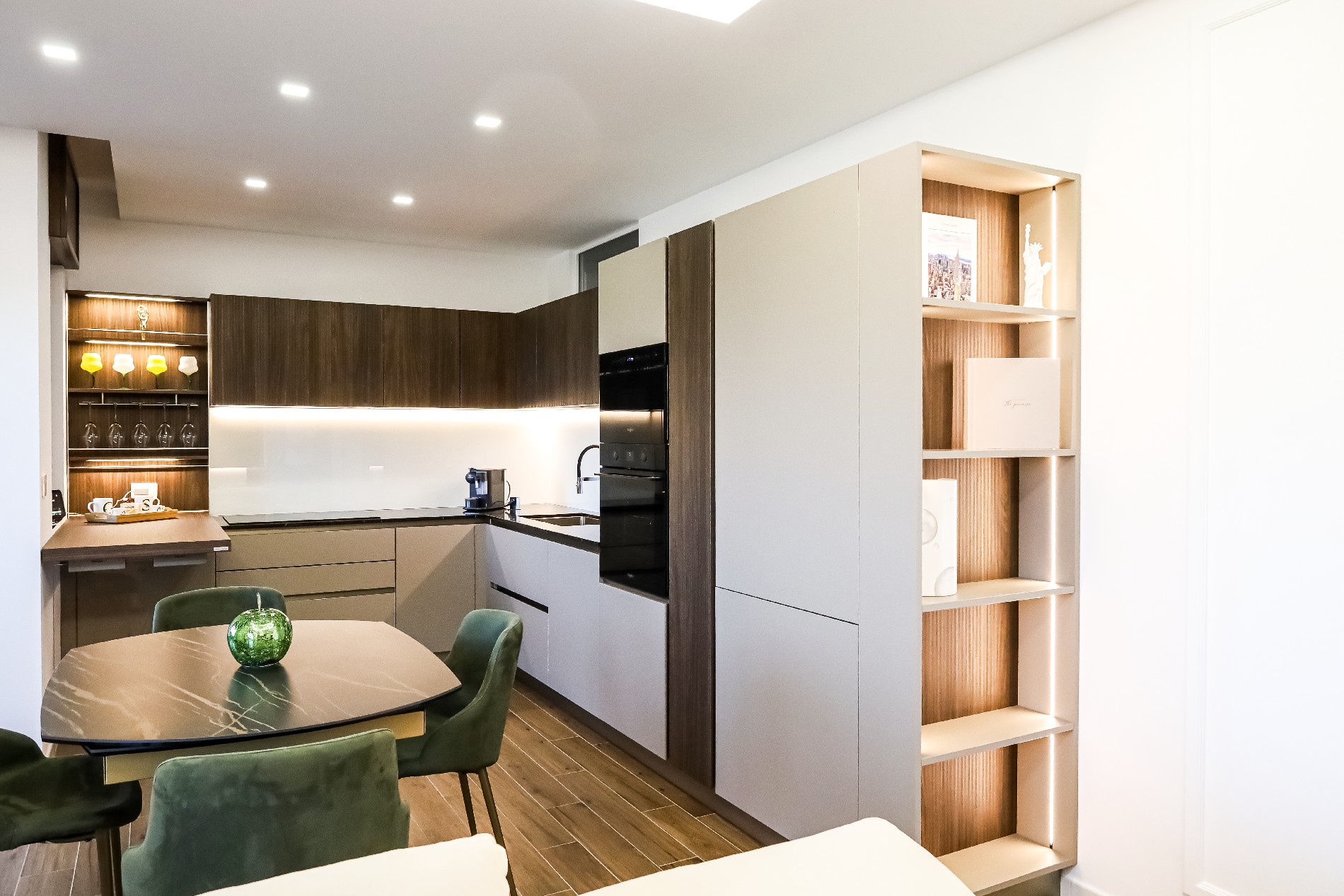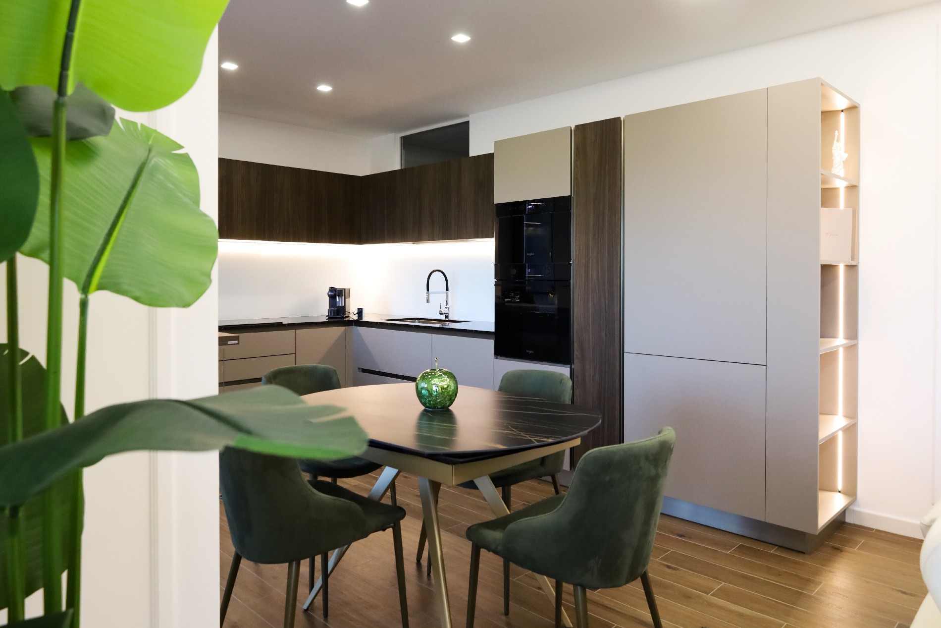 Torna indietro Un angolo di fascino Home / Progetti realizzati/ Un angolo di fascino Con questo progetto, il nostro team di arredatori si è immerso nella quotidianità di una giovane coppia, che ci ha affidato il compito, e l'onore, di trasformare la loro casa in un autentico angolo di fascino. Appena varcata la soglia, si viene accolti da un ingresso elegante e dallo stile contemporaneo, impreziosito dal pannello decorativo che caratterizza l'intero living. Proseguendo, si accede a un ambiente unico, dove spiccano la parete Mood Day e il divano Avery, entrambi firmati La Casa Moderna, che donano carattere e armonia allo spazio.Le sedie, rivestite in microfibra effetto velluto verde, aggiungono una nota di colore che ravviva l’ambiente, senza però togliere protagonismo alla raffinata finitura del piano del tavolo, il quale, all’occorrenza, si apre con un semplice gesto.Proseguendo, si viene proiettati nella zona cucina, dove il modello Oyster Pro firmata VENETA CUCINE nella finitura Silk Marron Avana si abbina armoniosamente al Noce Scuro Riga Dek. Il tutto è coordinato dal piano di lavoro Caranto in quarzo, spessore 2 cm, finitura Cassiopea, che richiama elegantemente sia il piano del tavolo che il pannello porta TV, creando un piacevole filo conduttore tra gli ambienti.Nella zona notte, il protagonista è il letto rivestito in pelle, impreziosito da dettagli in finitura gold, abbinato al gruppo notte con piano in marmo e piedini in finitura bronzo. La vera sorpresa, però, è la cabina armadio: celata dietro due eleganti porte scorrevoli in vetro stopsol, è attrezzata con illuminazione a LED in fresata nei fianchi, che valorizza ogni vano, e comprende anche un modulo dedicato per l’organizzazione delle scarpe.Vuoi arredare casa? Contattaci e fissa un appuntamento con un nostro consulente d'arredo. Clicca qui!