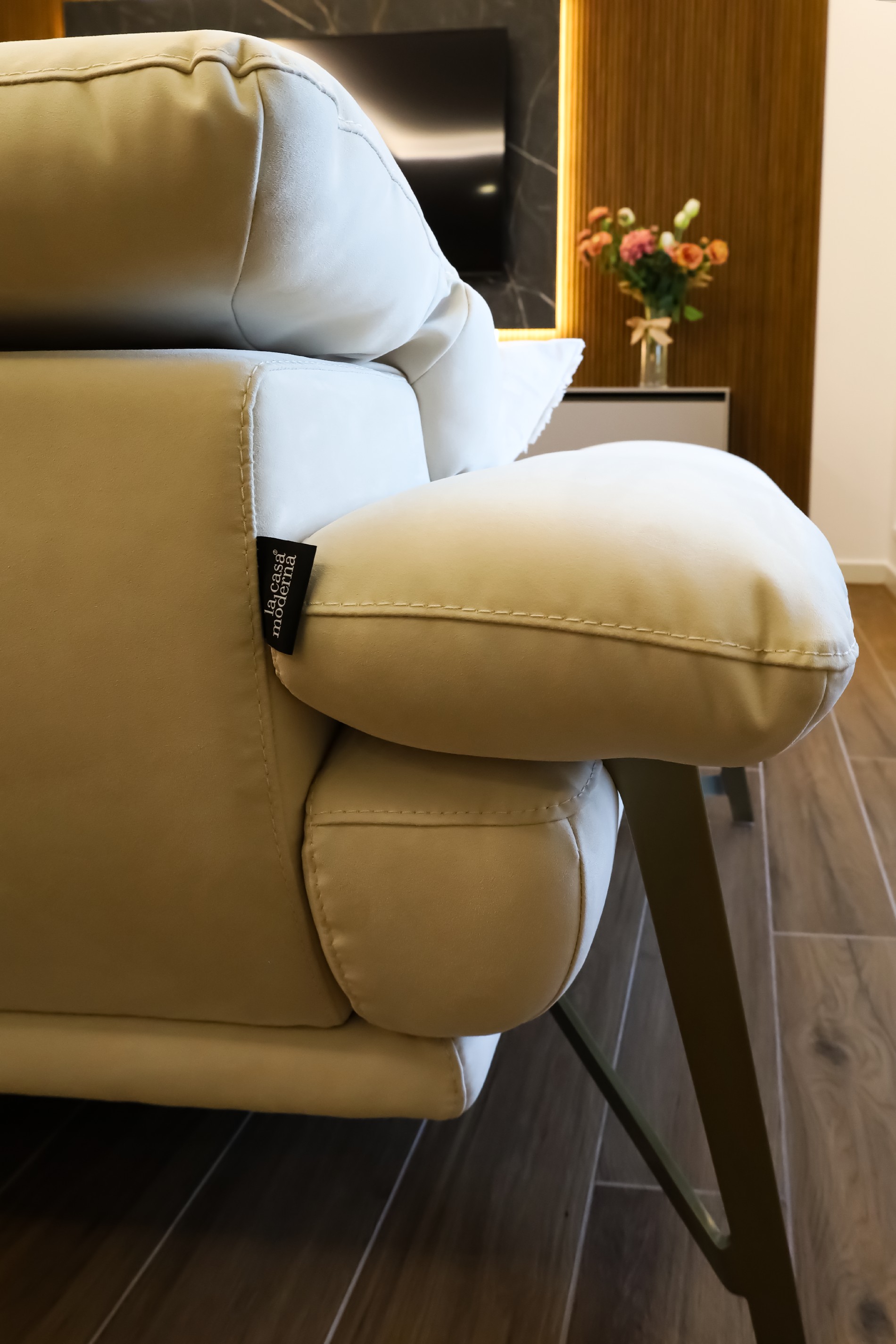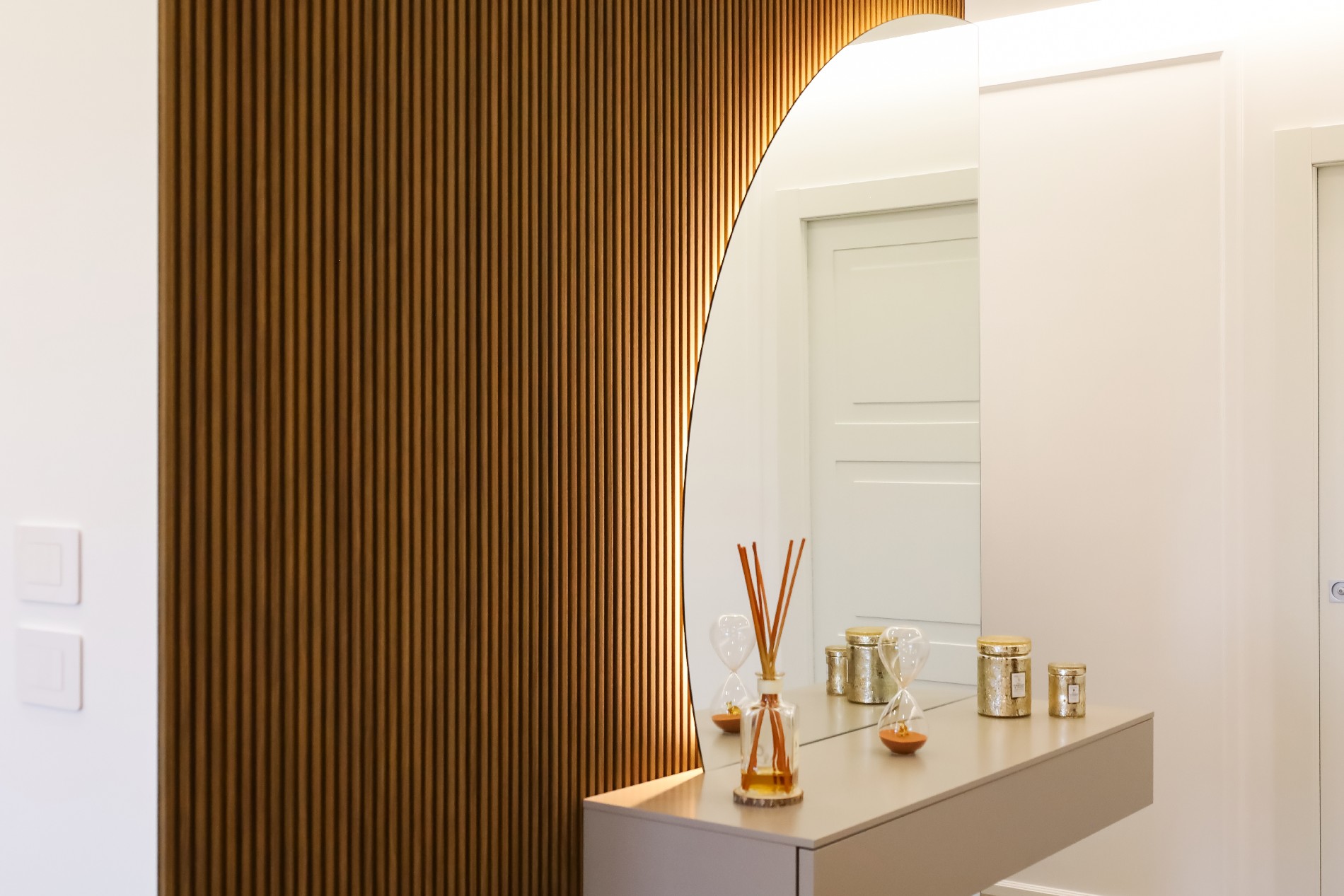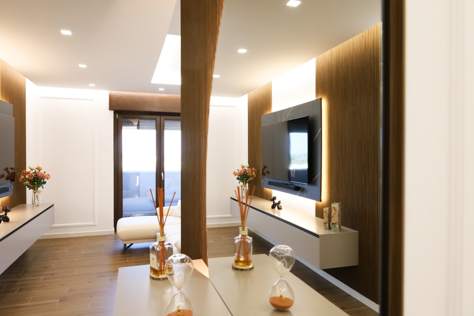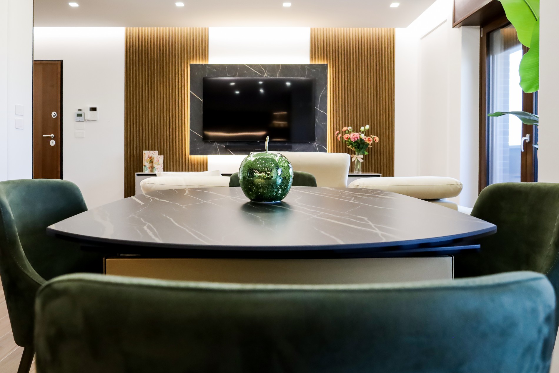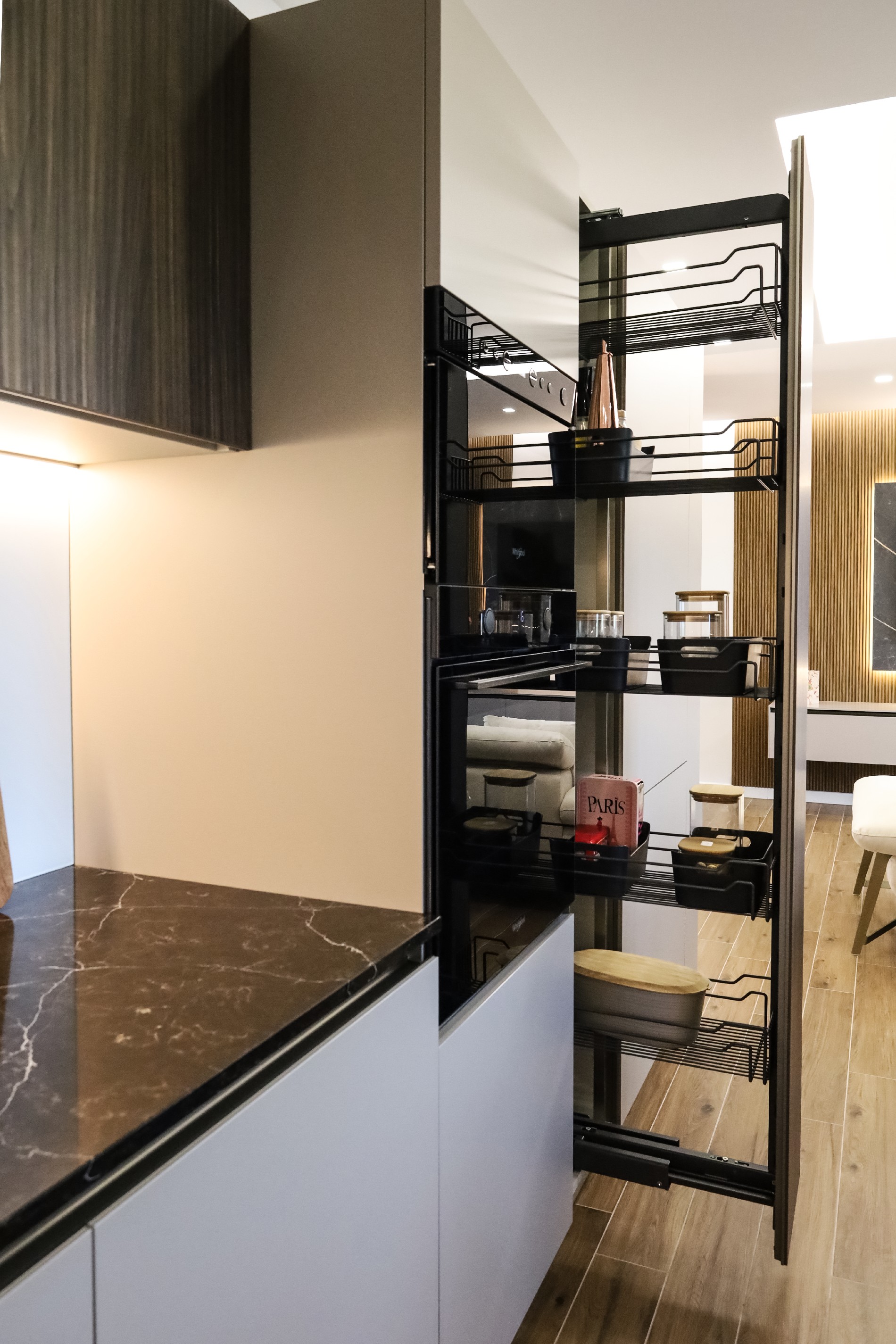 Torna indietro Un angolo di fascino Home / Progetti realizzati/ Un angolo di fascino Con questo progetto, il nostro team di arredatori si è immerso nella quotidianità di una giovane coppia, che ci ha affidato il compito, e l'onore, di trasformare la loro casa in un autentico angolo di fascino. Appena varcata la soglia, si viene accolti da un ingresso elegante e dallo stile contemporaneo, impreziosito dal pannello decorativo che caratterizza l'intero living. Proseguendo, si accede a un ambiente unico, dove spiccano la parete Mood Day e il divano Avery, entrambi firmati La Casa Moderna, che donano carattere e armonia allo spazio.Le sedie, rivestite in microfibra effetto velluto verde, aggiungono una nota di colore che ravviva l’ambiente, senza però togliere protagonismo alla raffinata finitura del piano del tavolo, il quale, all’occorrenza, si apre con un semplice gesto.Proseguendo, si viene proiettati nella zona cucina, dove il modello Oyster Pro firmata VENETA CUCINE nella finitura Silk Marron Avana si abbina armoniosamente al Noce Scuro Riga Dek. Il tutto è coordinato dal piano di lavoro Caranto in quarzo, spessore 2 cm, finitura Cassiopea, che richiama elegantemente sia il piano del tavolo che il pannello porta TV, creando un piacevole filo conduttore tra gli ambienti.Nella zona notte, il protagonista è il letto rivestito in pelle, impreziosito da dettagli in finitura gold, abbinato al gruppo notte con piano in marmo e piedini in finitura bronzo. La vera sorpresa, però, è la cabina armadio: celata dietro due eleganti porte scorrevoli in vetro stopsol, è attrezzata con illuminazione a LED in fresata nei fianchi, che valorizza ogni vano, e comprende anche un modulo dedicato per l’organizzazione delle scarpe.Vuoi arredare casa? Contattaci e fissa un appuntamento con un nostro consulente d'arredo. Clicca qui!