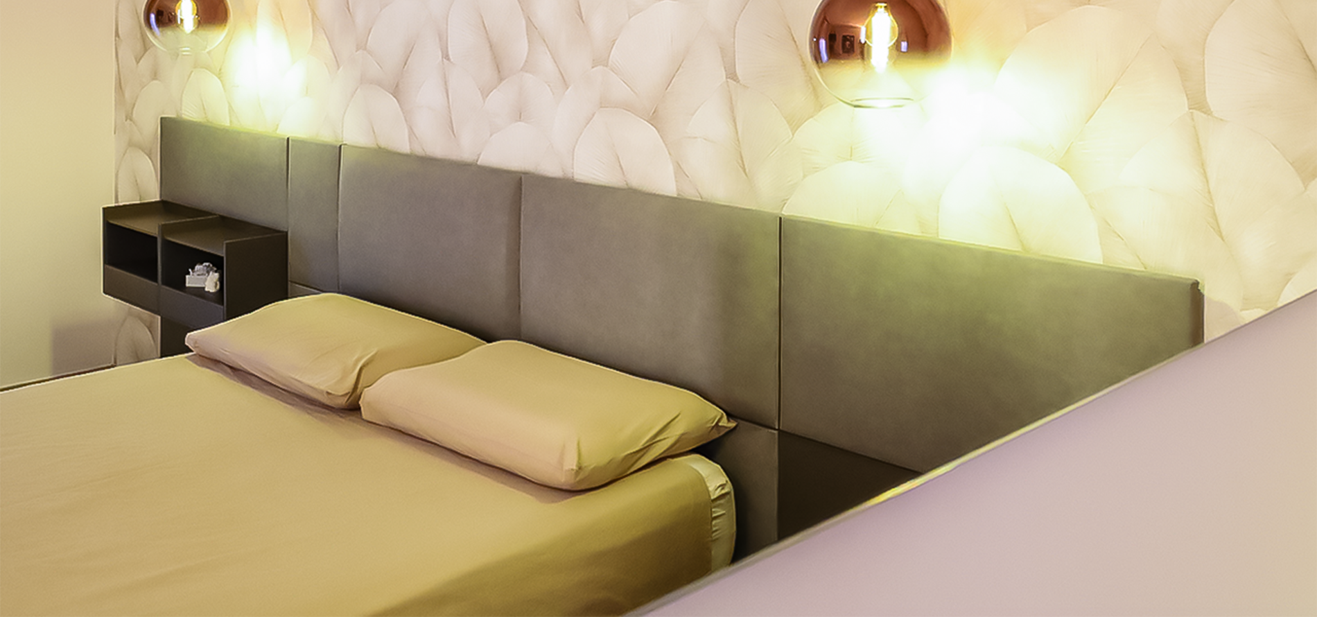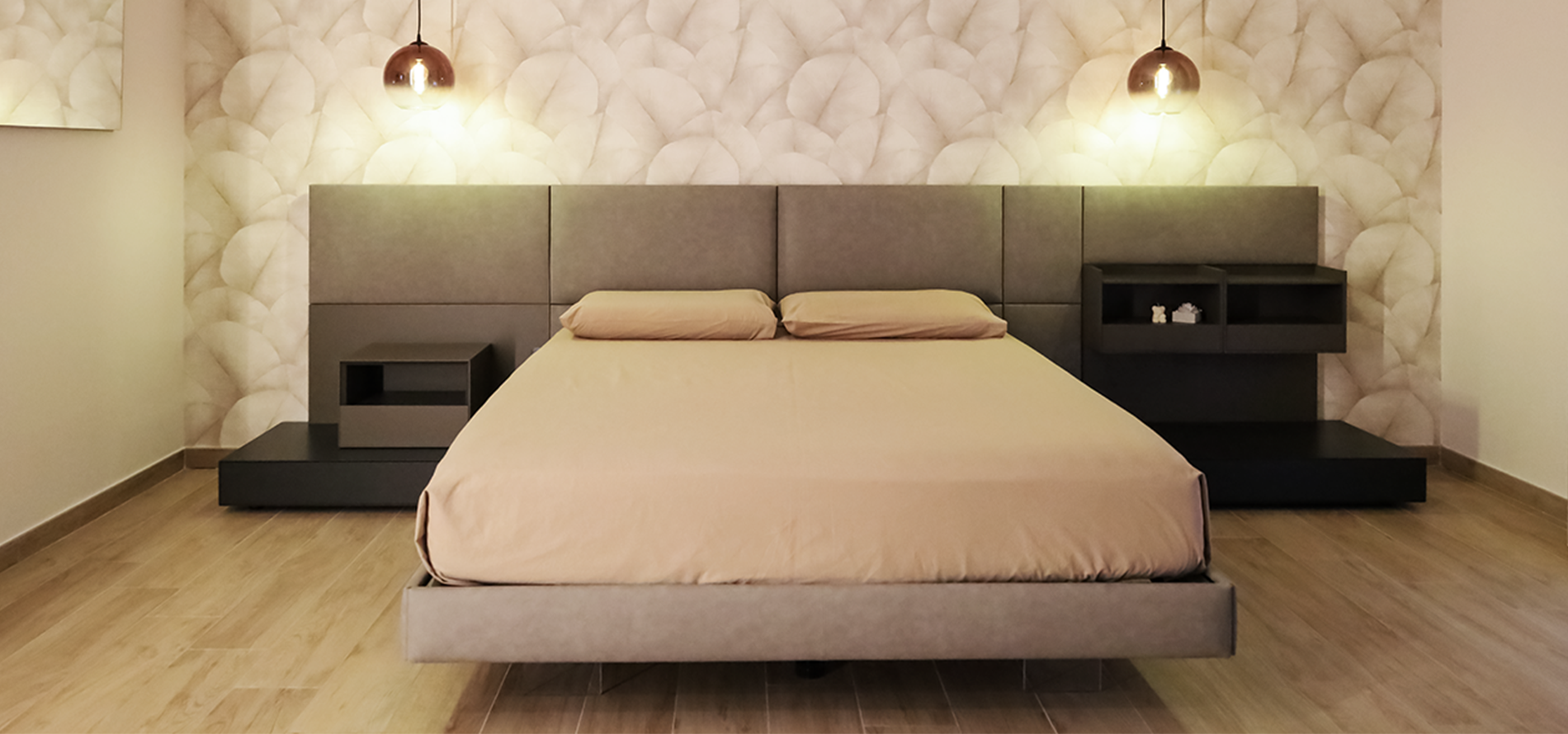 Il letto, con testata in ecopelle e comodini integrati, unisce design e praticità.