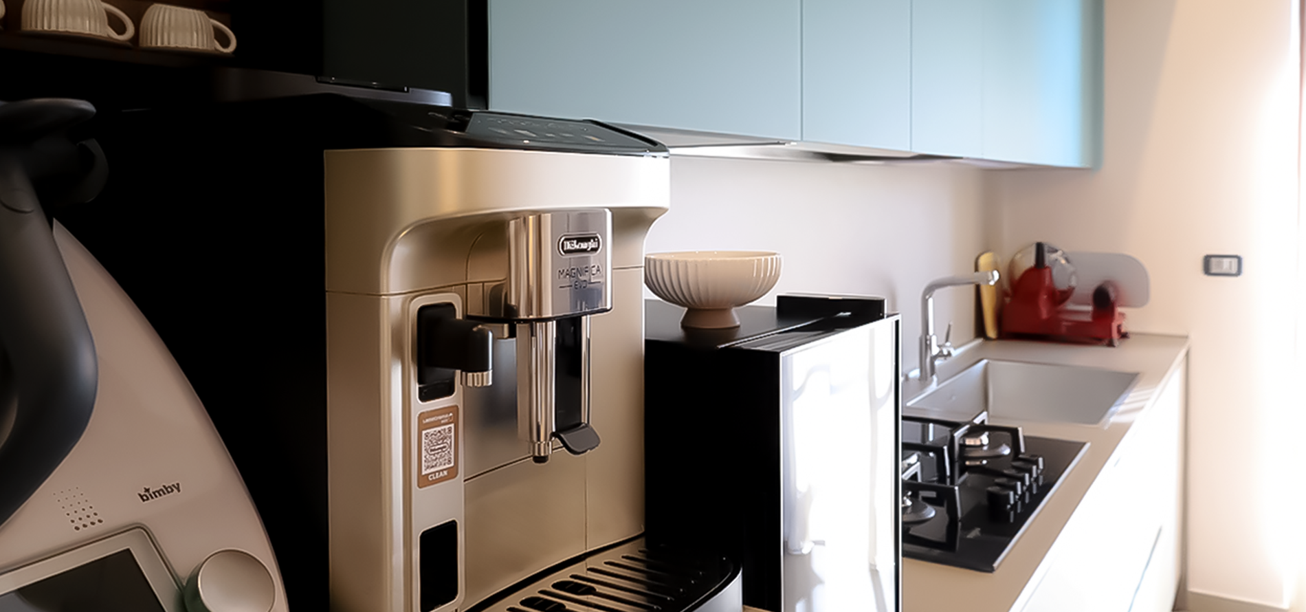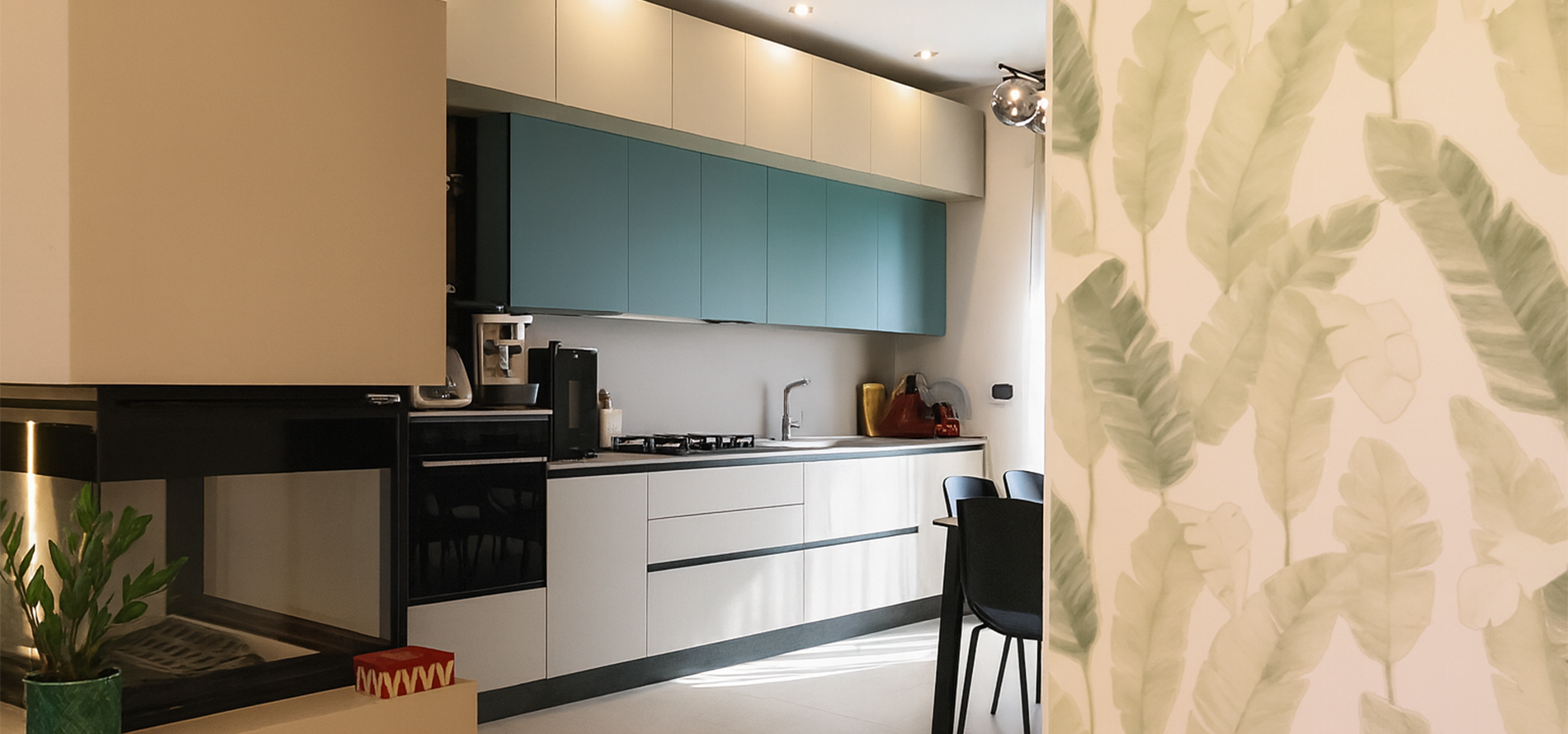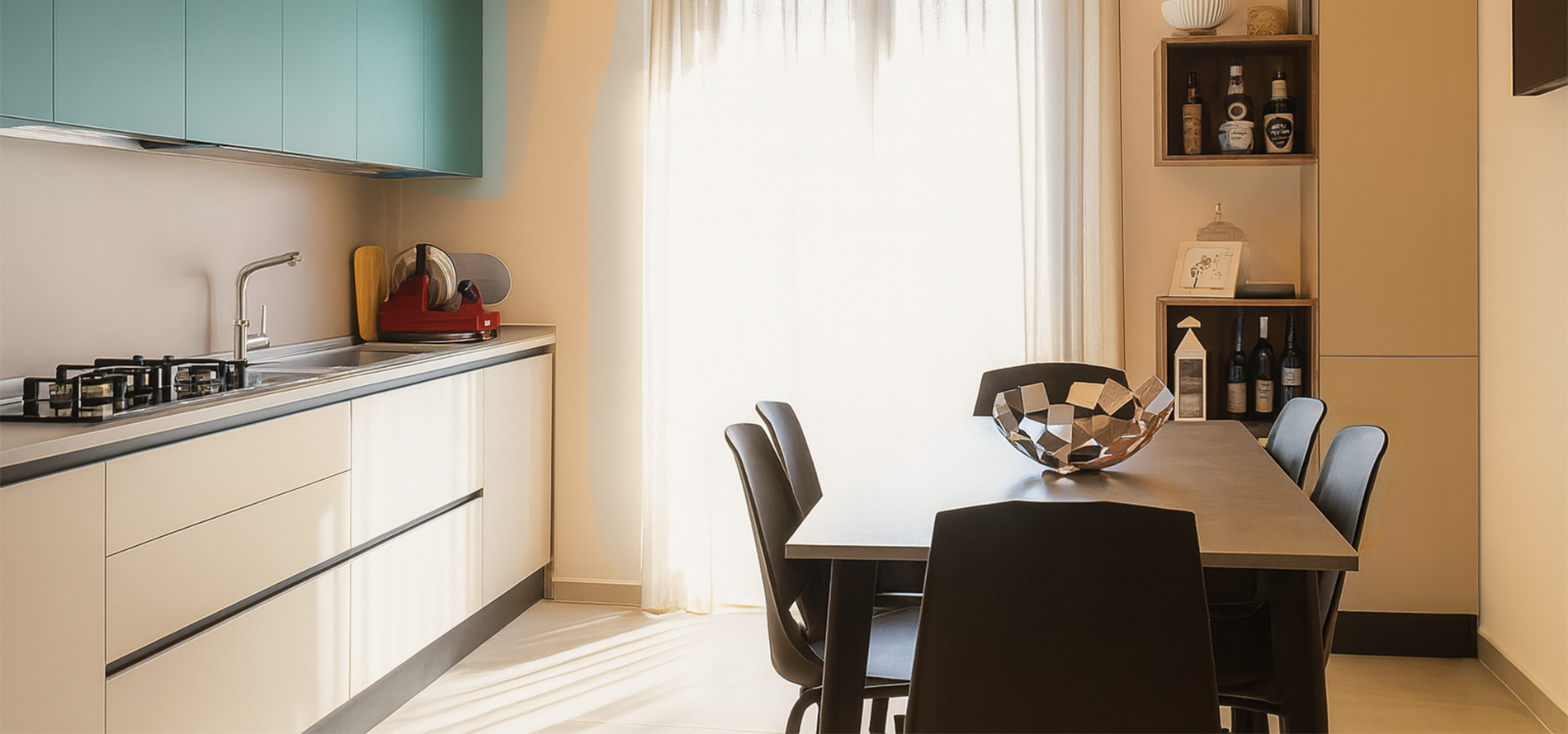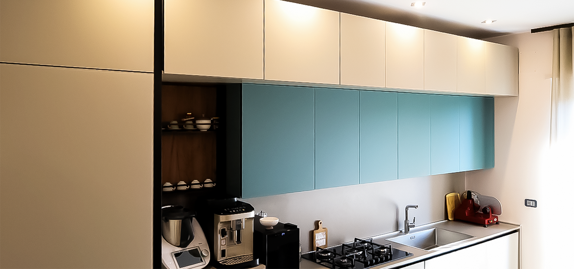 La cucina, con frontali in vetro satinato, resta autonoma ma legata al soggiorno, cuore pulsante dell’abitazione.