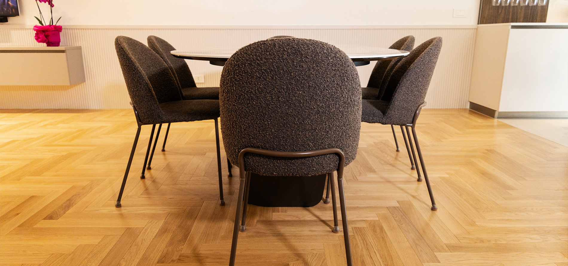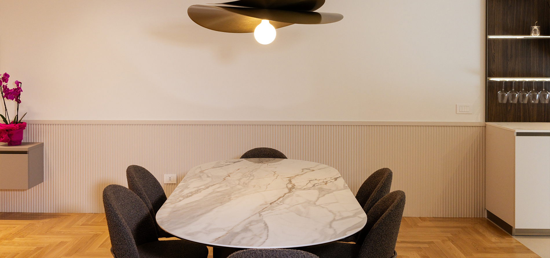 Accanto alla cucina, abbiamo realizzato un living minimale, dove forme semplici e materiali naturali creano un’atmosfera di equilibrio e benessere. Al centro dello spazio si distingue il tavolo Calligaris modello Twins, con la sua linea contemporanea e la doppia base scultorea, perfetto connubio tra funzionalità e design.