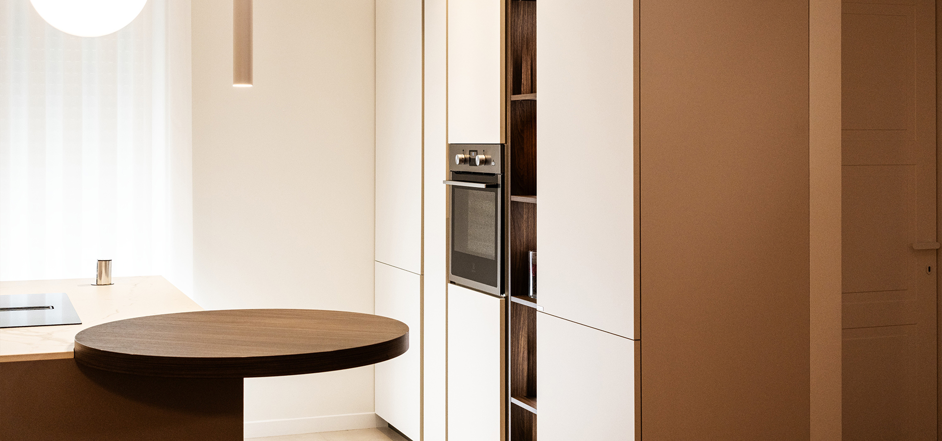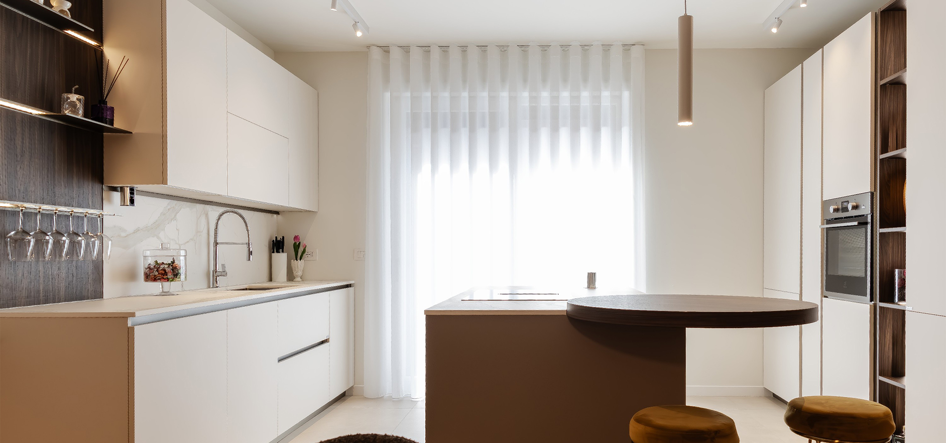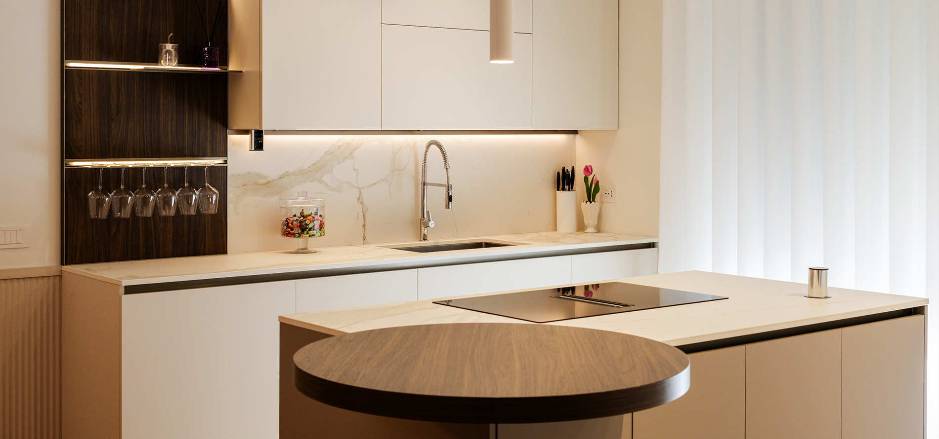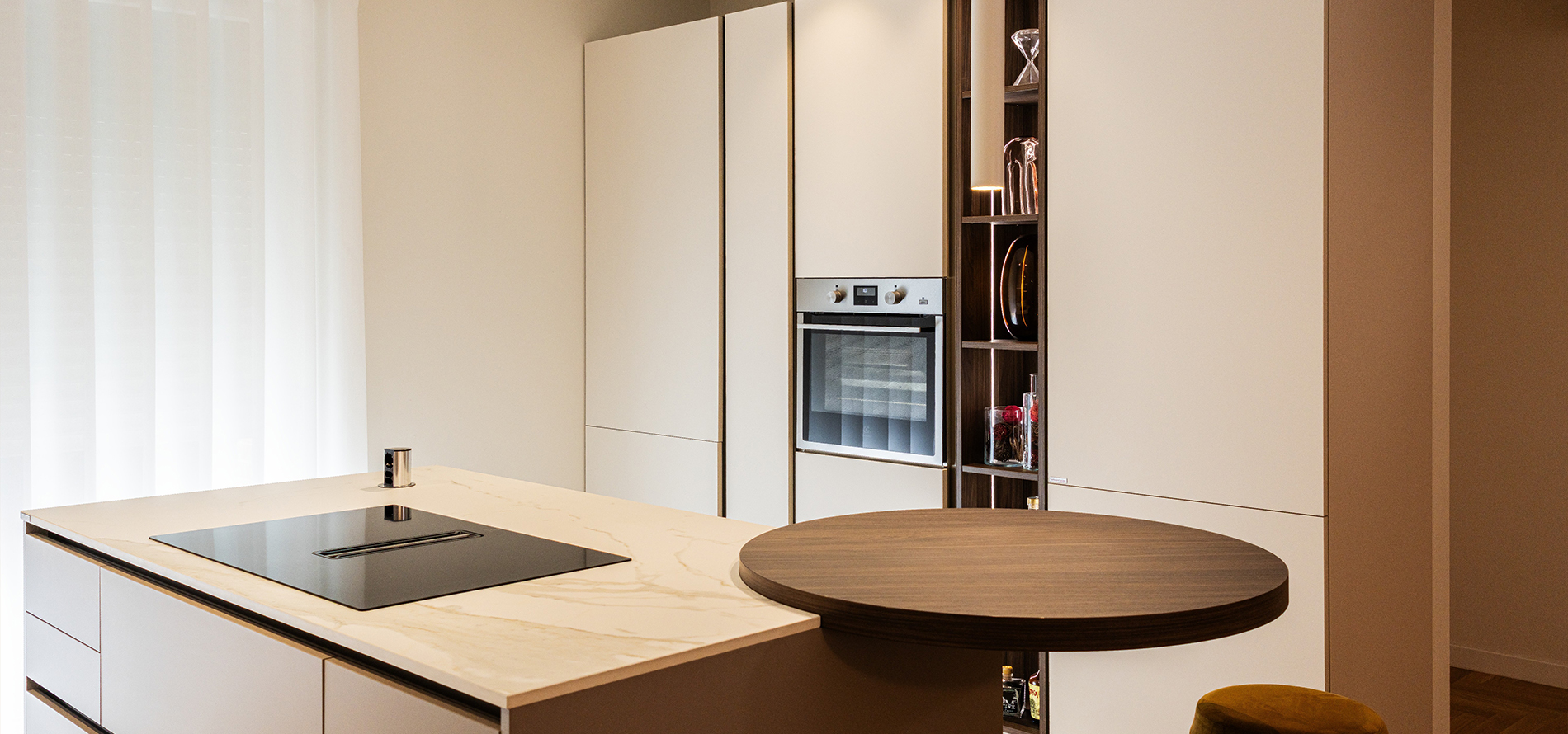 Un elemento distintivo del progetto è la cappa integrata nel piano cottura, scelta progettuale voluta dall’architetto per garantire una pulizia visiva delle linee e mantenere l’ambiente leggero e minimale, senza elementi sospesi che interrompano la continuità dello spazio.