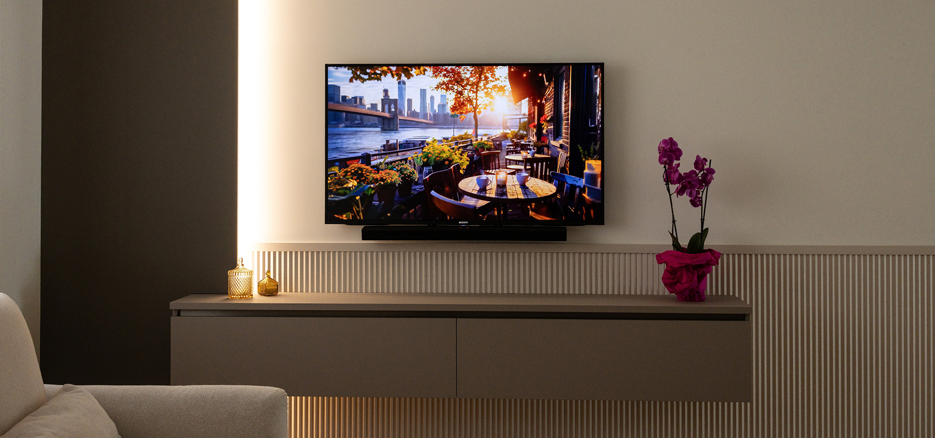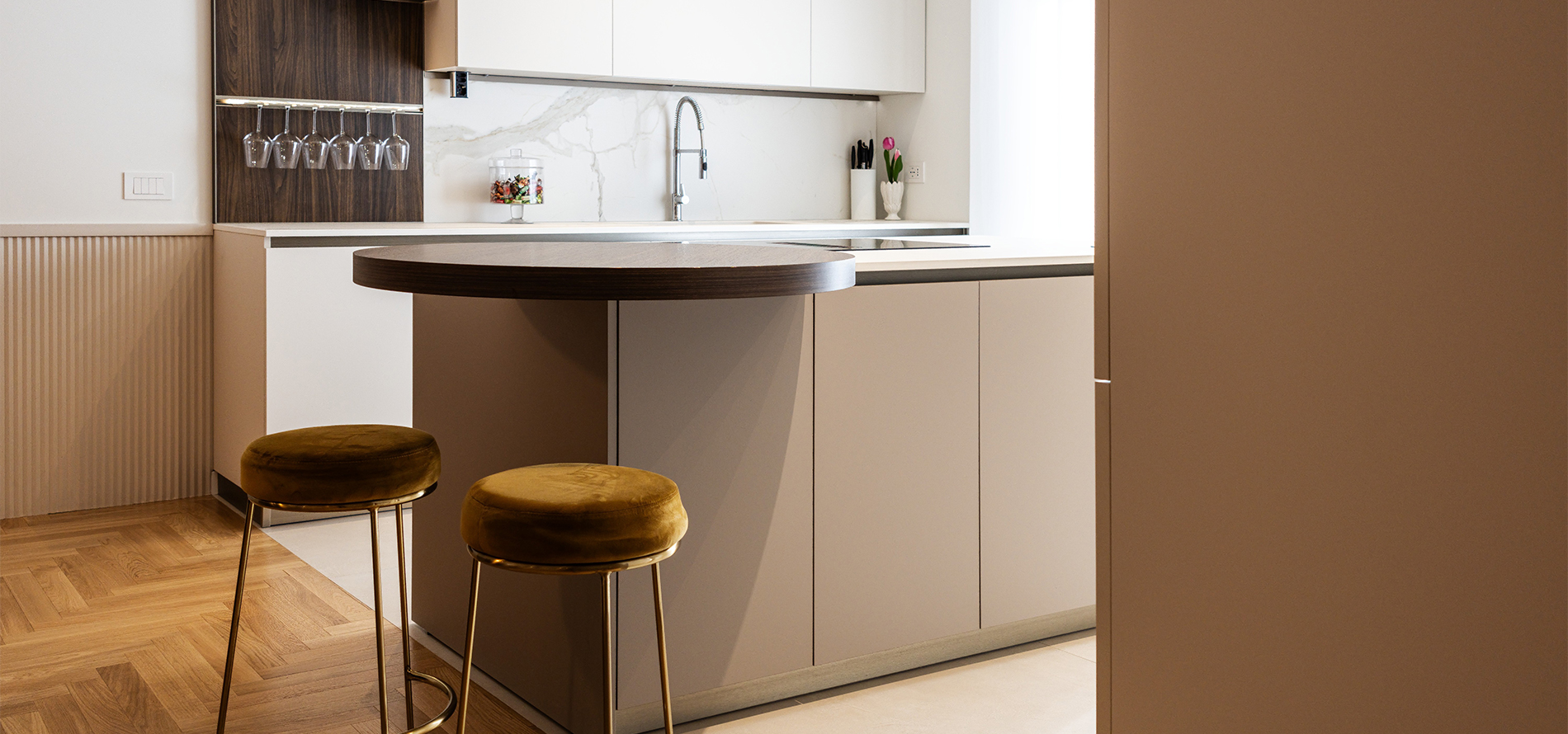 La protagonista è la cucina Lounge di Veneta Cucine, nella finitura laccato soft beige e isola marrone soft, impreziosita da dettagli in noce scuro che aggiungono calore e carattere all’ambiente. Il piano di lavoro in ceramica Caranto finitura Calacatta Naturale dona luminosità e un tocco di eleganza naturale, unendo resistenza e raffinatezza.