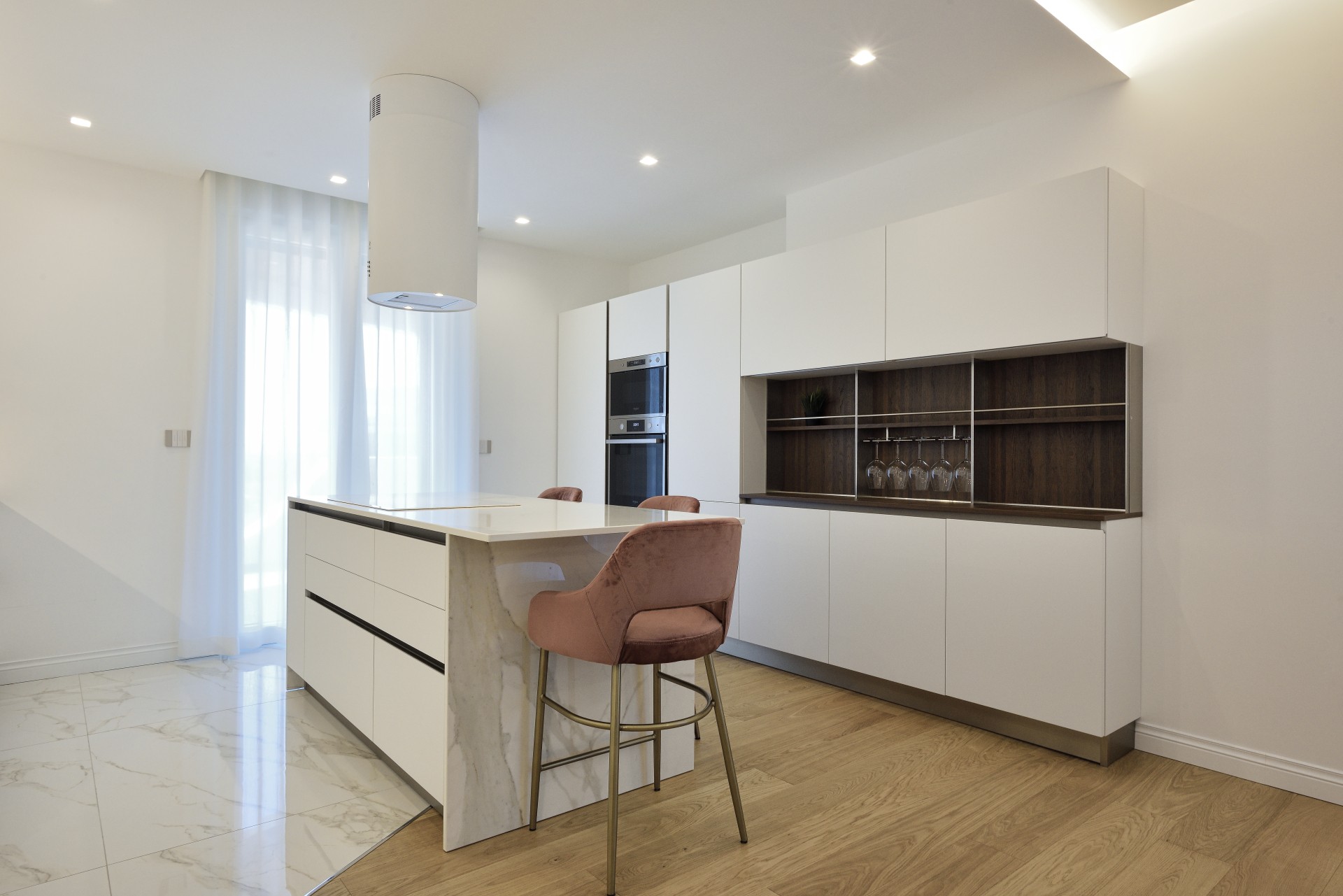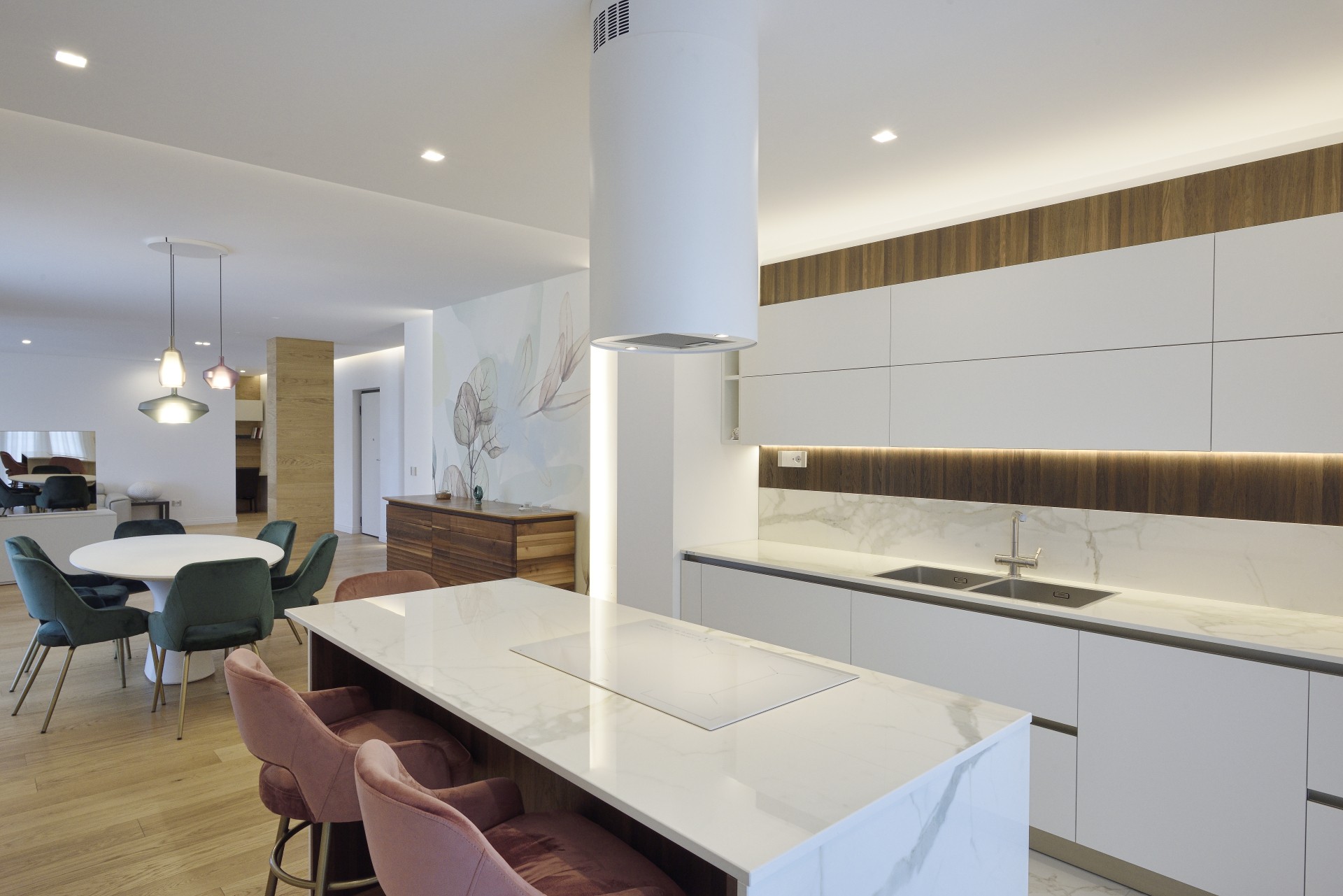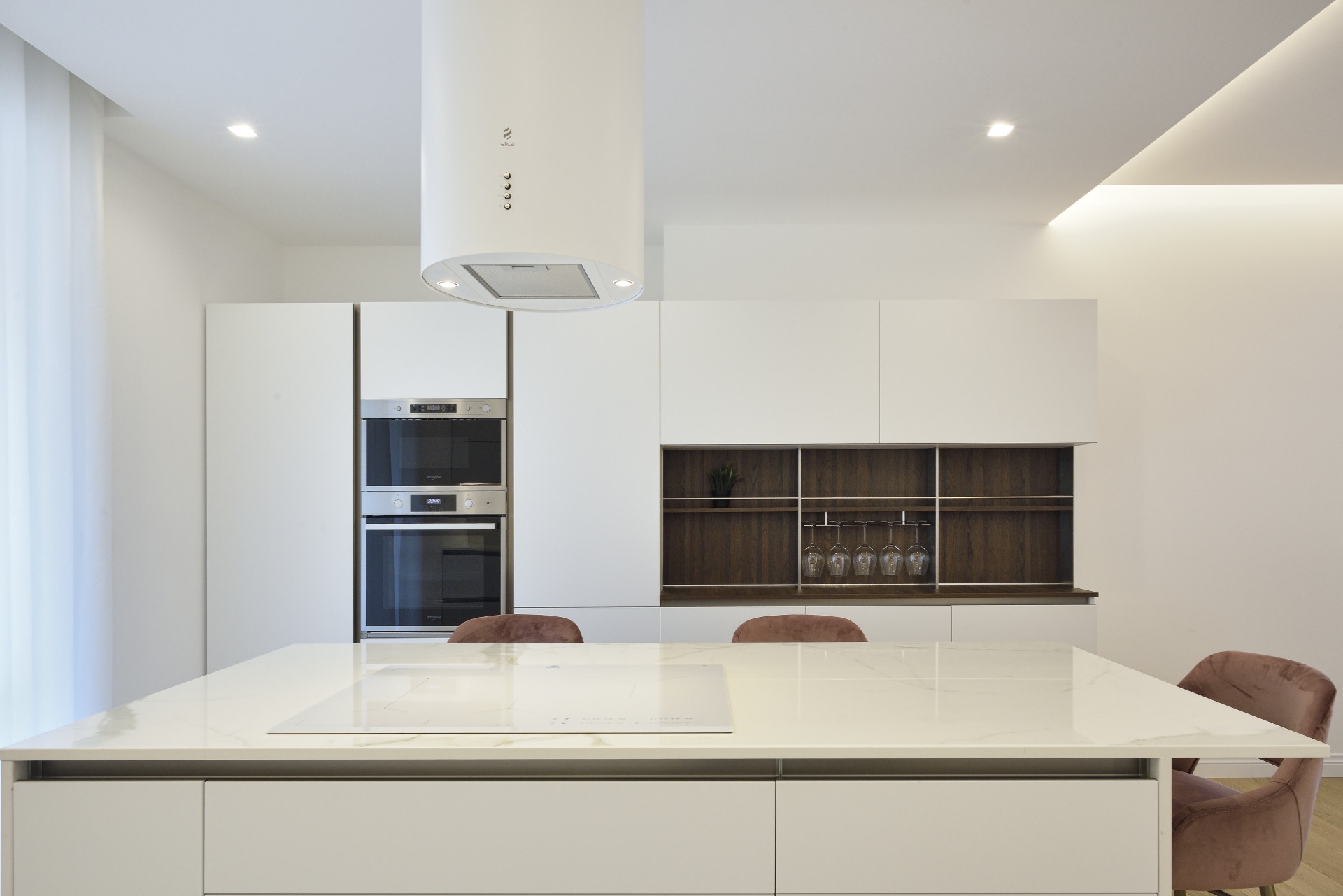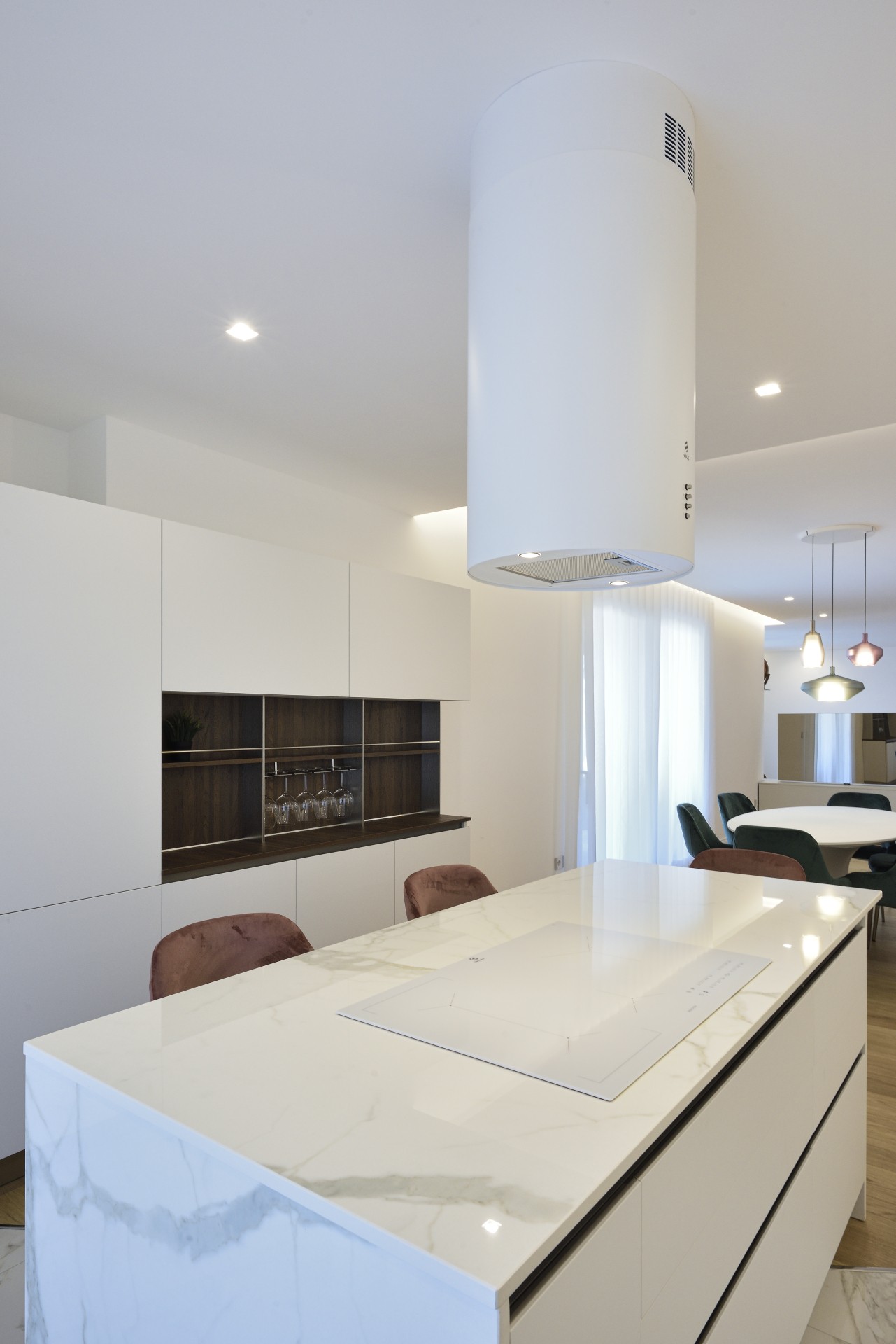 A completare la zona cucina vi è un’isola con piano cottura ad induzione e piano snack sporgente.