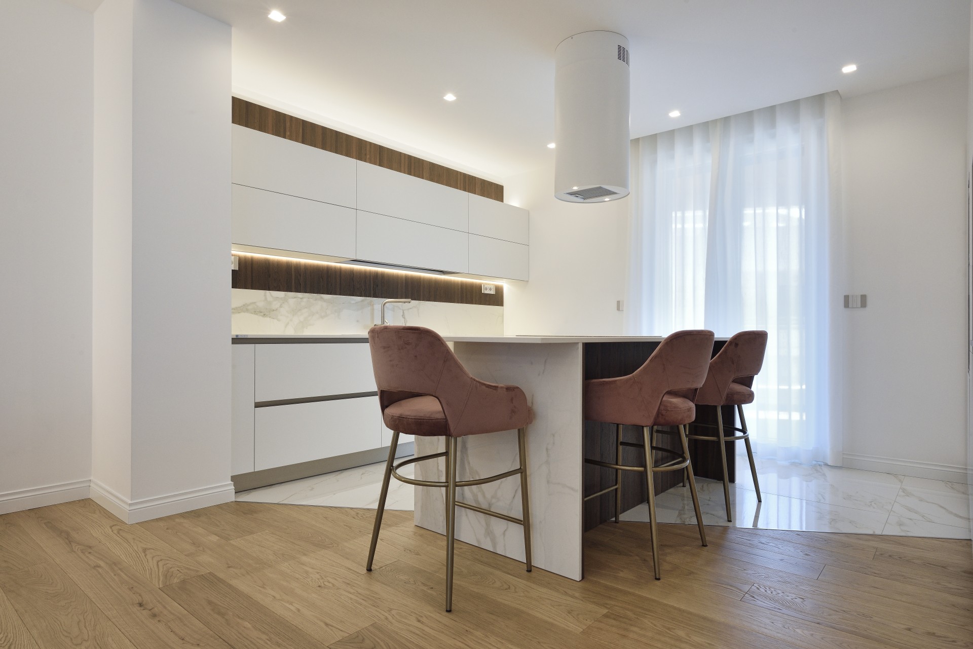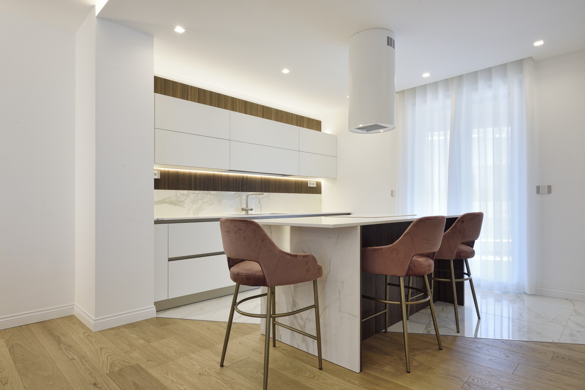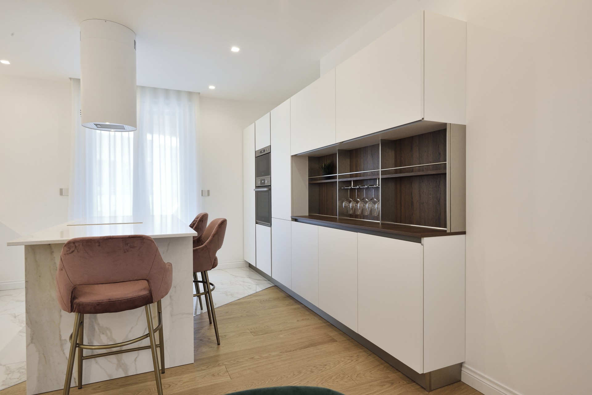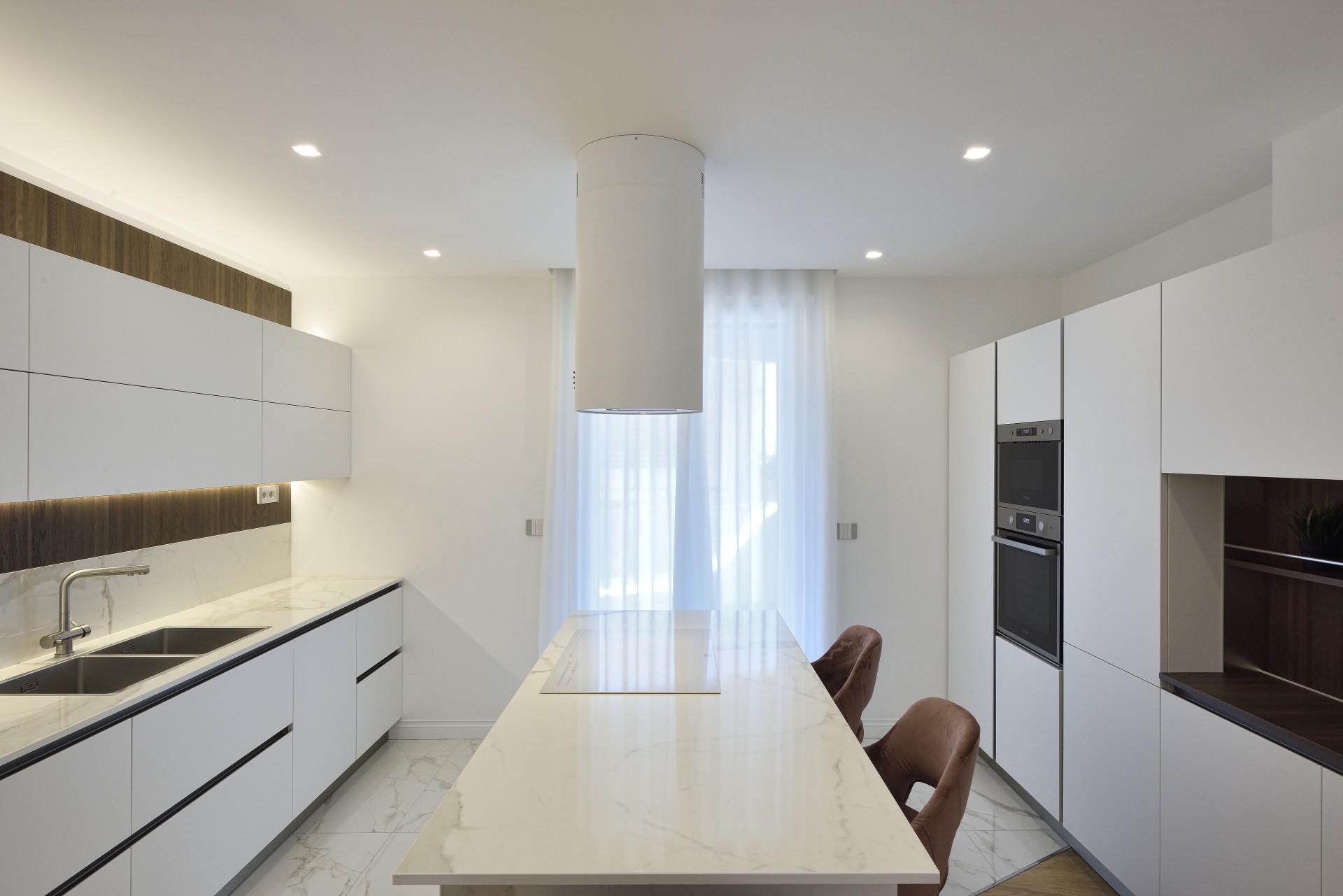 A completare la zona cucina vi è un’isola con piano cottura ad induzione e piano snack sporgente.