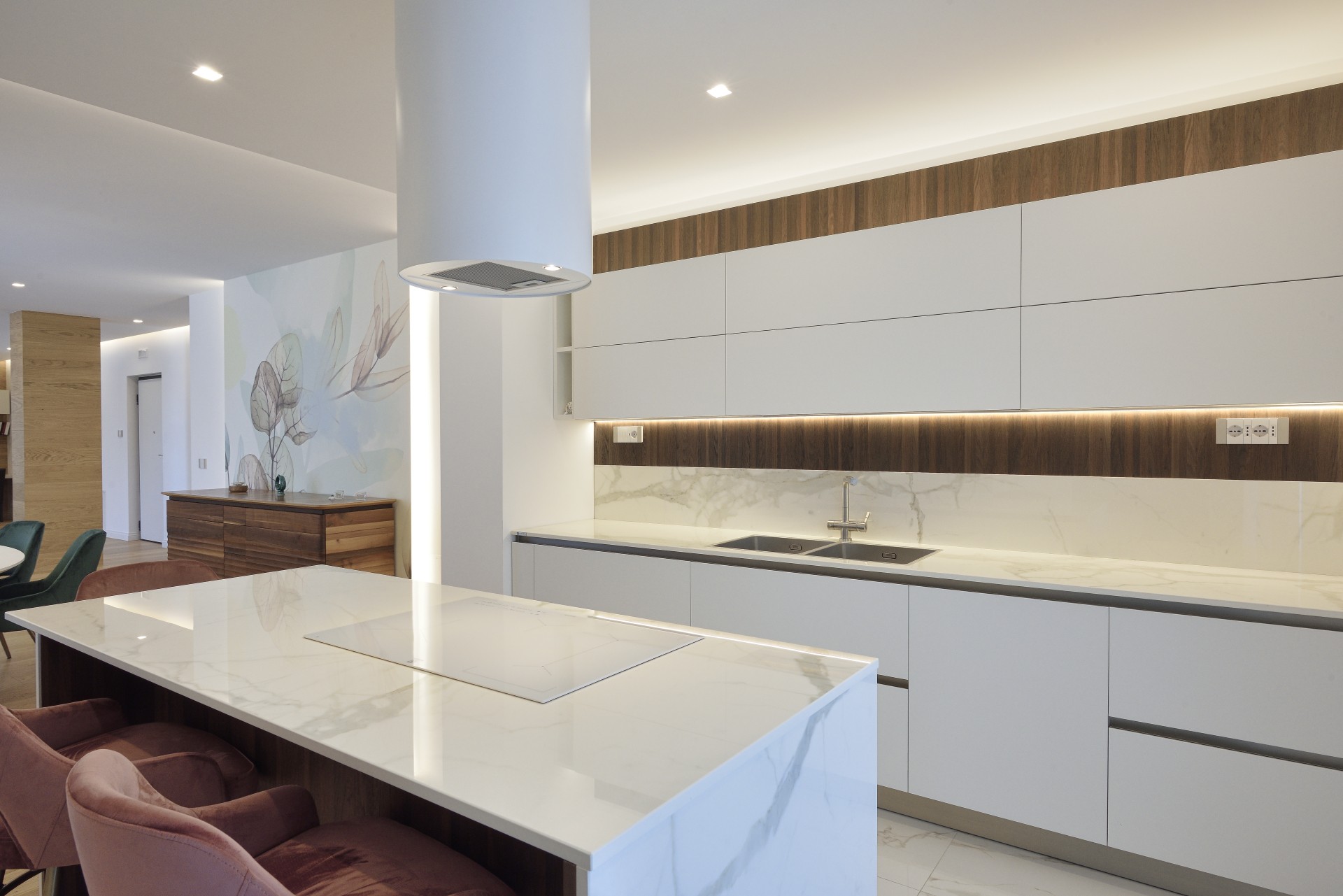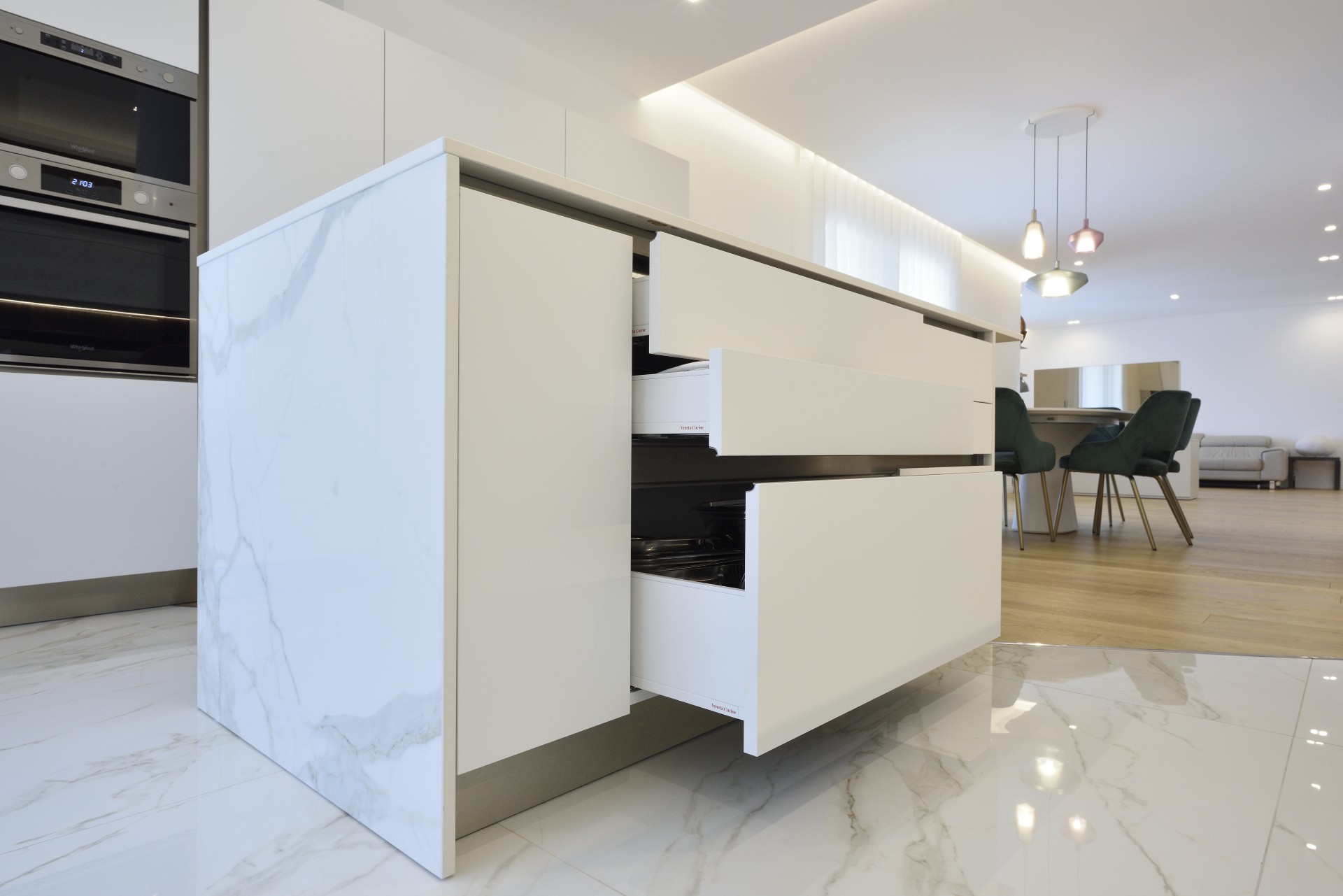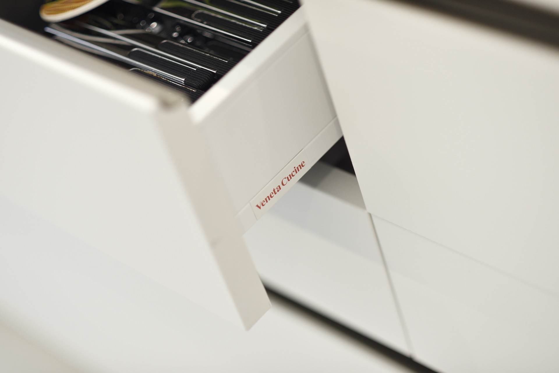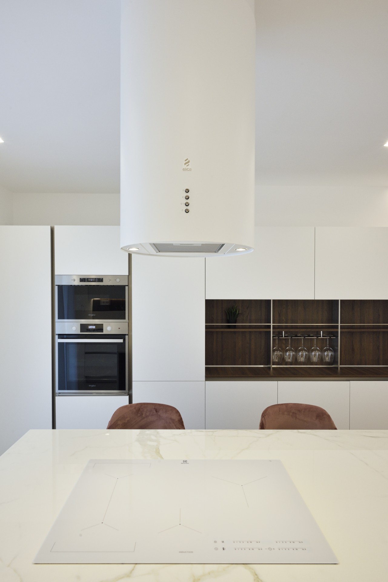 Le caratteristiche di OysterPro firmata VenetaCucine nella colorazione Silk Bianco Neve, coordinata di tutti gli elettrodomestici di ultima generazione Whirlpool, il tutto in perfetto abbinamento al piano lavoro Caranto in ceramica Golden Calacatta, ed allo schienale nella stesa finitura accoppiato all’Impiallacciato Rovere Botte, dove sono ospitate le prese elettriche di servizio.