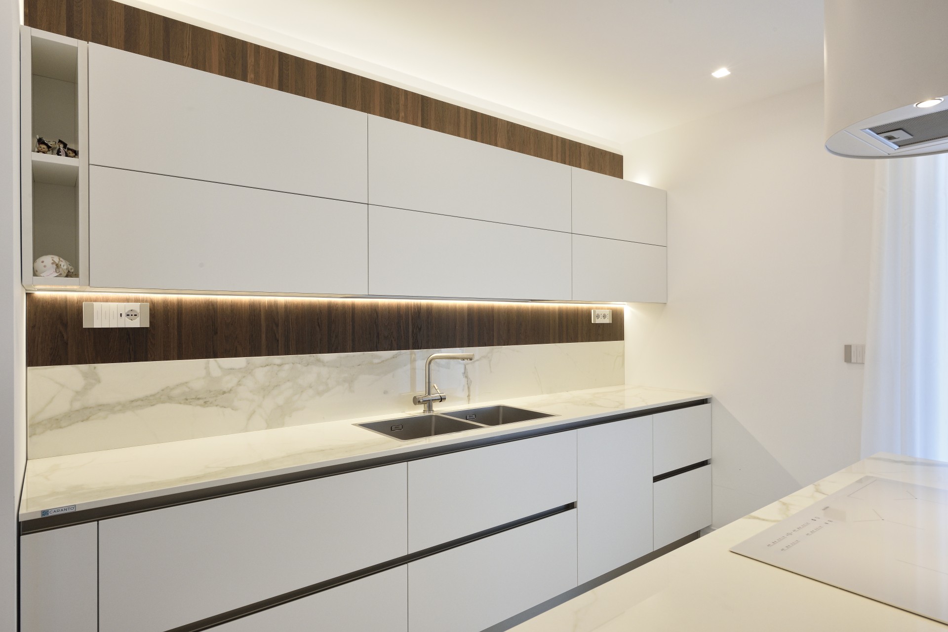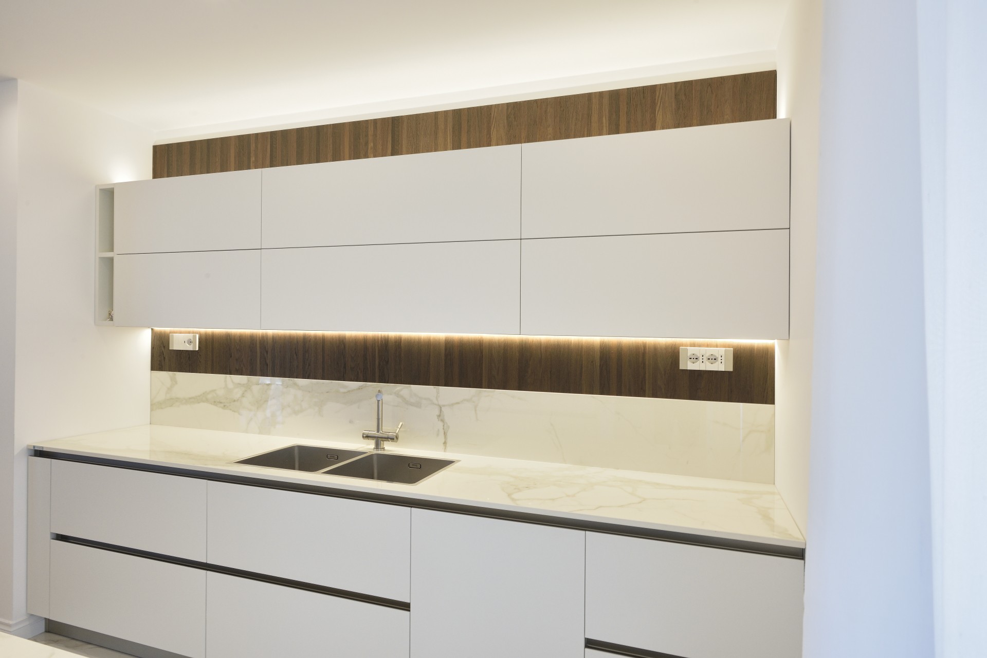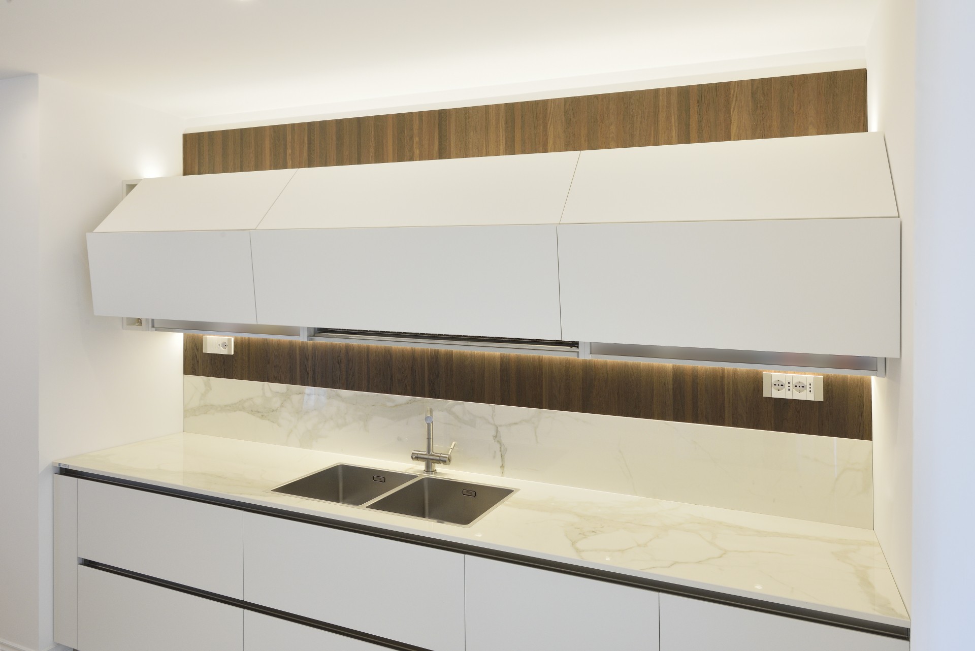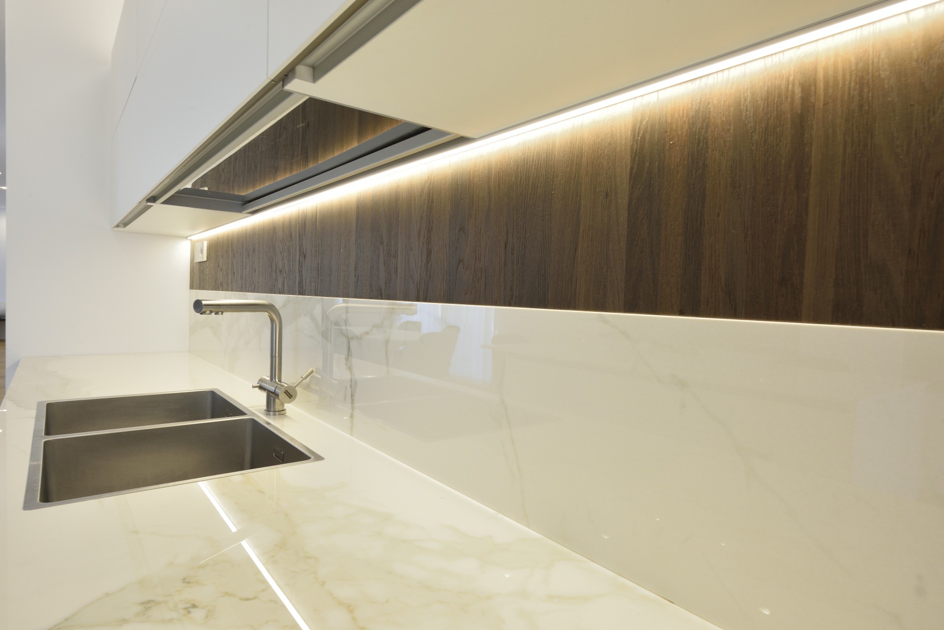 Le caratteristiche di OysterPro firmata VenetaCucine nella colorazione Silk Bianco Neve, coordinata di tutti gli elettrodomestici di ultima generazione Whirlpool, il tutto in perfetto abbinamento al piano lavoro Caranto in ceramica Golden Calacatta, ed allo schienale nella stesa finitura accoppiato all’Impiallacciato Rovere Botte, dove sono ospitate le prese elettriche di servizio.