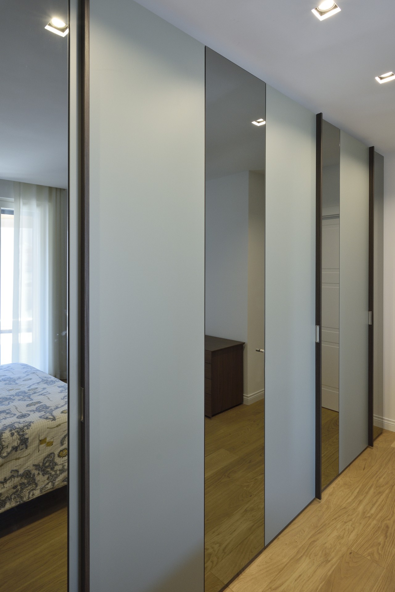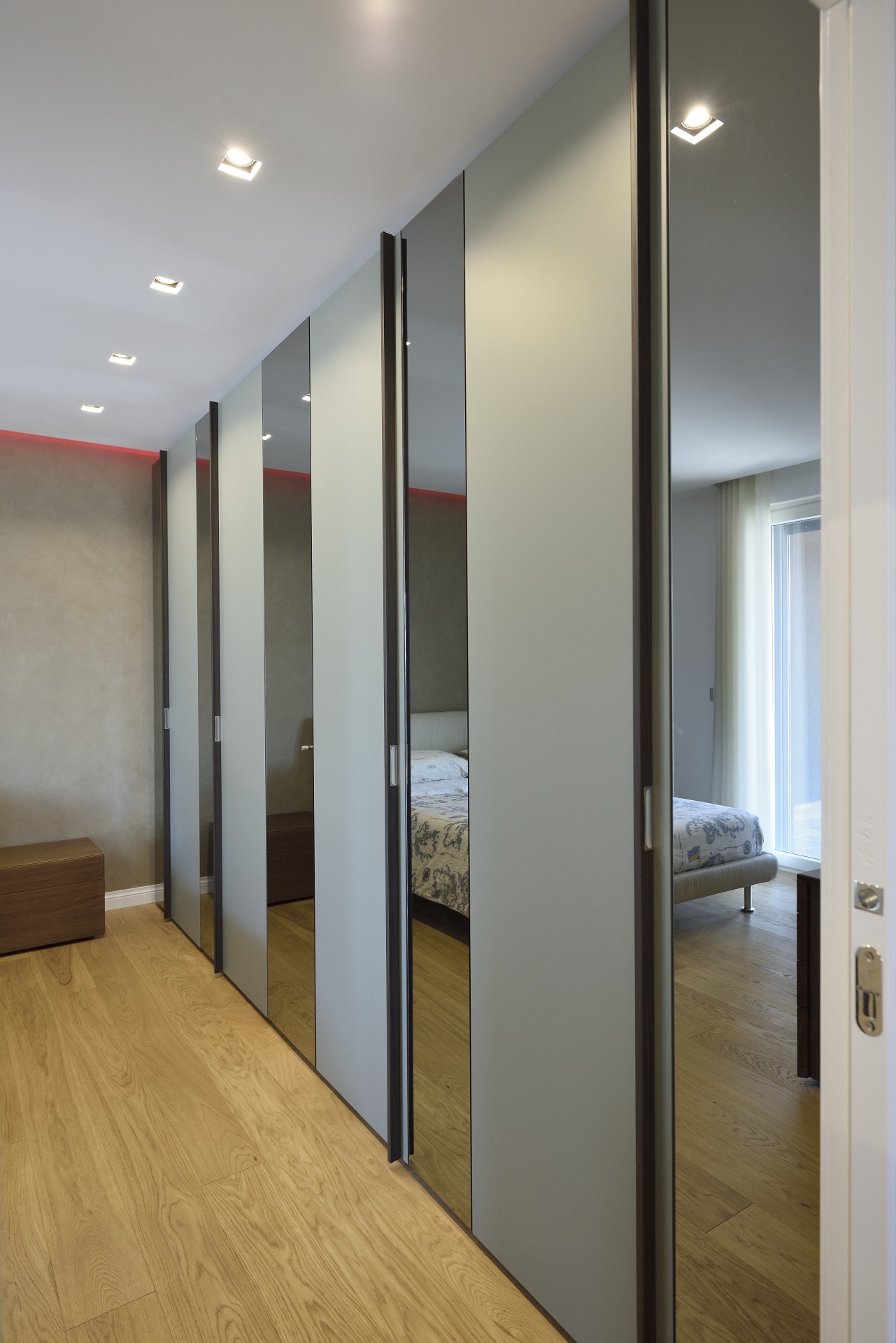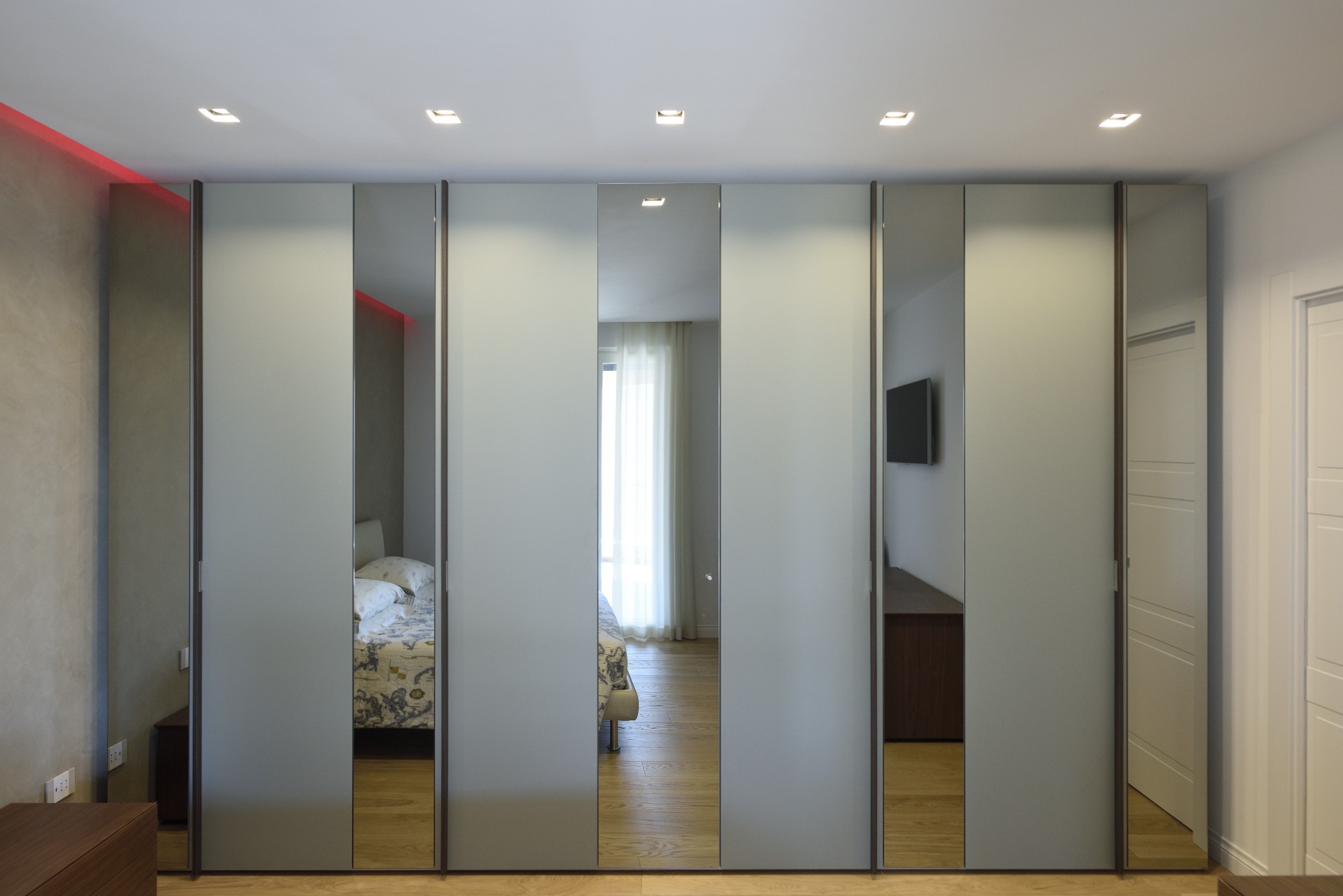 L’armadio della camera realizzato su misura della collezione La Casa Moderna, resta elegante e leggero senza opprime la zona notte grazie al taglio asimmetrico delle ante ed all’inserimento degli specchi verticali.