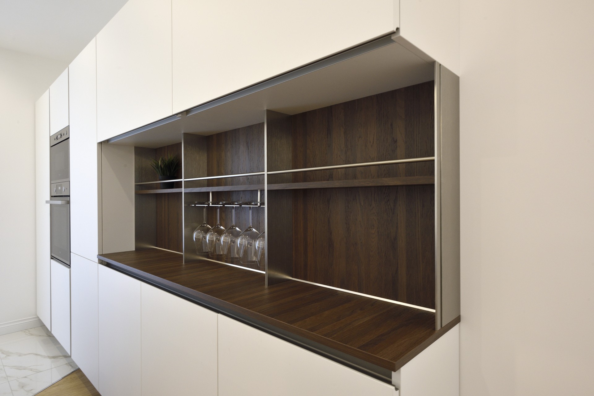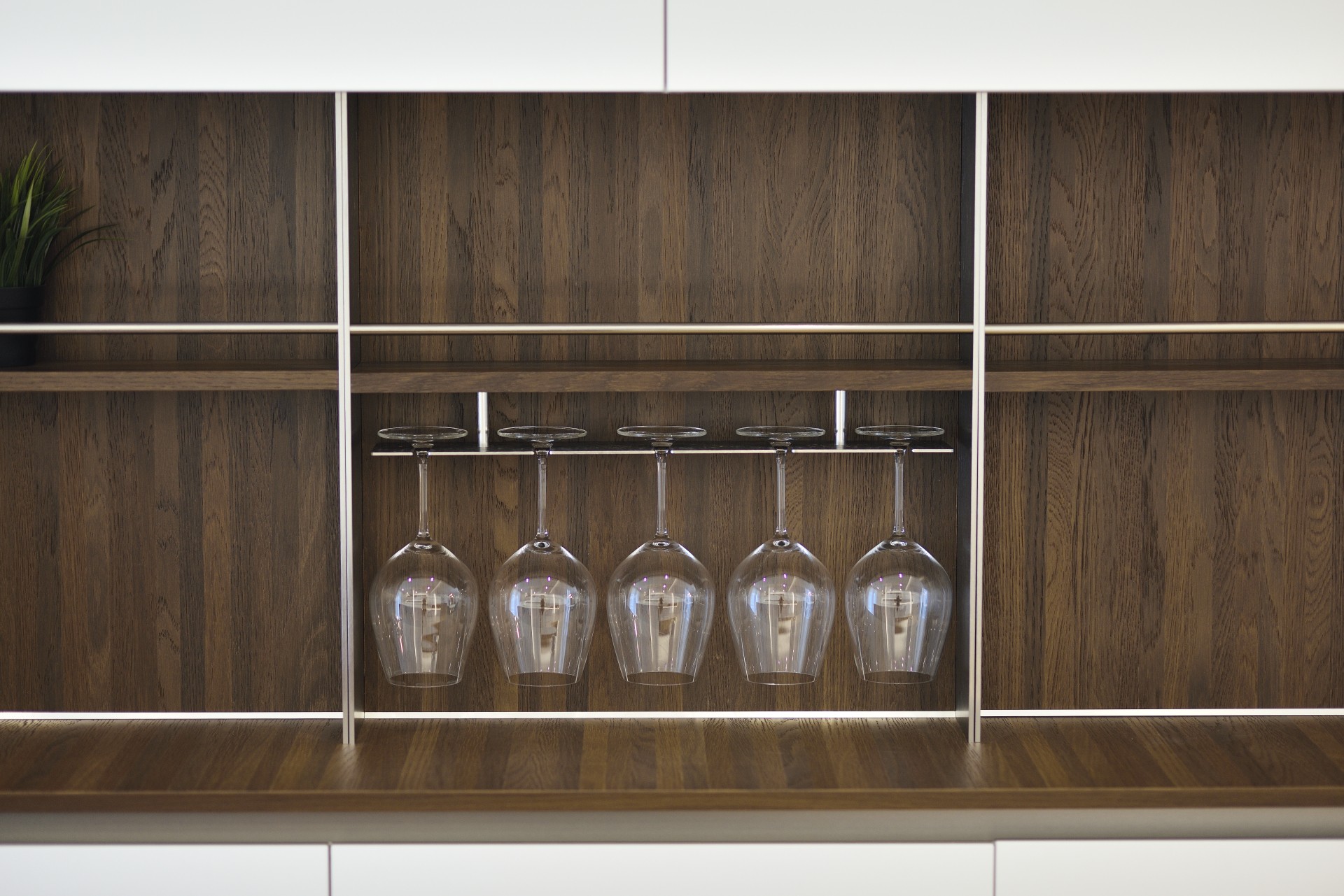 La zona dispensa, invece è caratterizzata dagli elementi Stepsystem sempre in legno Rovere Botte, che offrono la possibilità di inserire diversi accessori, come un comodo porta calici.