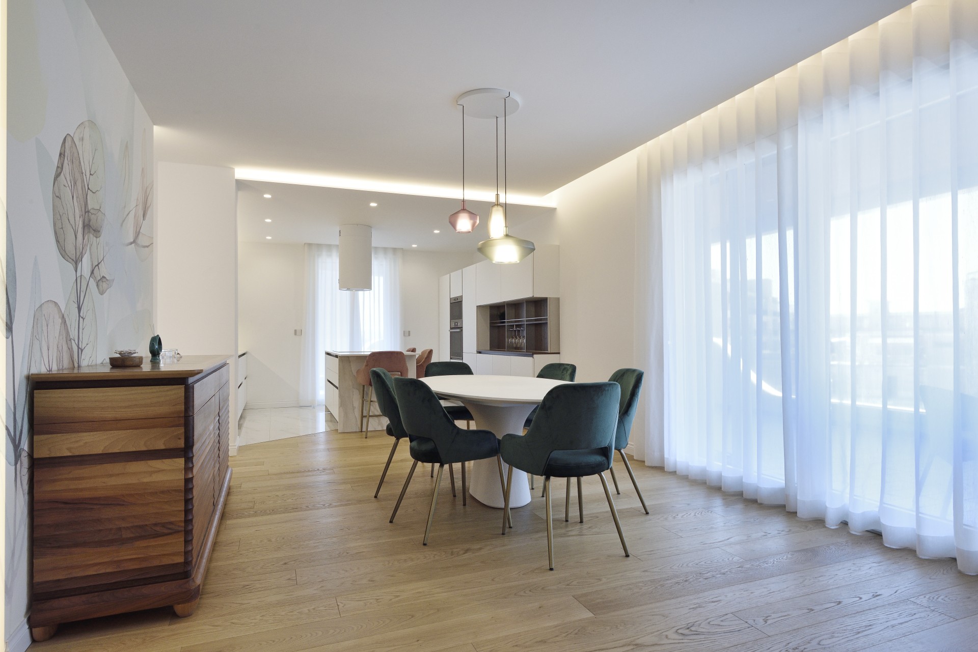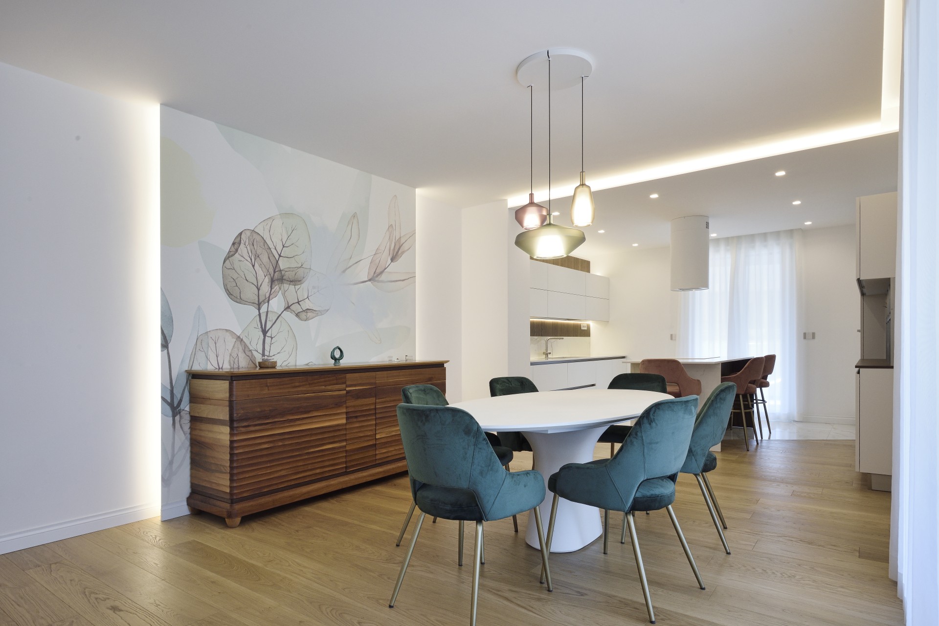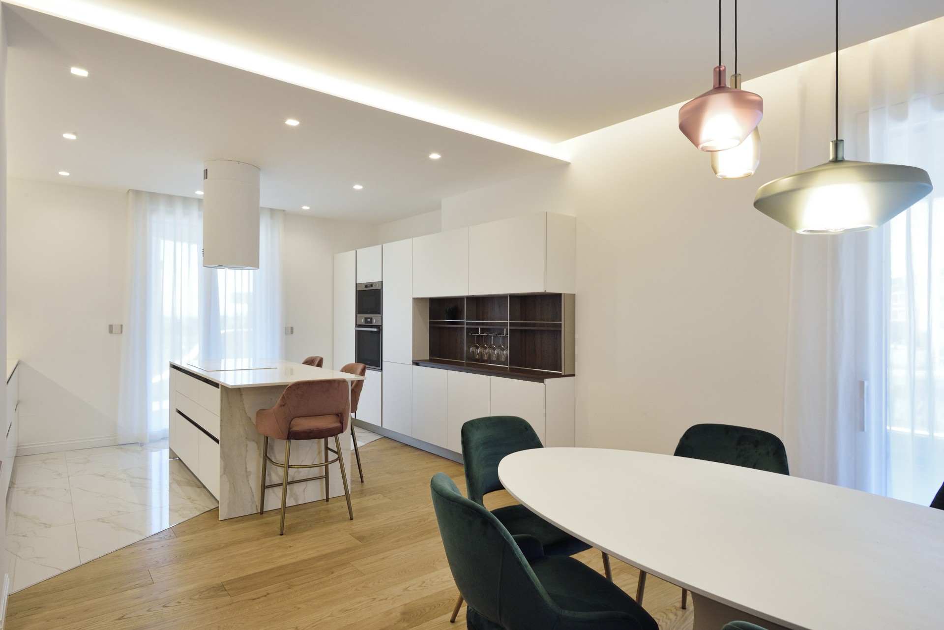 Il tavolo fisso scelto è il Podium di Bontempi Casa con piano ellittico da ben 200 cm in finitura bianco opaco che crea un dolce contrasto con il rovere del pavimento, ma soprattutto non mettere in secondo piano un antico credenzone sapientemente recuperato.