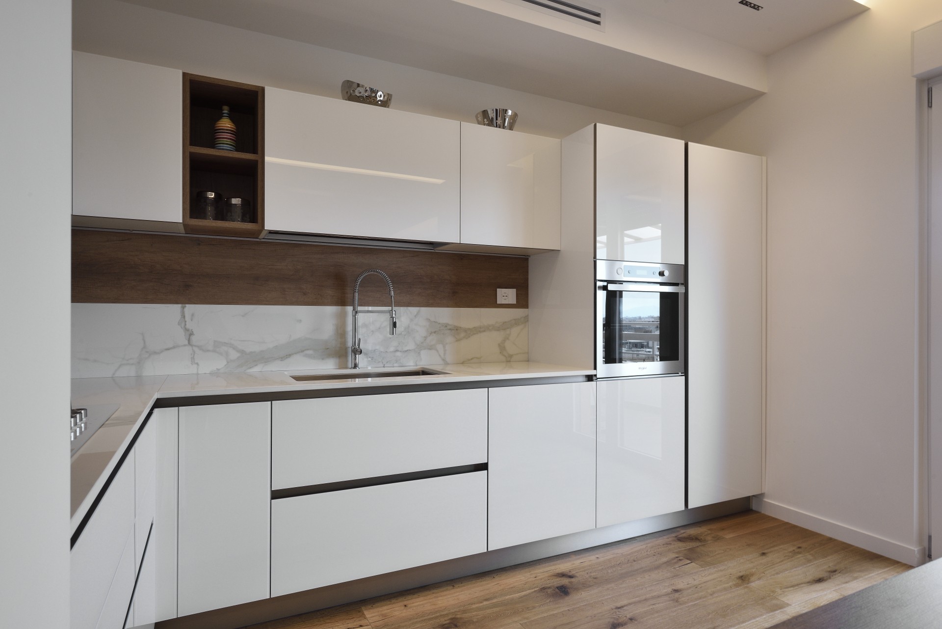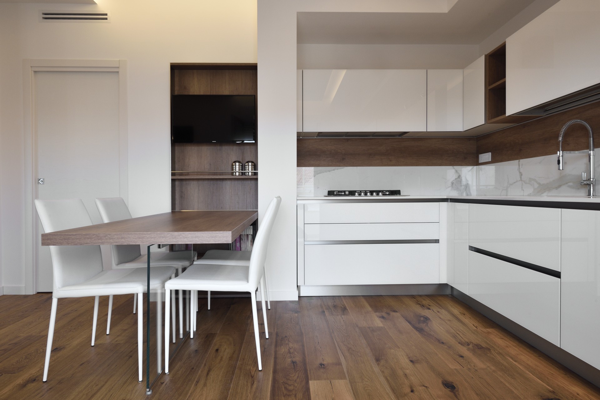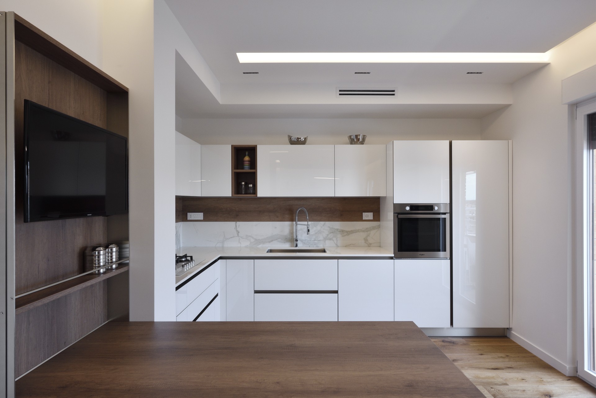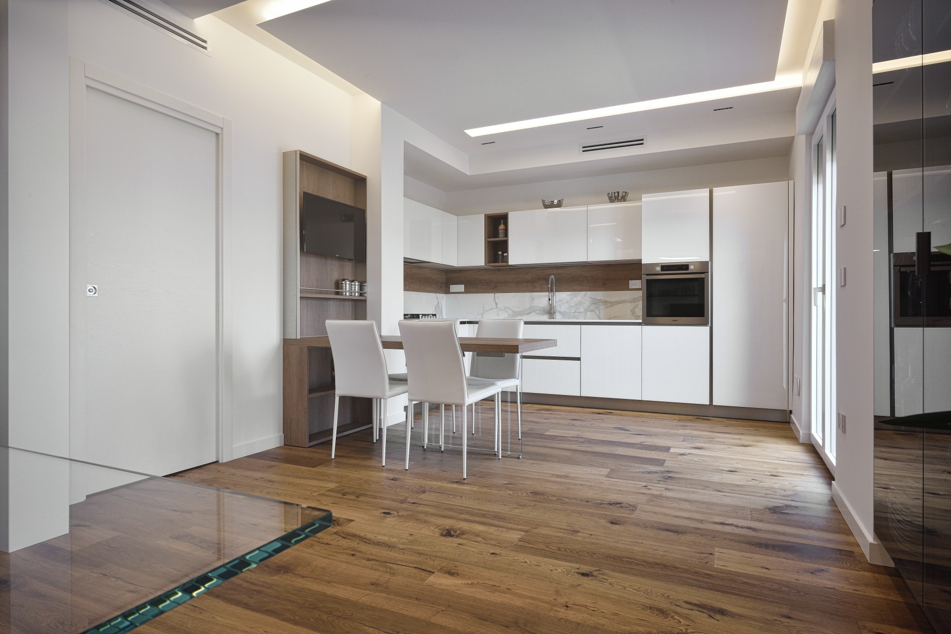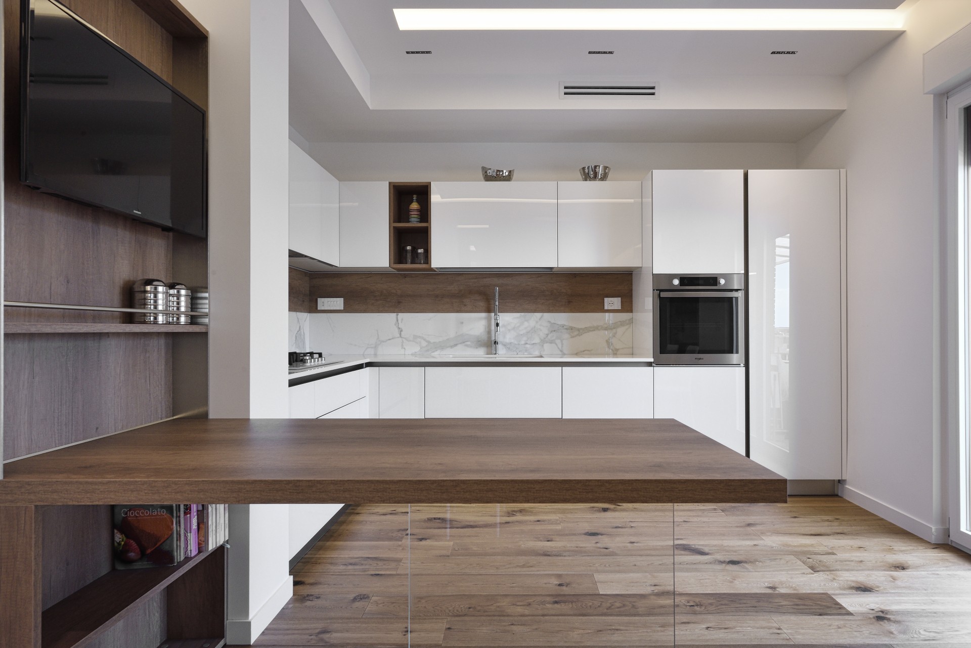 In questa realizzazione, in collaborazione tra in nostro staff di consulenti d'arredo e l'Architetto Francesco Clori e lo staff di ARCHILAB architettura & design, ha come protagonista il vetro, elemento essenziale della cucina Ri-Flex firmata VenetaCucine, nella versione Bianco Puro Lucido in coordinato al calore della finitura legno decorativa Leccio Cognac.