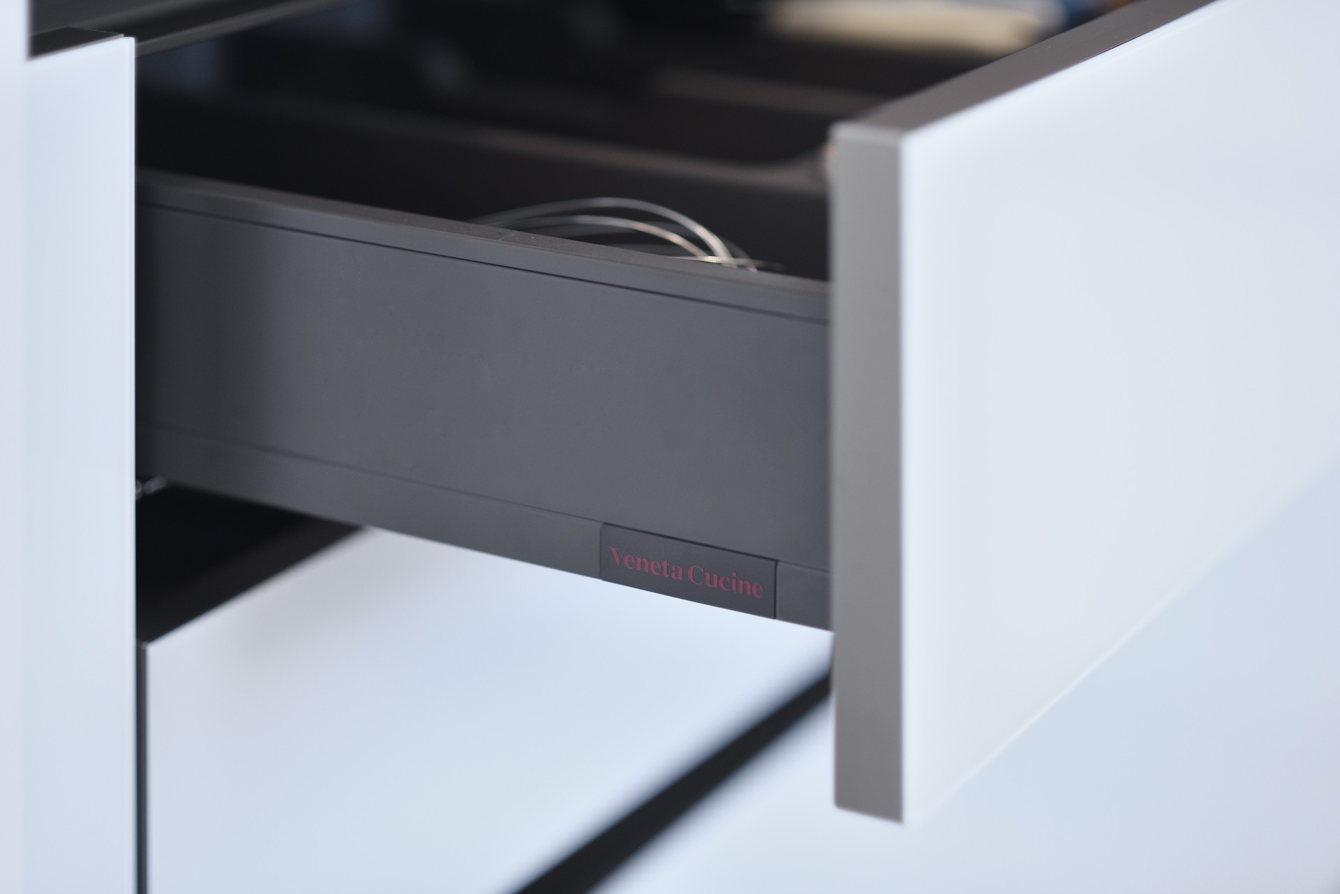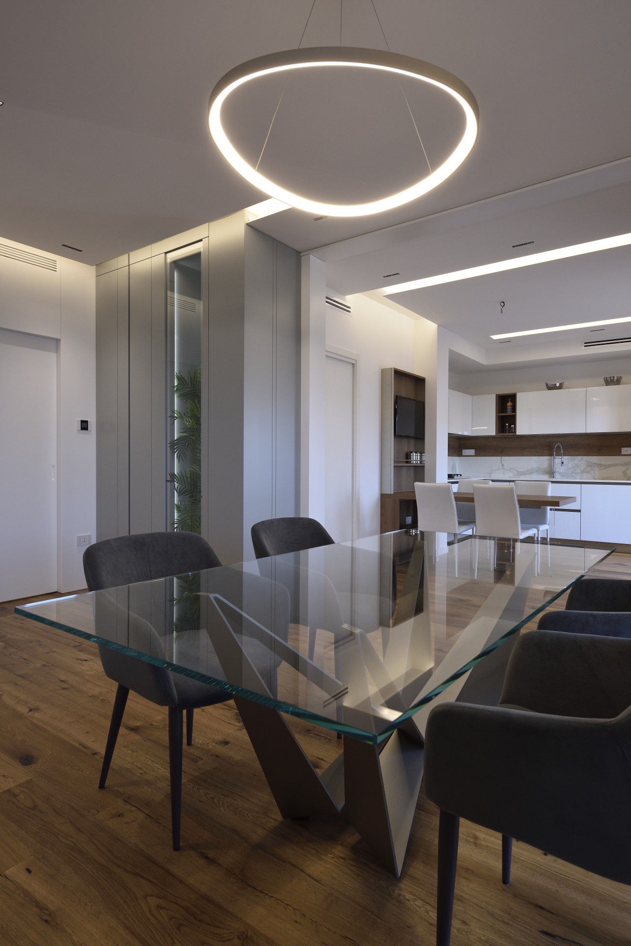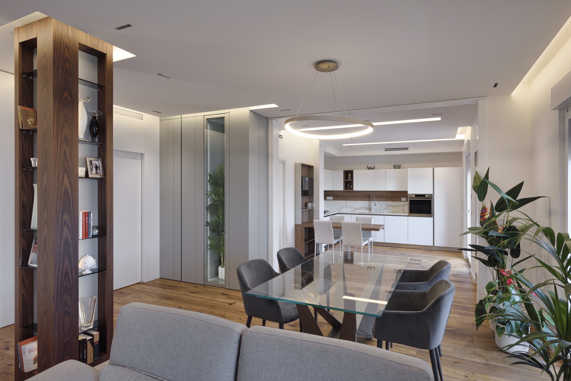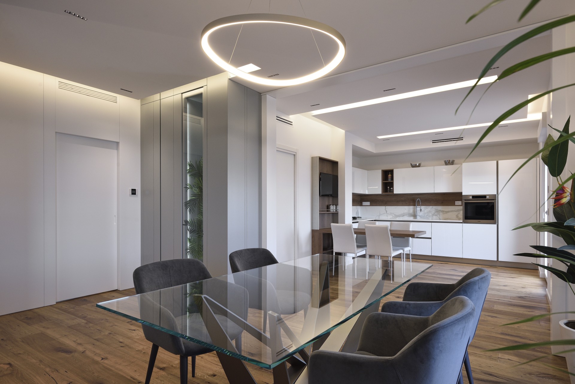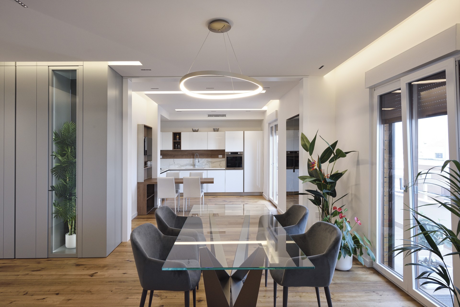 In questa realizzazione, in collaborazione tra in nostro staff di consulenti d'arredo e l'Architetto Francesco Clori e lo staff di ARCHILAB architettura & design, ha come protagonista il vetro, elemento essenziale della cucina Ri-Flex firmata VenetaCucine, nella versione Bianco Puro Lucido in coordinato al calore della finitura legno decorativa Leccio Cognac.