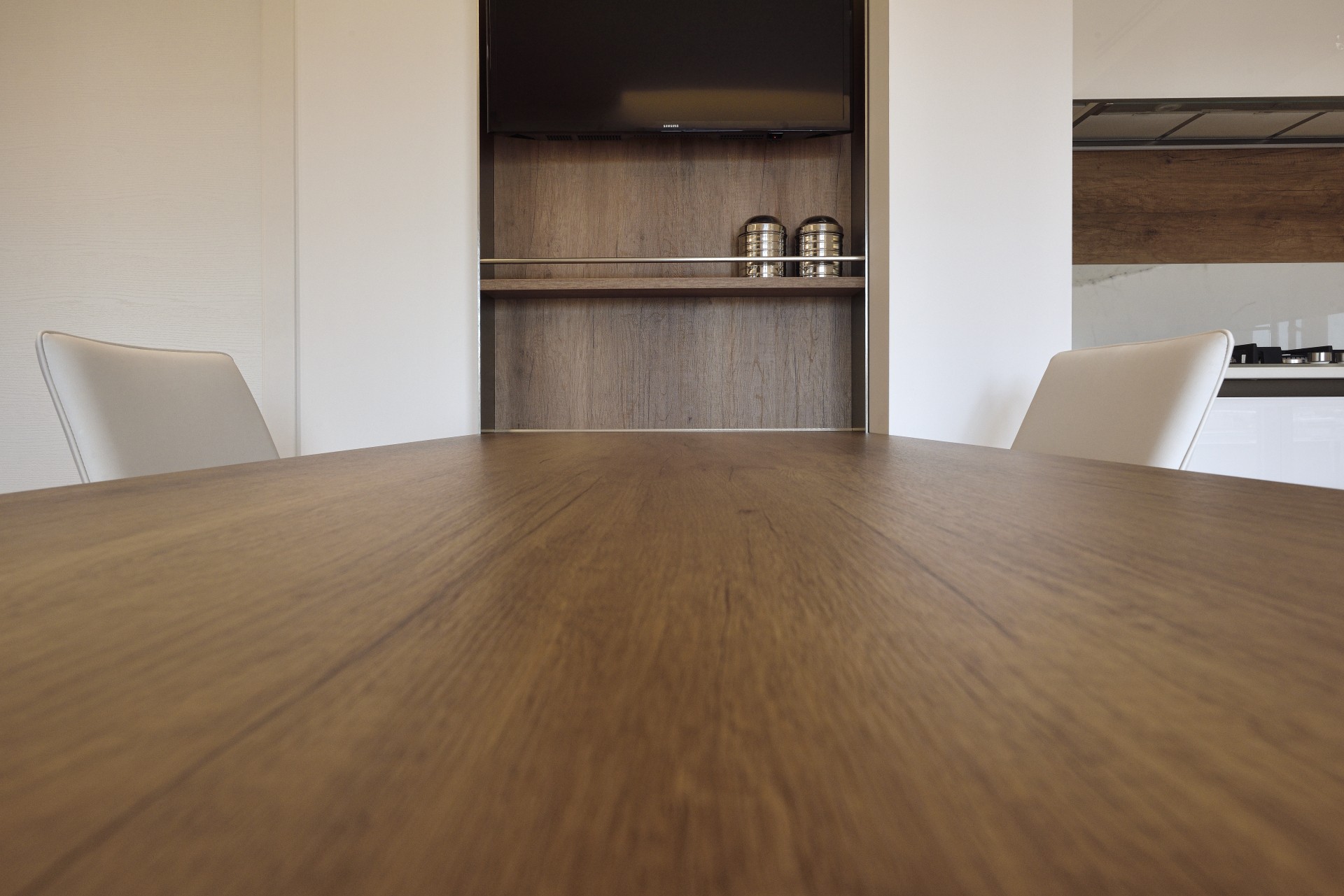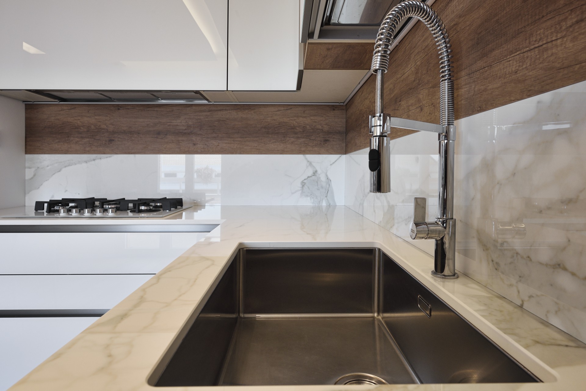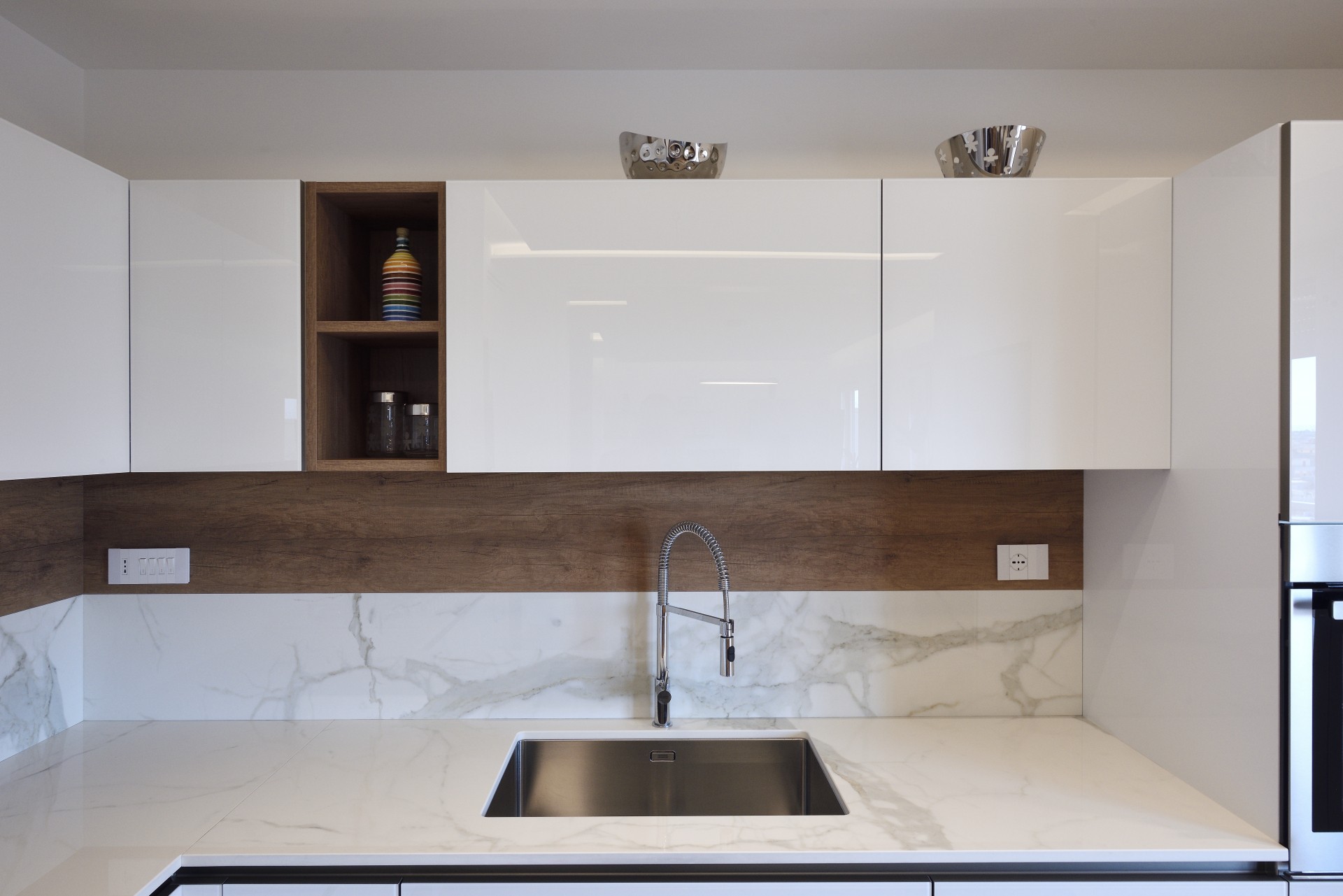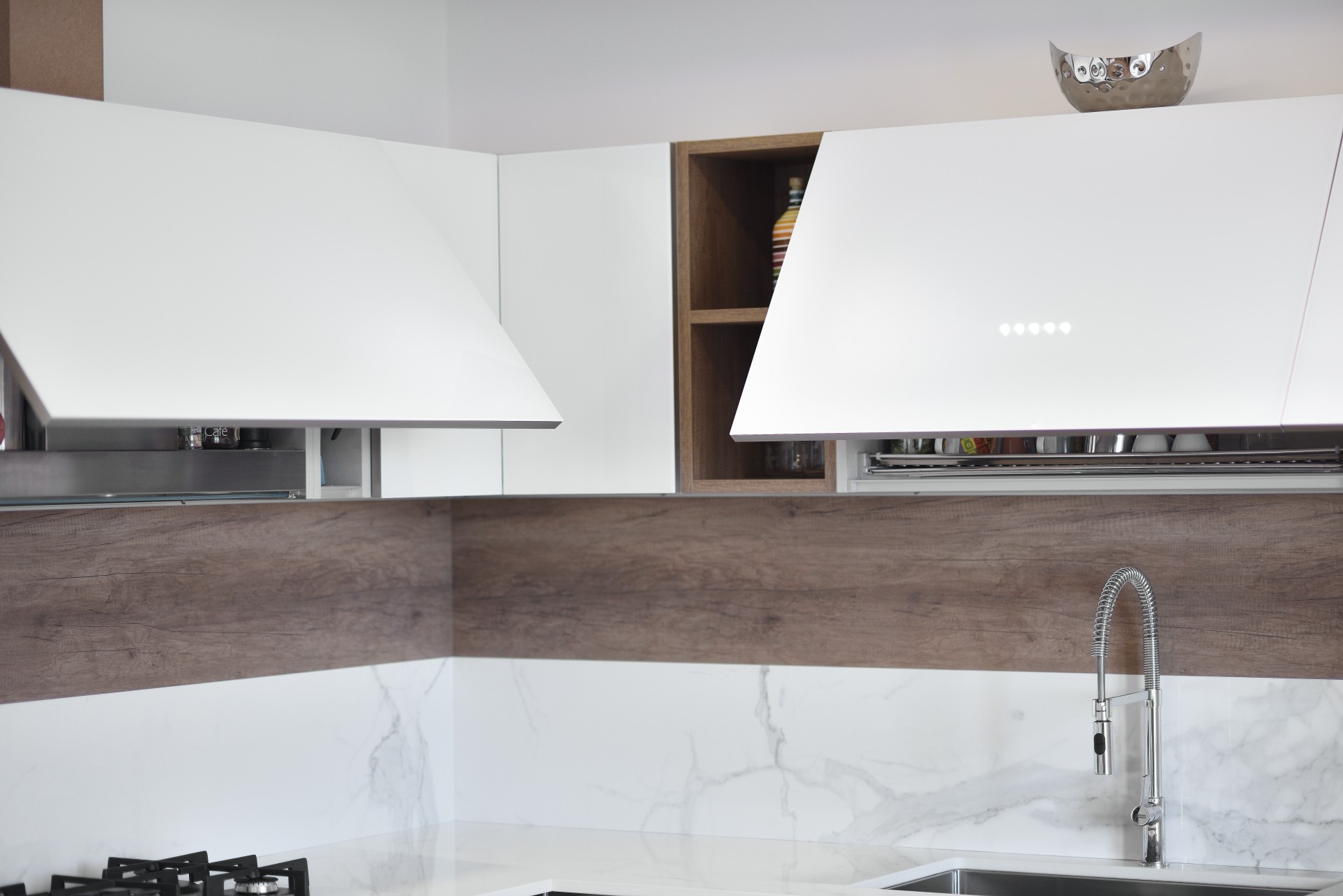 A completare il tutto la finitura del piano di lavoro Caranto realizzato in ceramica KER, igienica sicura e che non rilascia elementi chimici negli alimenti, finitura Calacatta Golden, che sfocia nello schienale para schizzi realizzato per l’altra metà in legno.
